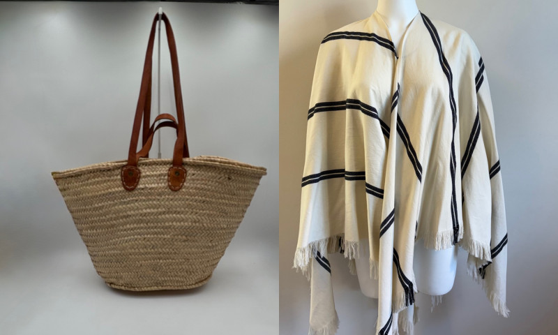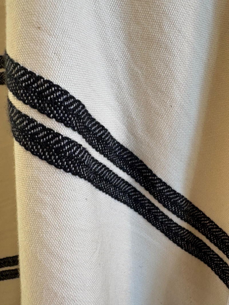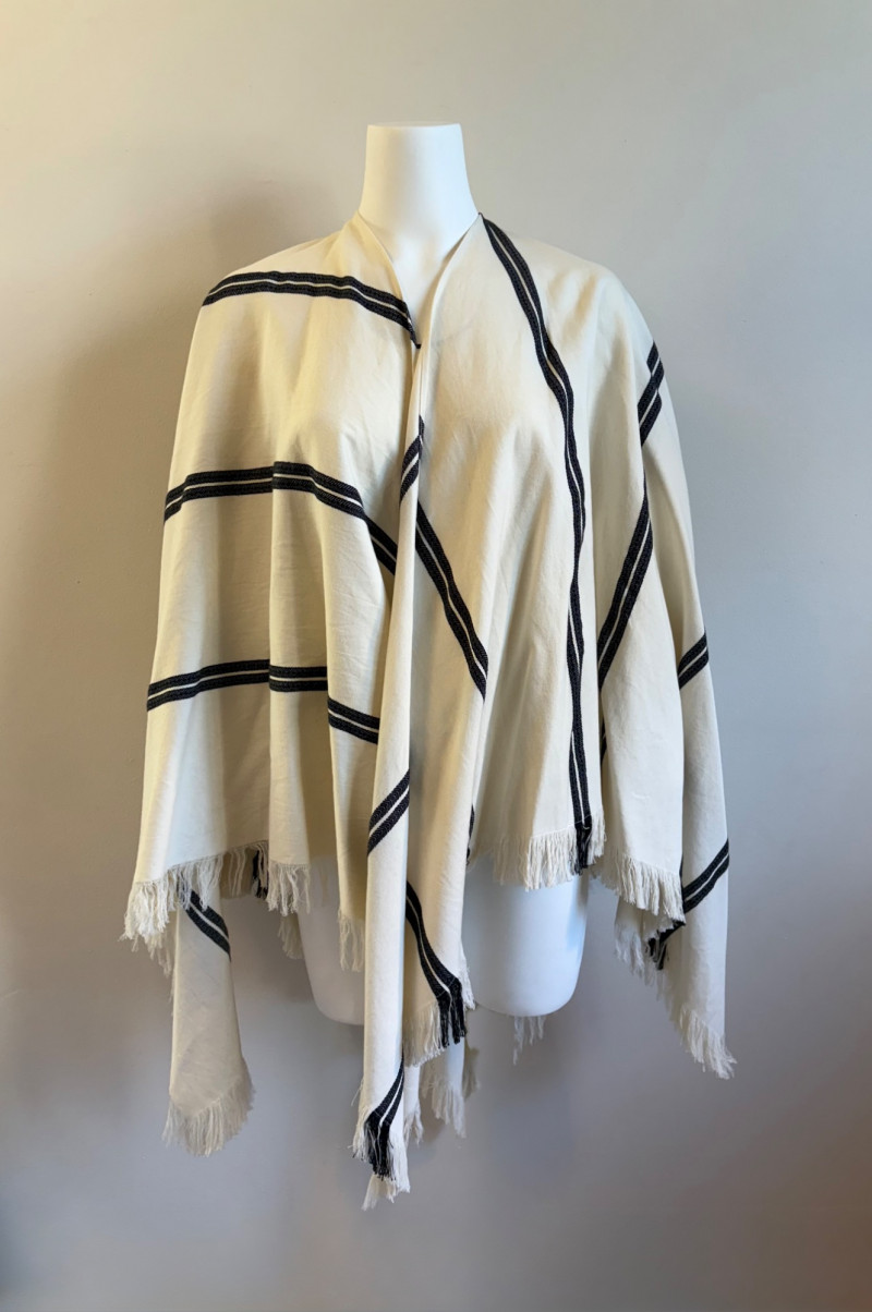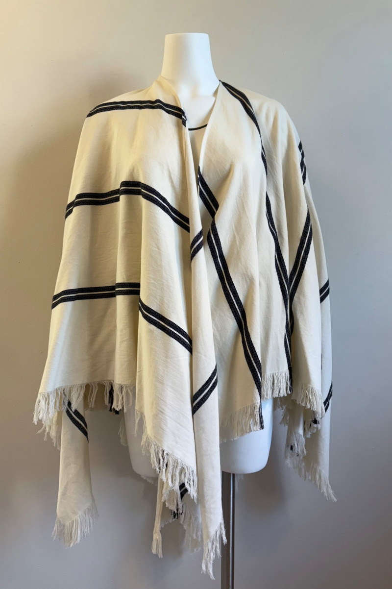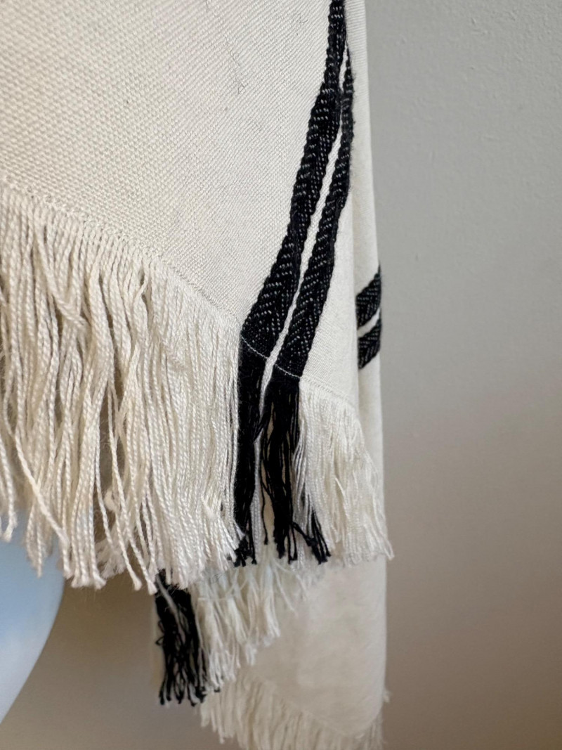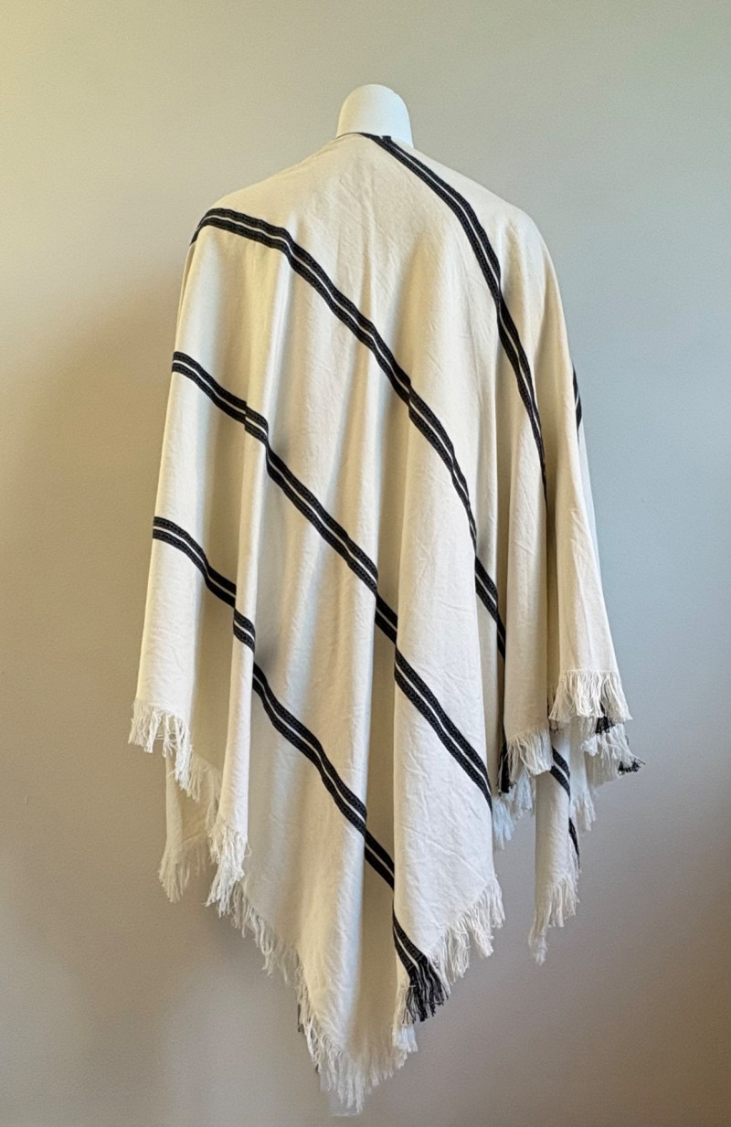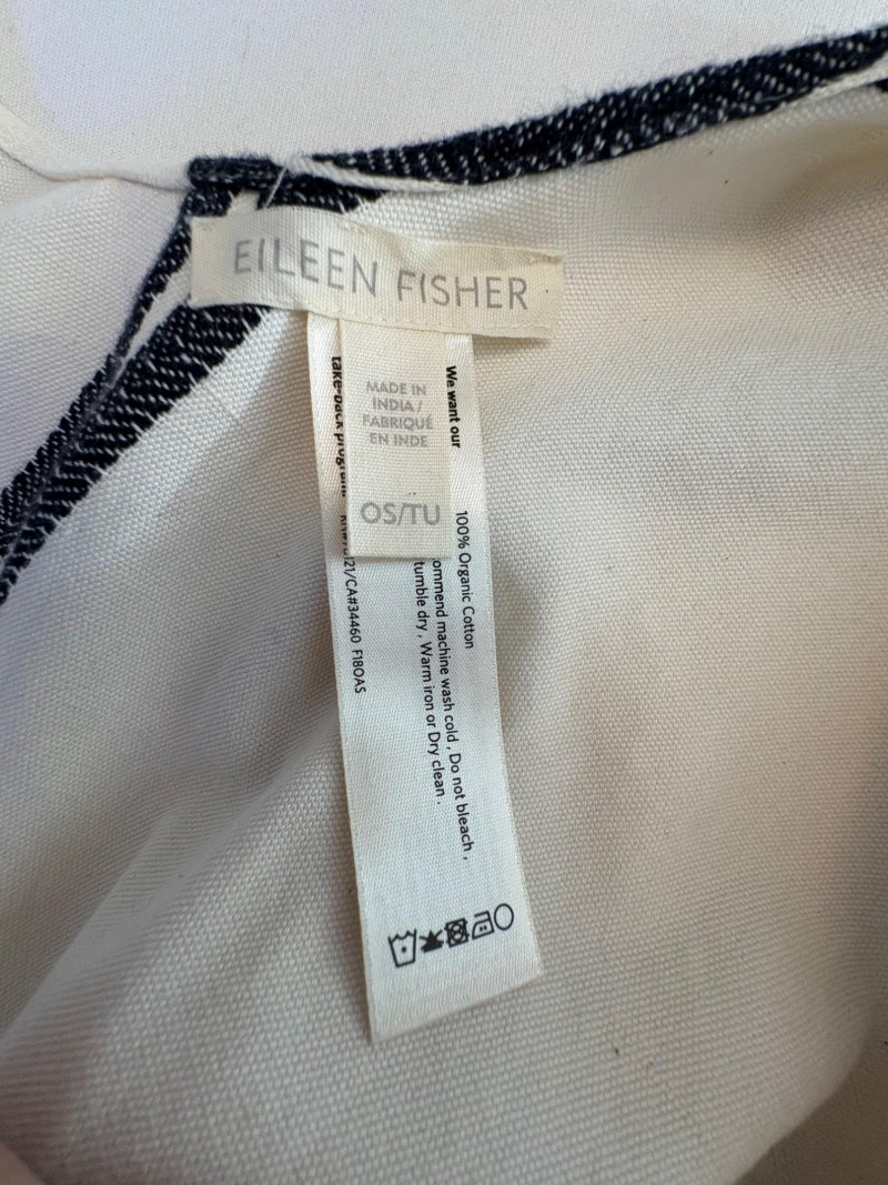 Great beach cover-up poncho from Eileen Fisher & carry tote. Modified poncho from Eileen Fisher in cream woven cotton with black stitched stripes No front closure but lovely fringe along the hems.. 100% organic cotton. Appears to be unused. One size fits all. Large open woven tote with leather straps - shoulder and hand. Flat base & reinforced top. In good condition. No maker mark. Measures 23" across the top with a 12" wide oval base. 13" drop from top of straps to top center of bag.