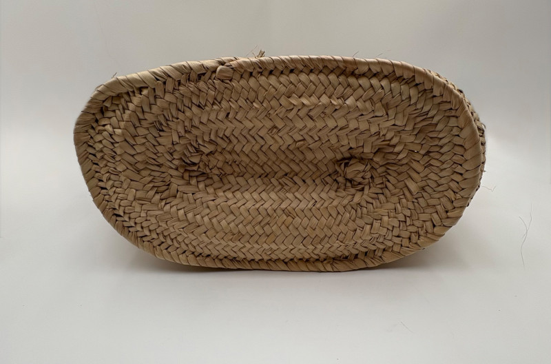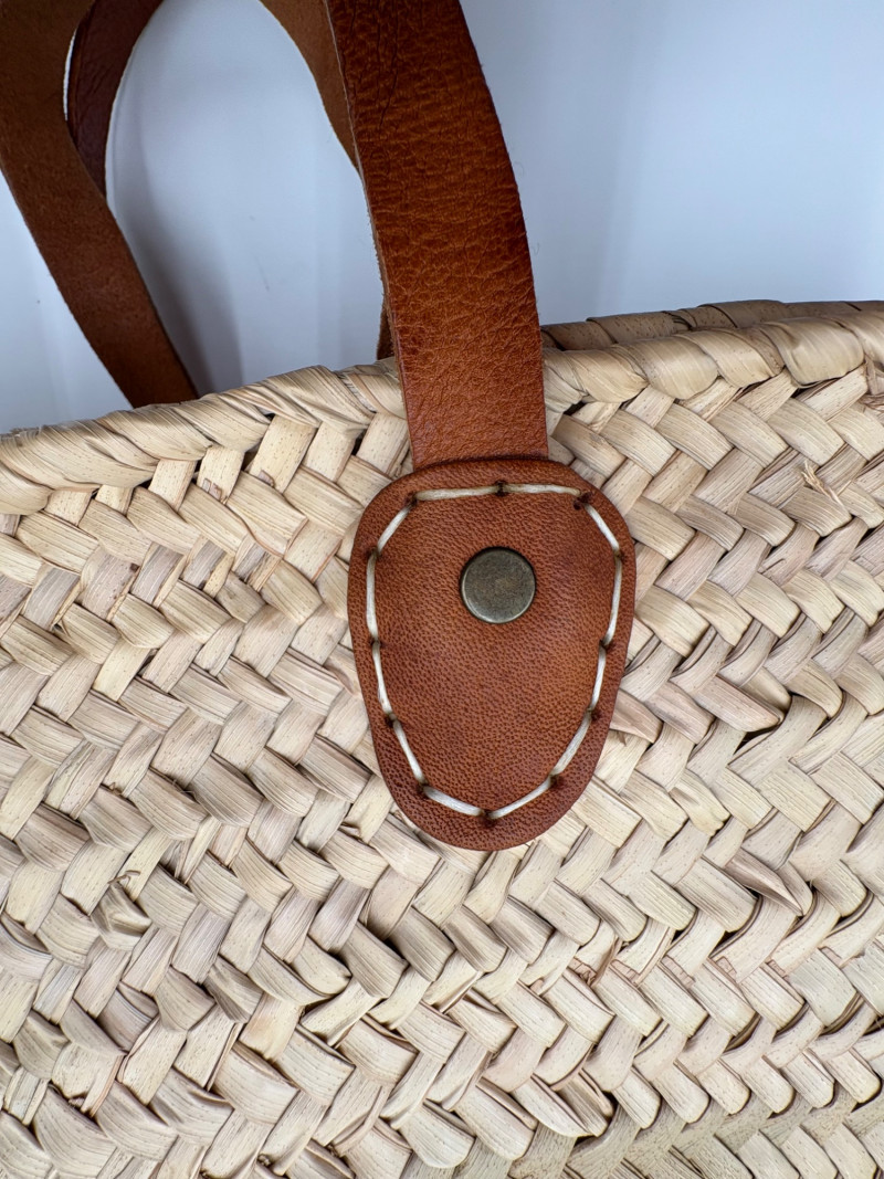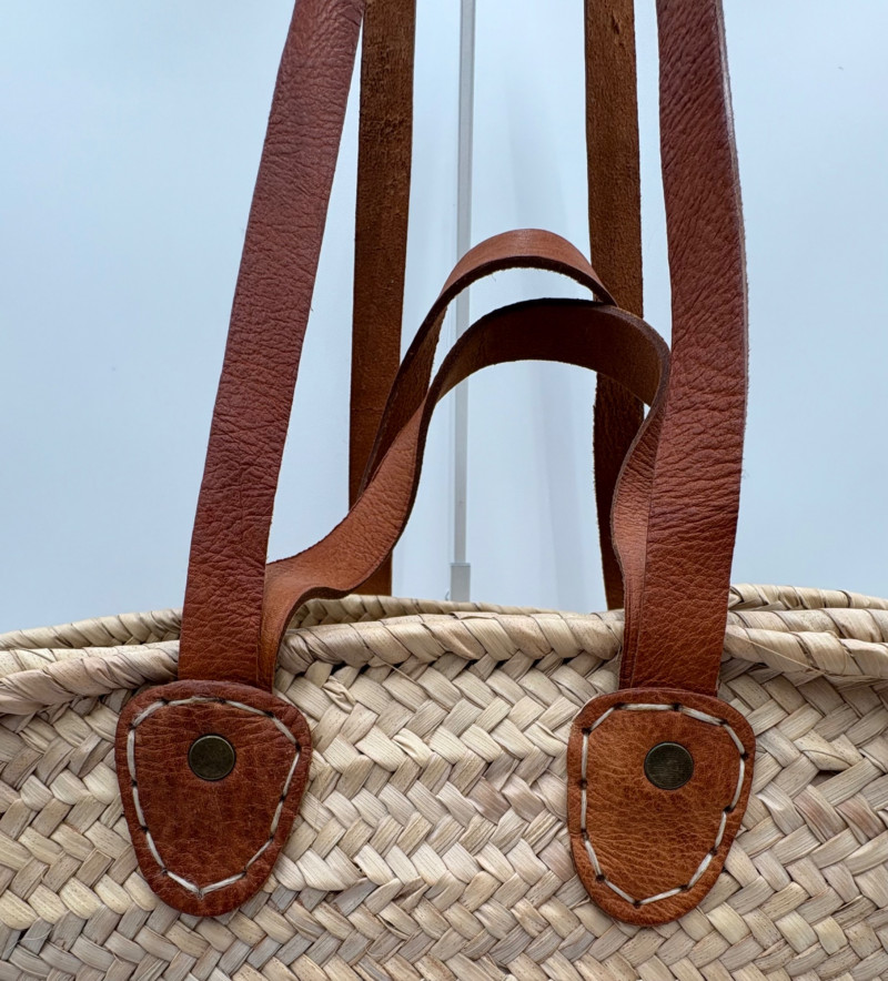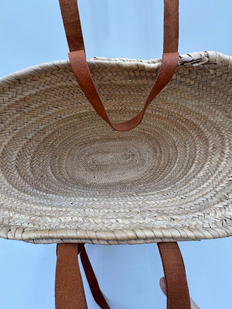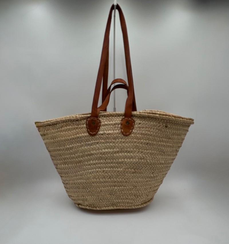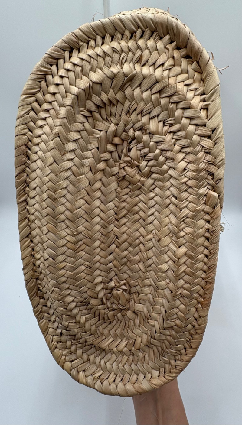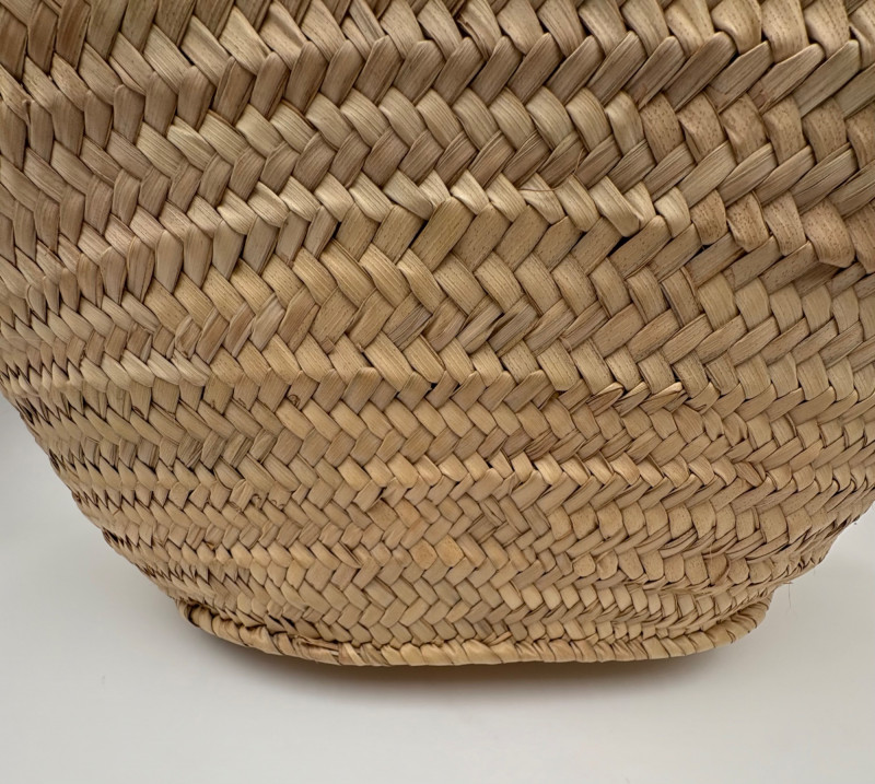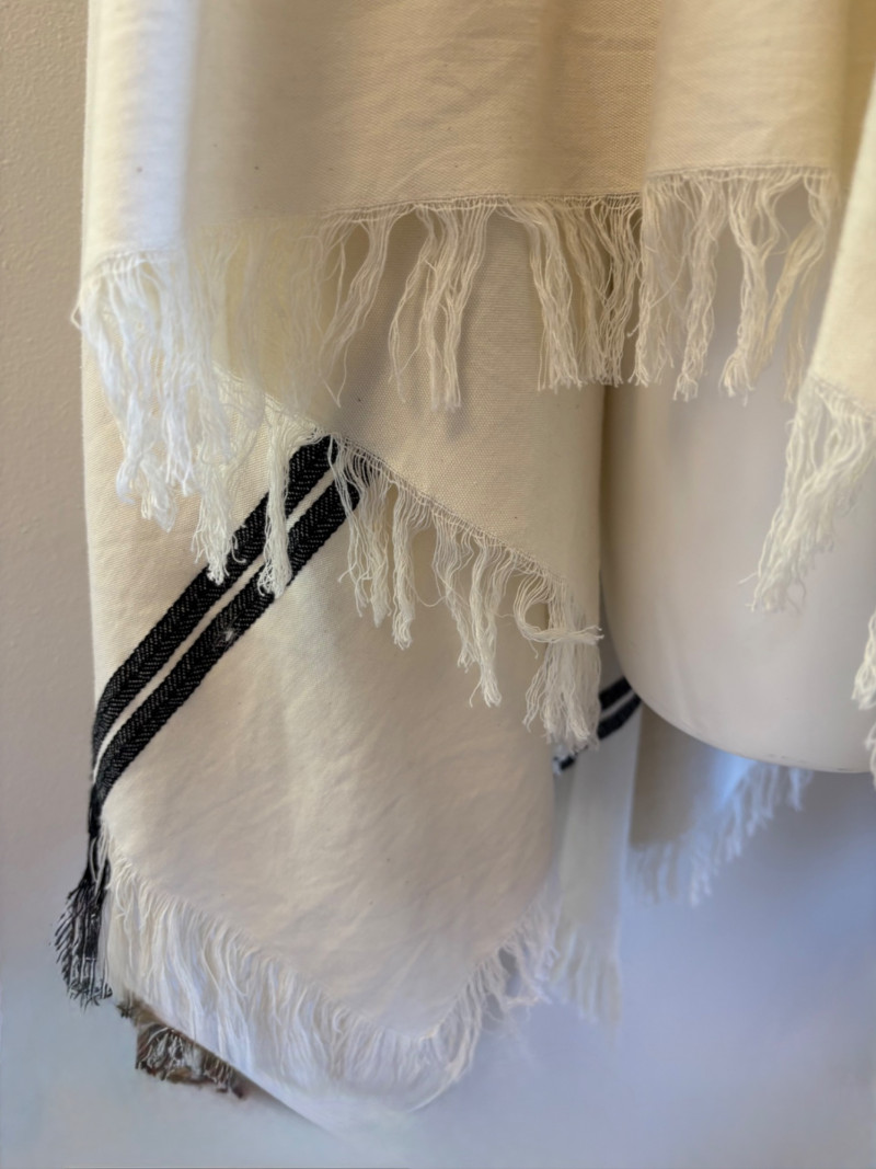 Great beach cover-up poncho from Eileen Fisher & carry tote. Modified poncho from Eileen Fisher in cream woven cotton with black stitched stripes No front closure but lovely fringe along the hems.. 100% organic cotton. Appears to be unused. One size fits all. Large open woven tote with leather straps - shoulder and hand. Flat base & reinforced top. In good condition. No maker mark. Measures 23" across the top with a 12" wide oval base. 13" drop from top of straps to top center of bag.