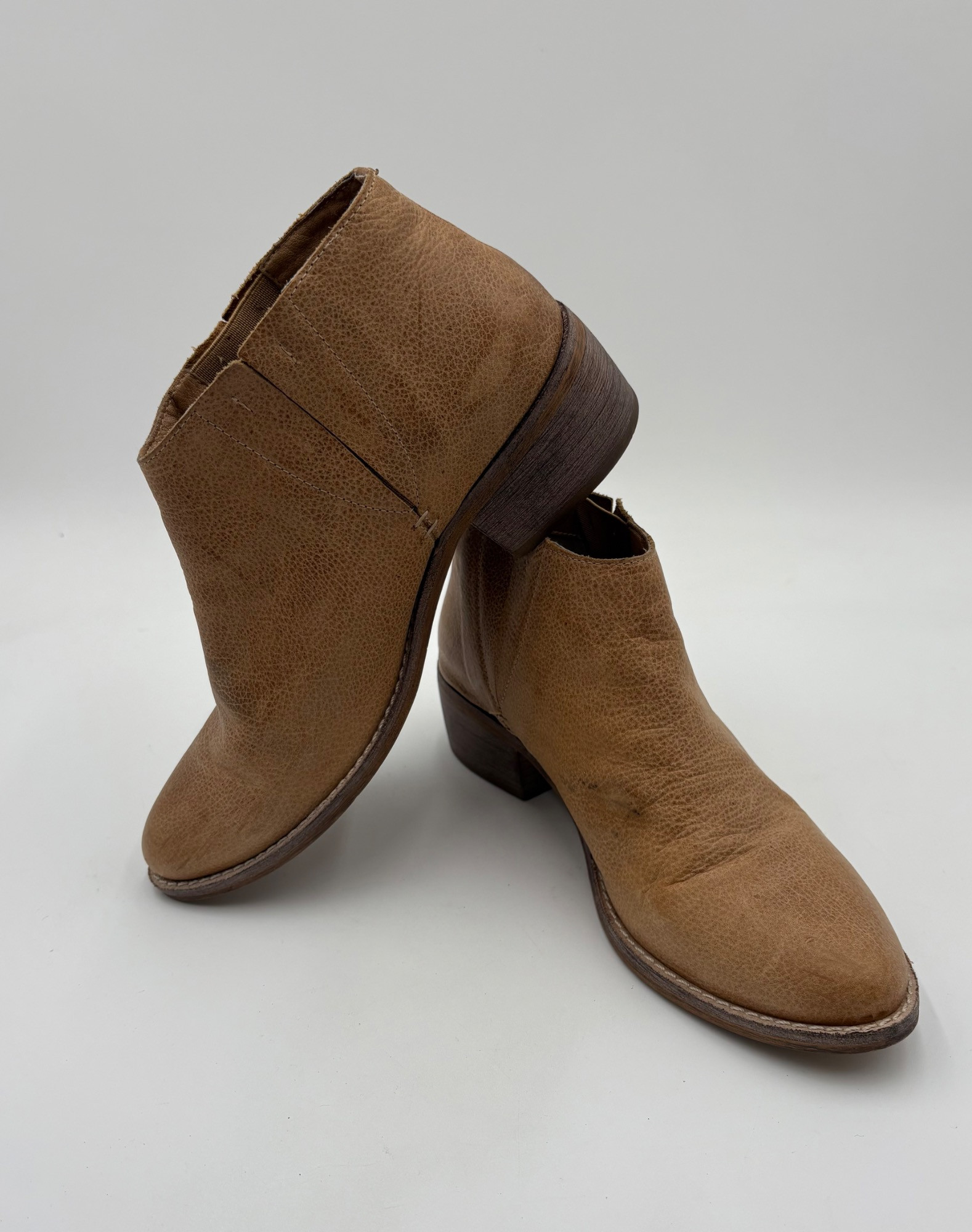 Nice pair of neutral toned ankle boots with slightly western feel from Matisse. Boots are in beige-toned textured leather with leather soles, stacked 1.5" wood heel, pointed western toe, and elasticated gussets on inner and outer ankles. From heel to top of shaft is just under 5". In good used condition with some wear, but could probably look better with a good saddle soap clean. Please look closely at photos. Made in Brazil. Size 7