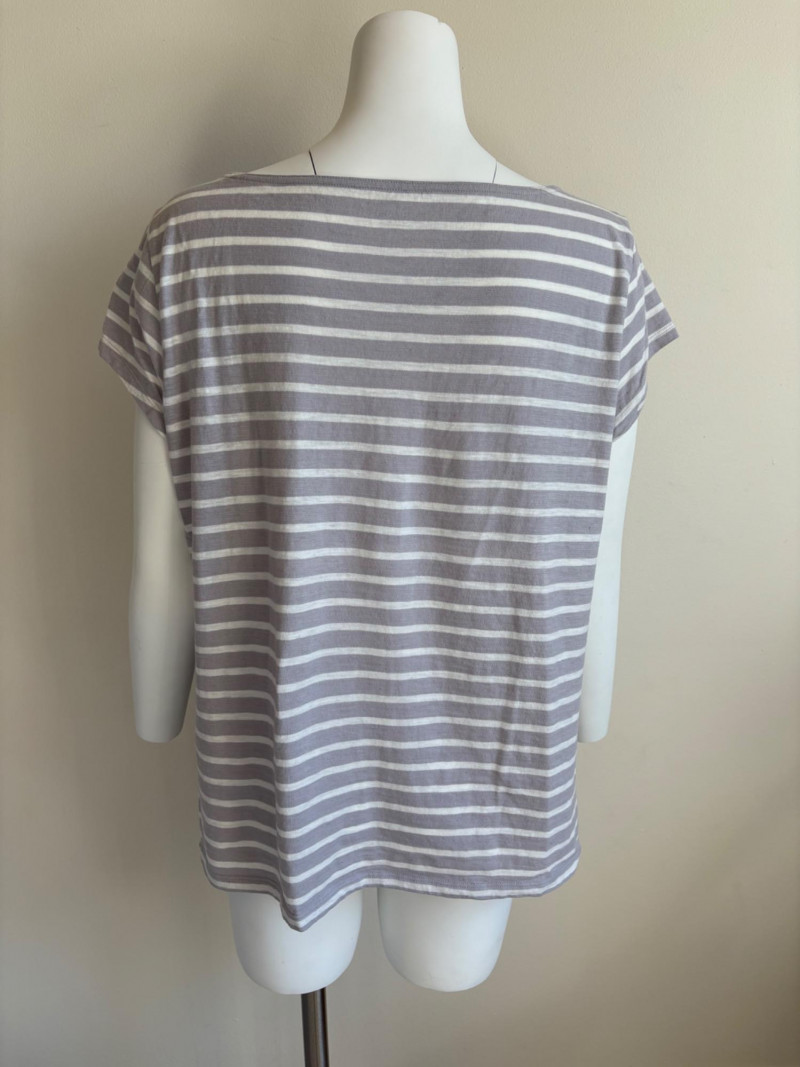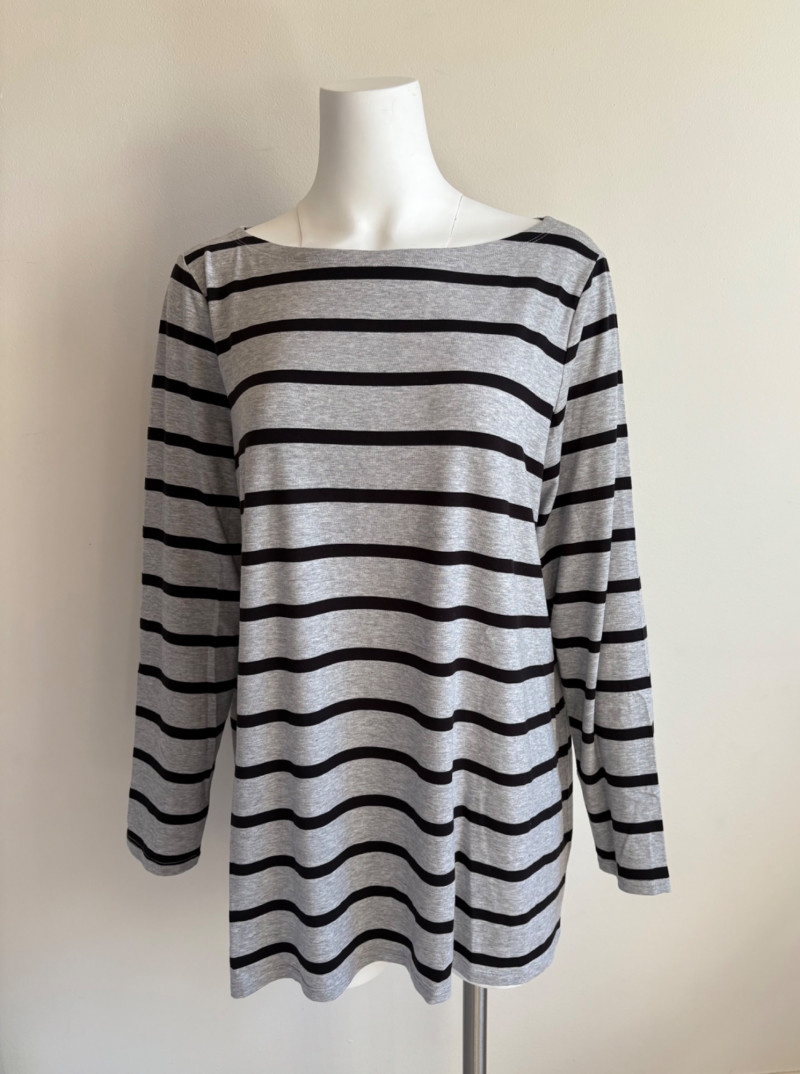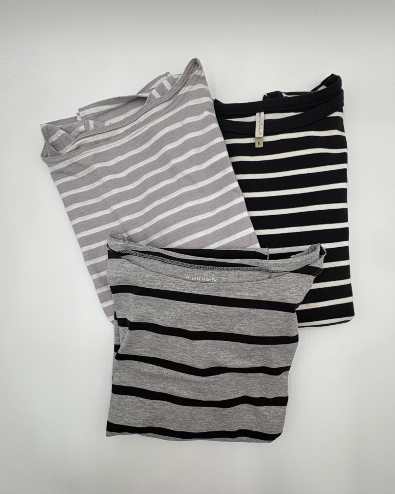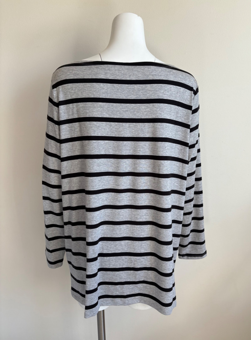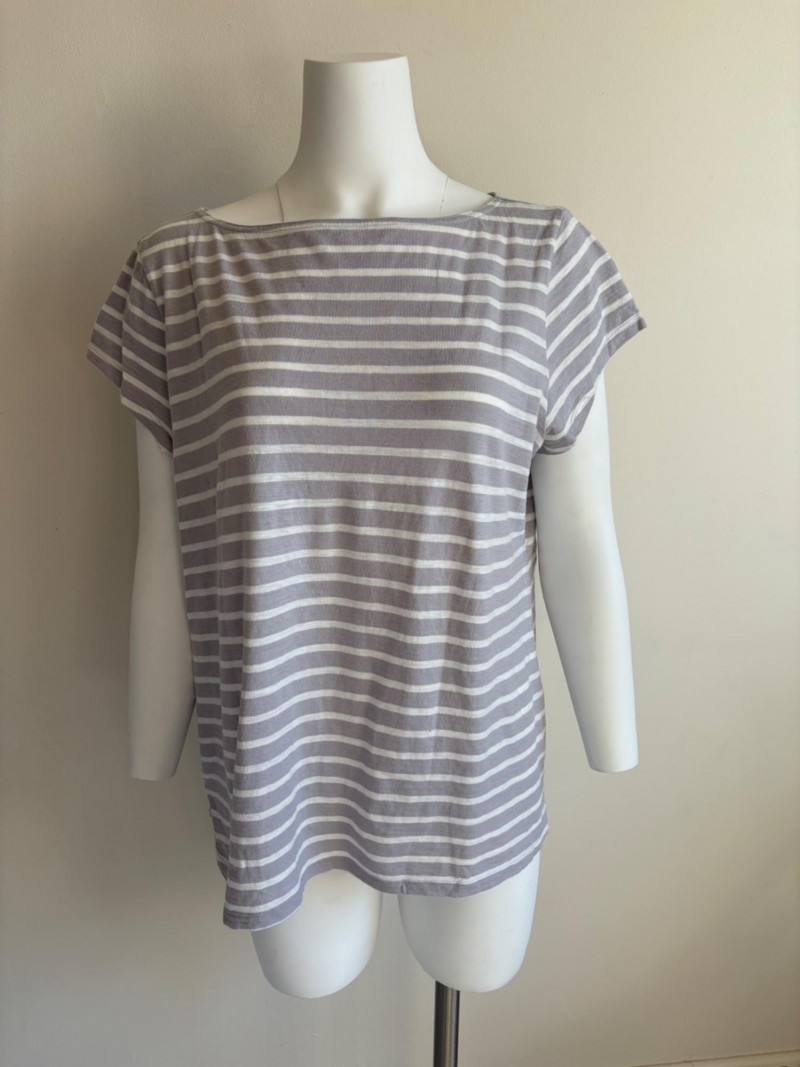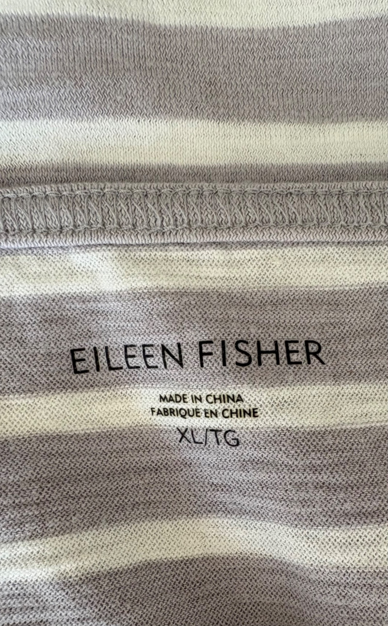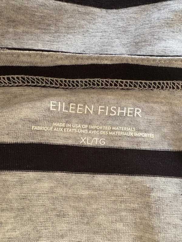 Trio of striped shirts, all in stretch knit from Eileen Fisher & White Stag. Black & grey curved neck top with long sleeves from Eileen Fisher. In excellent condition. 95% Tencel with 5% spandex. Measures 23” pit to pit and 27.5” from back neckline to bottom back hem. Size tag says XL. Grey & white curved neck top with cap sleeves & split hem from Eileen Fisher. In excellent condition. 100% cotton. Measures 23" pit to pit and 24" from back neckline to bottom back hem. Size tag says XL. (Lighter knit than the previous top - more like a t-shirt weight) Black & white top from White Stag with 3/4 length sleeves, ribbing around the neckline, left sleeve pocket, and split hemline. In excellent condition. 97% cotton with 3% spandex. Measures 2" pit to pit and 25.5" from back neckline to bottom back hemline. Size tag says XL.