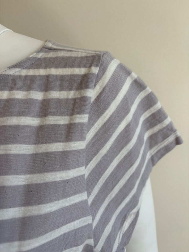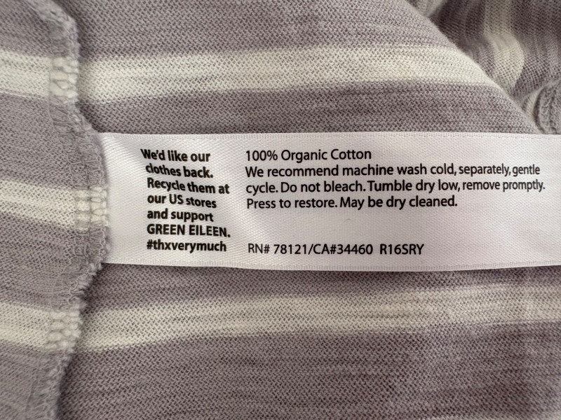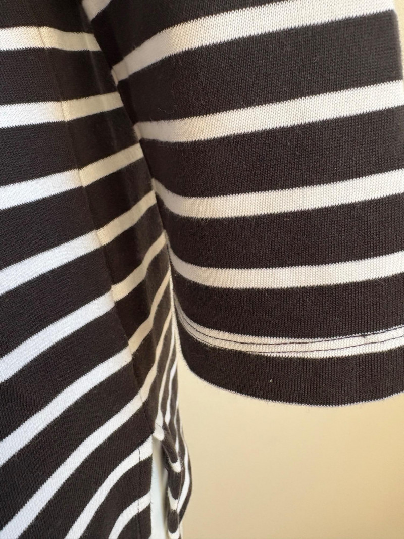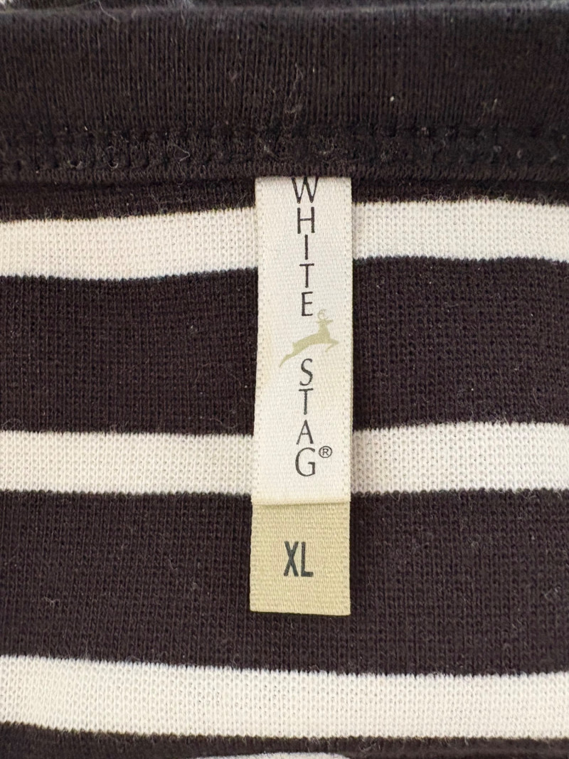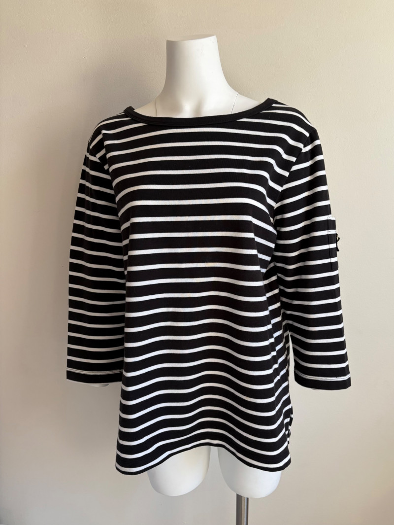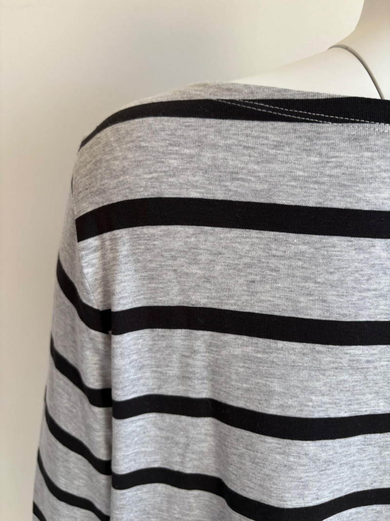 Trio of striped shirts, all in stretch knit from Eileen Fisher & White Stag. Black & grey curved neck top with long sleeves from Eileen Fisher. In excellent condition. 95% Tencel with 5% spandex. Measures 23” pit to pit and 27.5” from back neckline to bottom back hem. Size tag says XL. Grey & white curved neck top with cap sleeves & split hem from Eileen Fisher. In excellent condition. 100% cotton. Measures 23" pit to pit and 24" from back neckline to bottom back hem. Size tag says XL. (Lighter knit than the previous top - more like a t-shirt weight) Black & white top from White Stag with 3/4 length sleeves, ribbing around the neckline, left sleeve pocket, and split hemline. In excellent condition. 97% cotton with 3% spandex. Measures 2" pit to pit and 25.5" from back neckline to bottom back hemline. Size tag says XL.