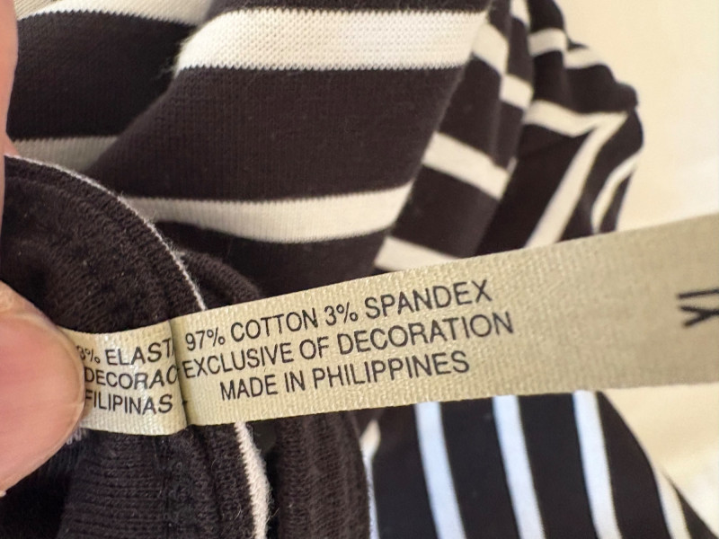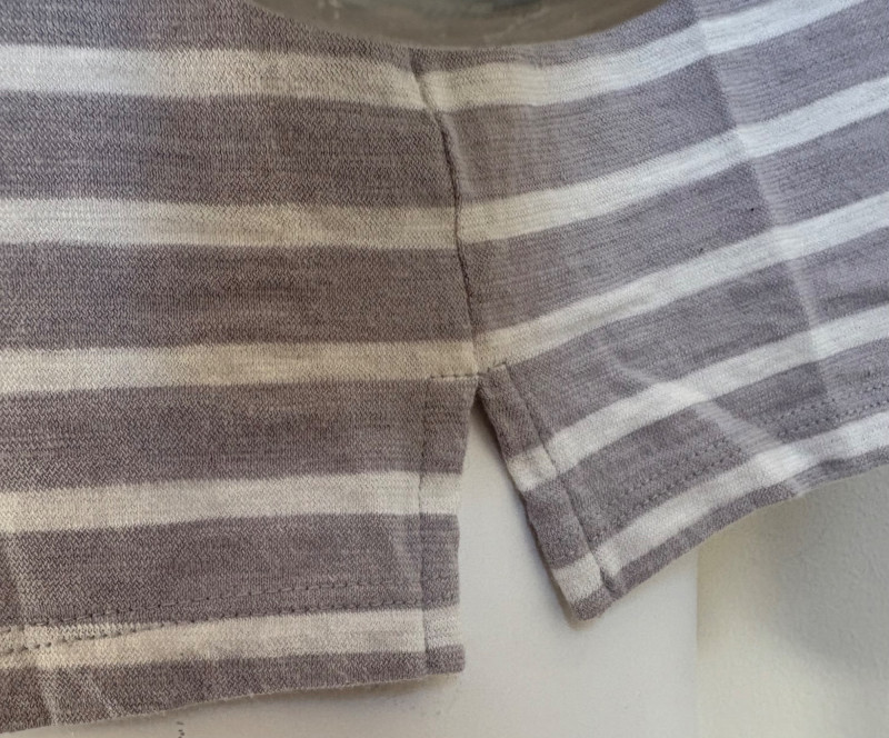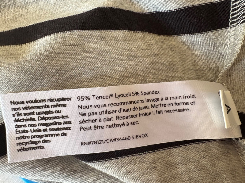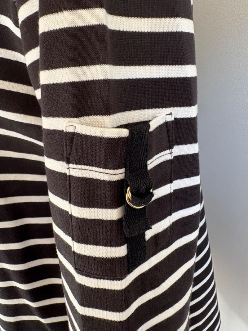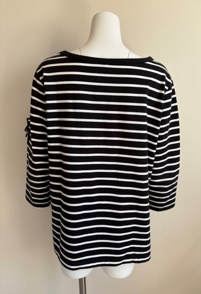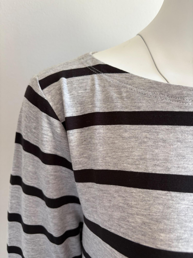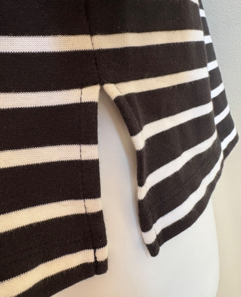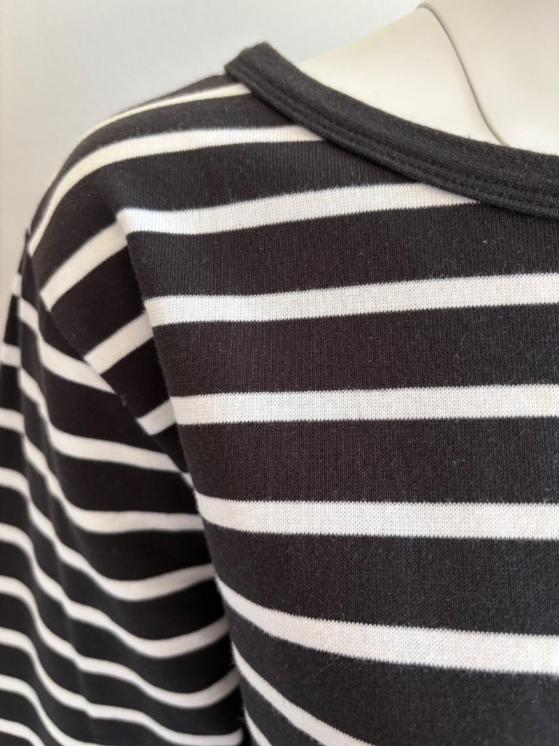 Trio of striped shirts, all in stretch knit from Eileen Fisher & White Stag. Black & grey curved neck top with long sleeves from Eileen Fisher. In excellent condition. 95% Tencel with 5% spandex. Measures 23” pit to pit and 27.5” from back neckline to bottom back hem. Size tag says XL. Grey & white curved neck top with cap sleeves & split hem from Eileen Fisher. In excellent condition. 100% cotton. Measures 23" pit to pit and 24" from back neckline to bottom back hem. Size tag says XL. (Lighter knit than the previous top - more like a t-shirt weight) Black & white top from White Stag with 3/4 length sleeves, ribbing around the neckline, left sleeve pocket, and split hemline. In excellent condition. 97% cotton with 3% spandex. Measures 2" pit to pit and 25.5" from back neckline to bottom back hemline. Size tag says XL.