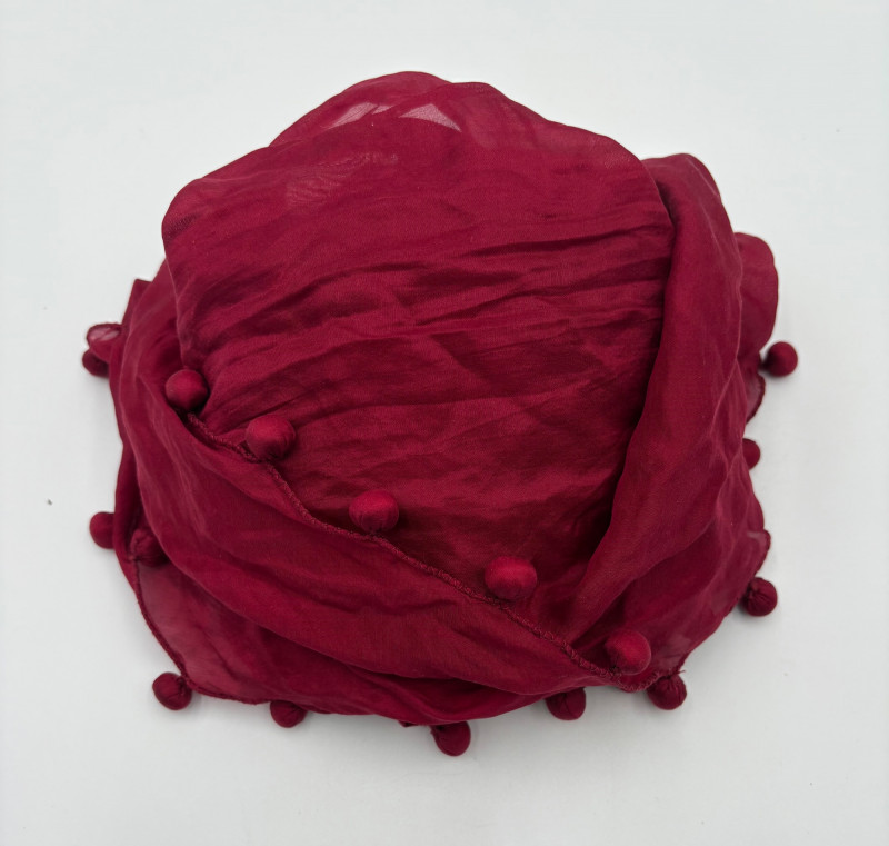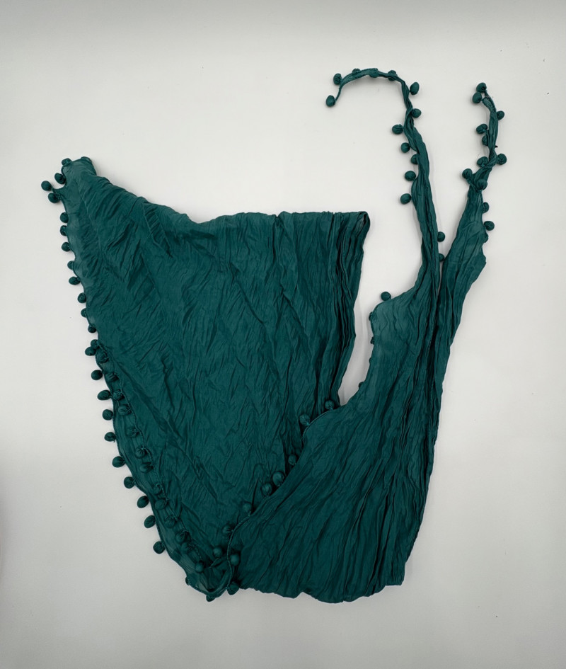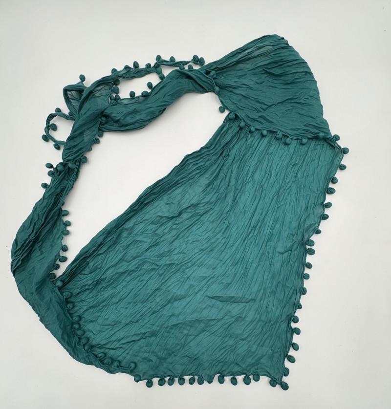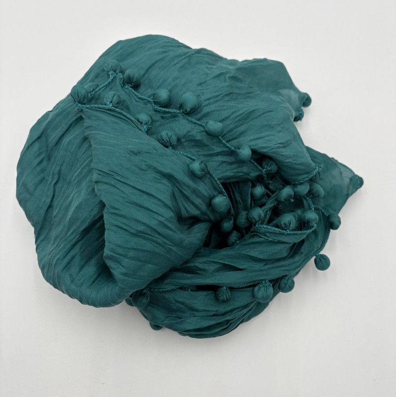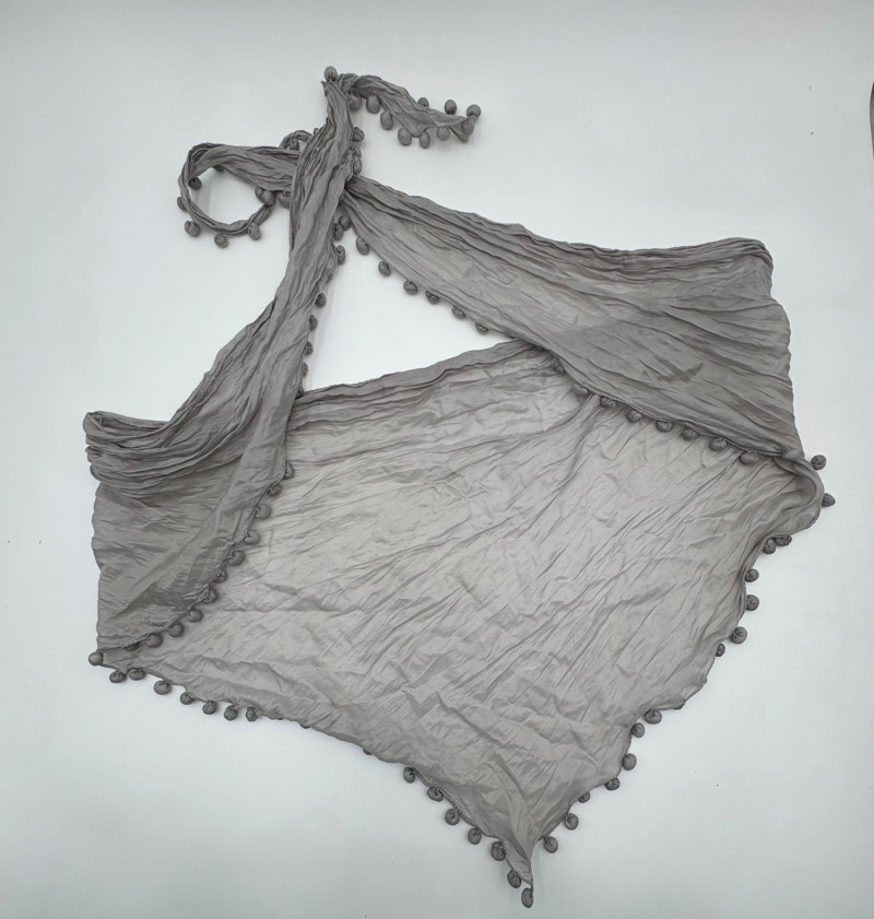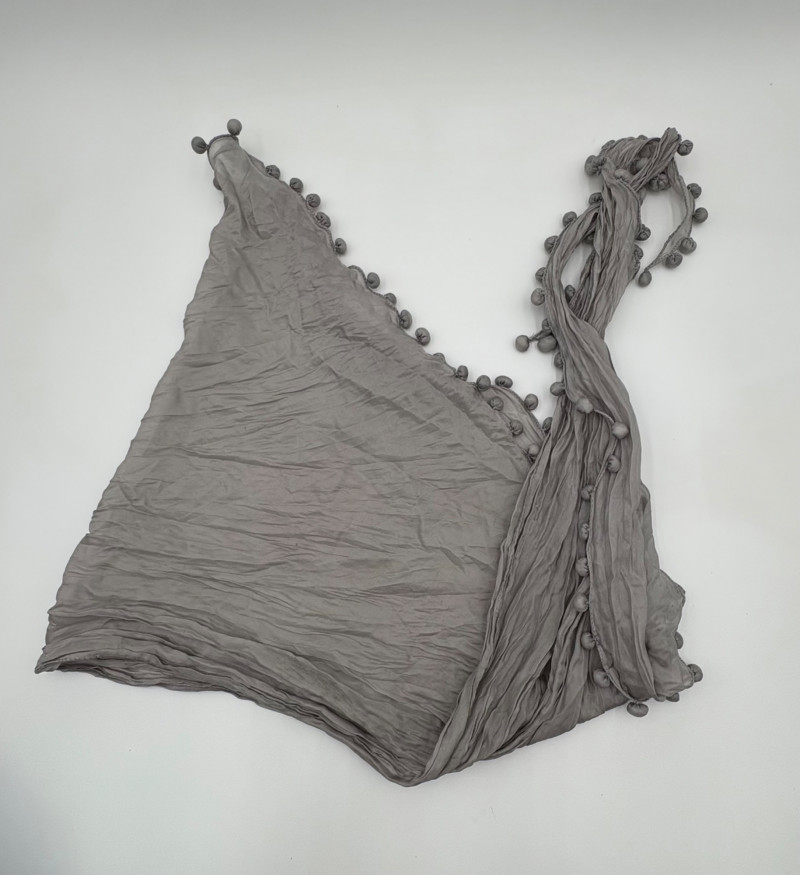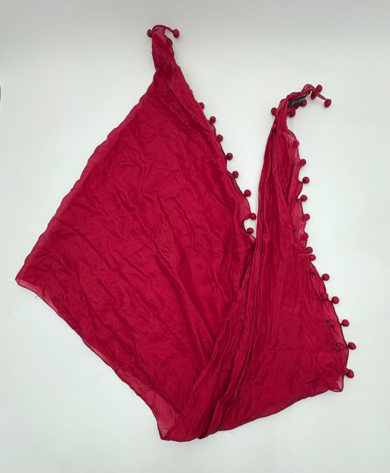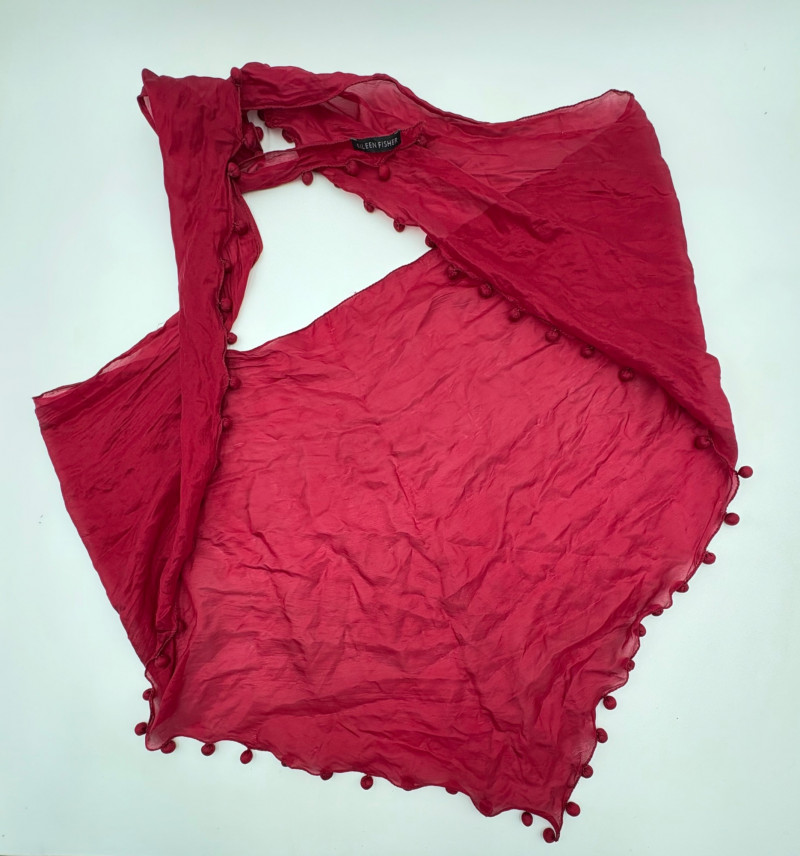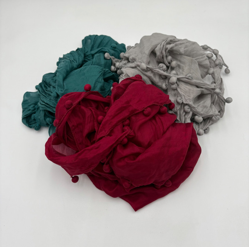 Three lovely kerchief-style scarves in the same design from Eileen Fisher (although only one still has its label). All 3 are triangular in shape with fabric balls along the angled edges. Colors are saturated teal, pale dove grey, and deep red wine. Fabric tags are missing, but they feel like 100% silk. Measure approx. 18" at triangle apex by 78" across base.