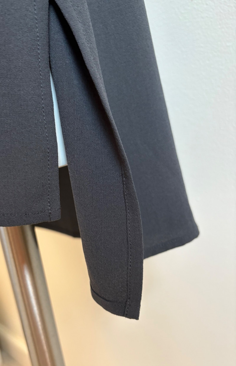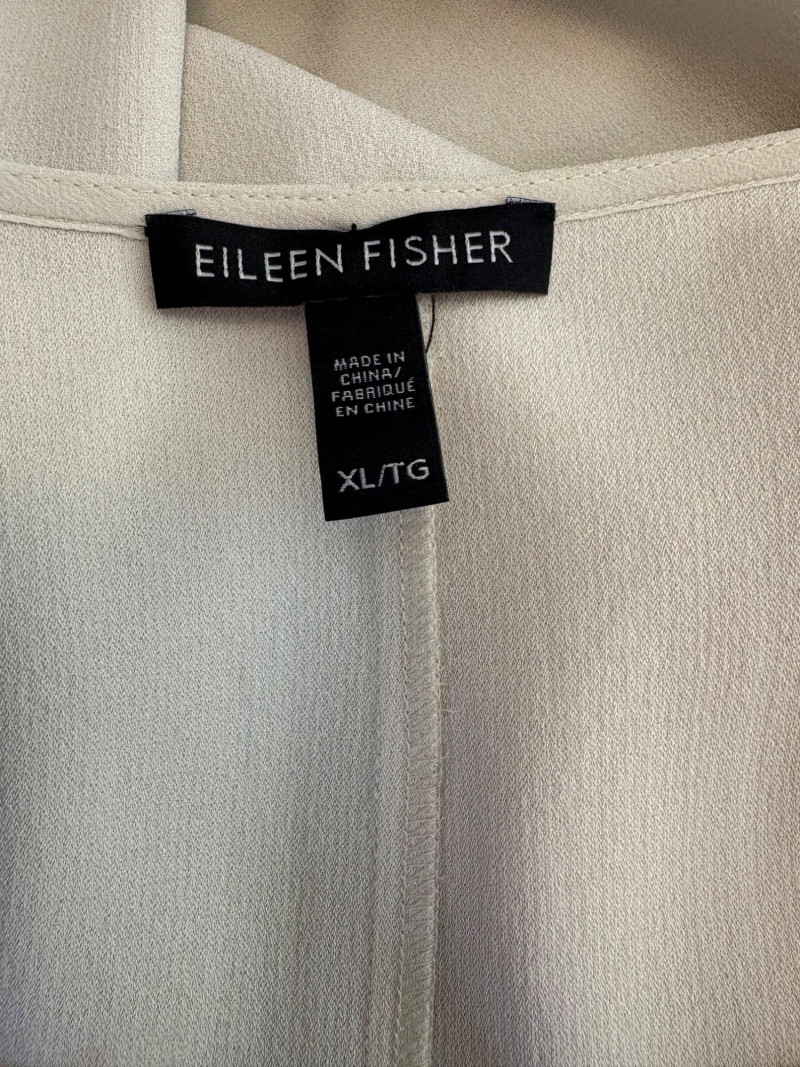 Pair of slightly different silk shells/tunics from Eileen Fisher in deep grey and ivory. Ivory shell has top-stitched neck, sleeve, and gently curving hem. The back hem is approximately 1" longer than the front hem. In excellent condition. 100% silk. Measures 23.5" pit to pit and approximately 29" from center of back neckline to bottom of back hem. Size tag says XL. Grey shell has a top-stitched neck, sleeve and split hem. The back hem is approximately 3 inches longer than front hem. In excellent condition. 100% silk. Measures 23.5" pit to pit and approximately 31" from center of back neckline to bottom of back hem. Size tag says XL.