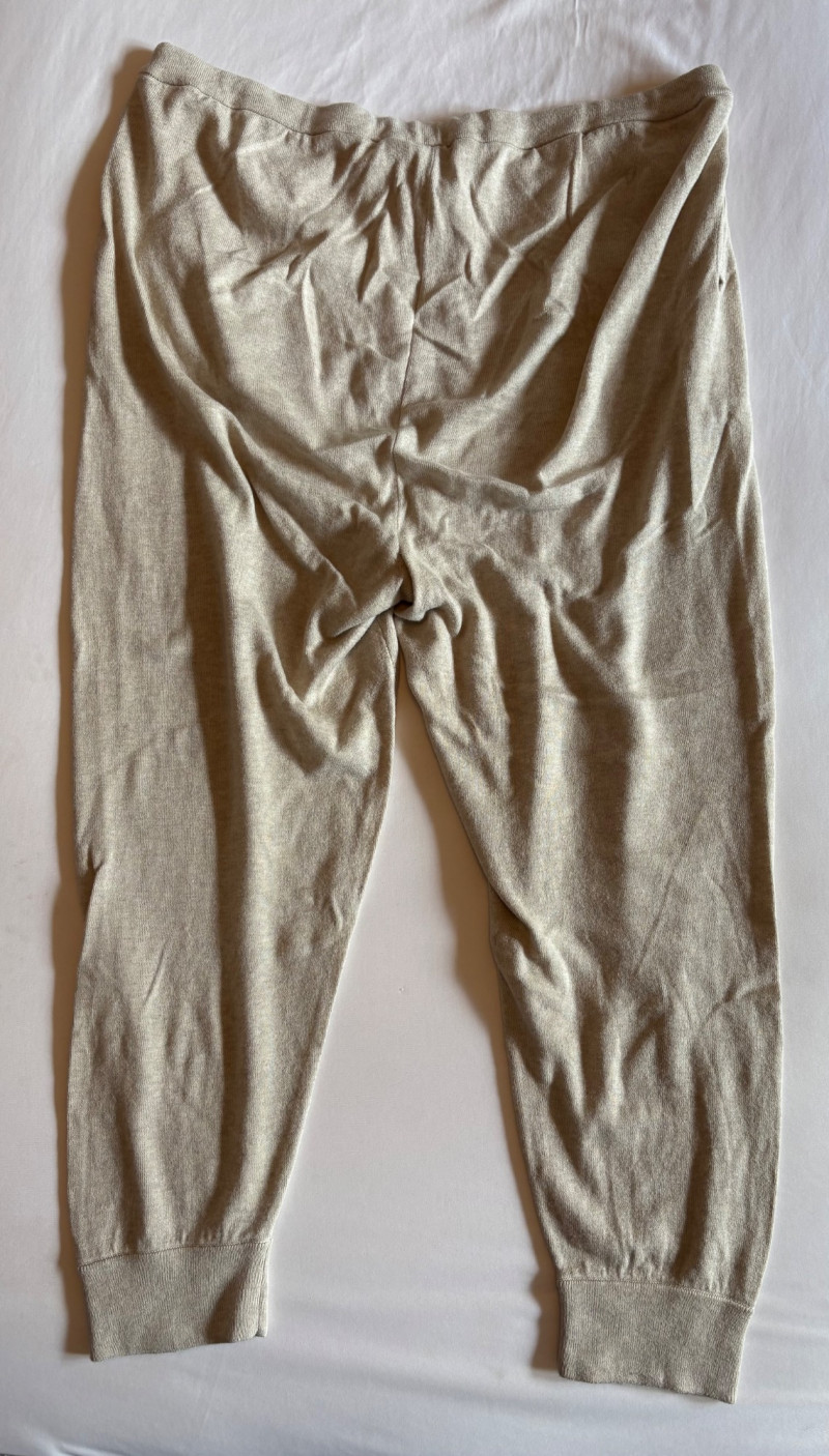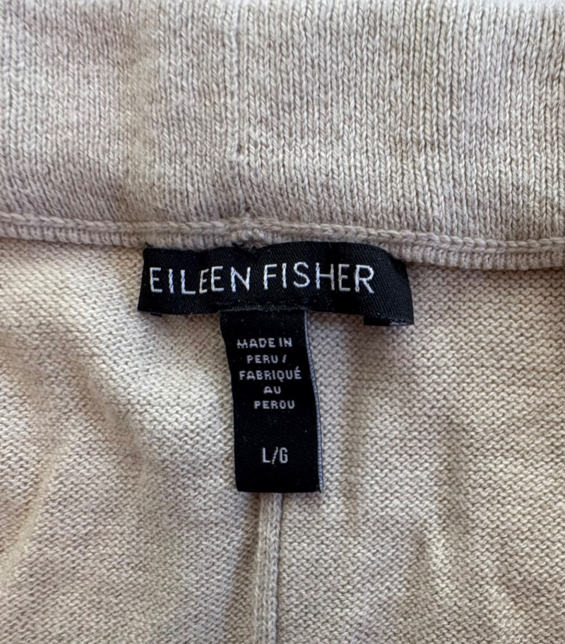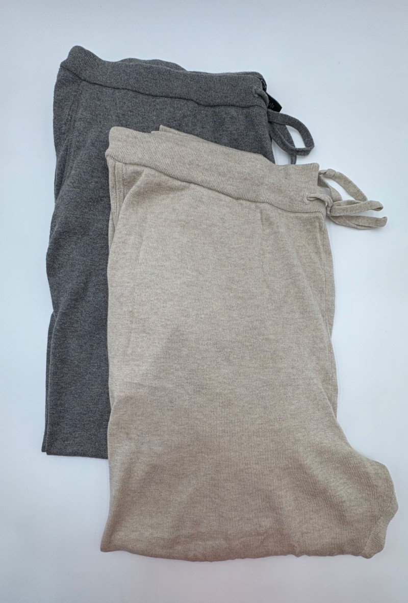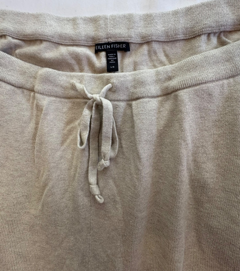 Two pairs of knit pants for lounging or more casual wear from Eileen Fisher. Pants appear to be identical except for color - beige and medium grey. Both are soft knit with in-seam pockets, drawstring waistband, and tapered leg with ribbed cuffs. In excellent condition. 100% organic cotton. Waist side to side measures 20" while inseam measures 26". Size tags are L/G although they appear more generous to our eyes.