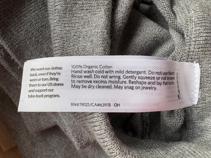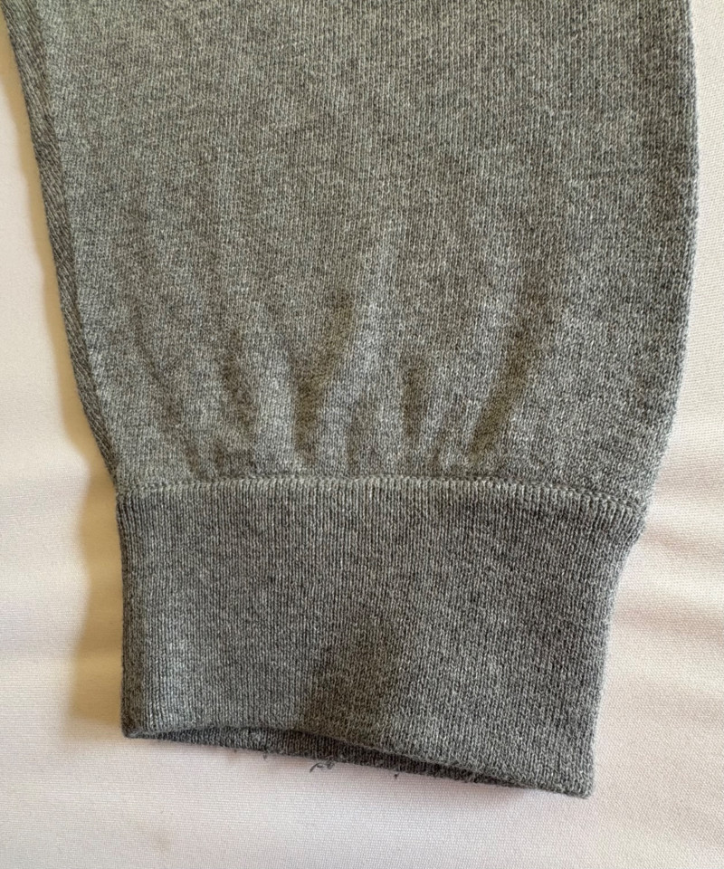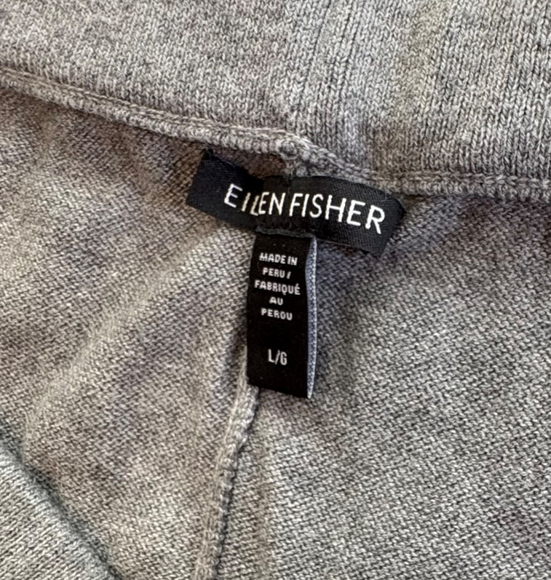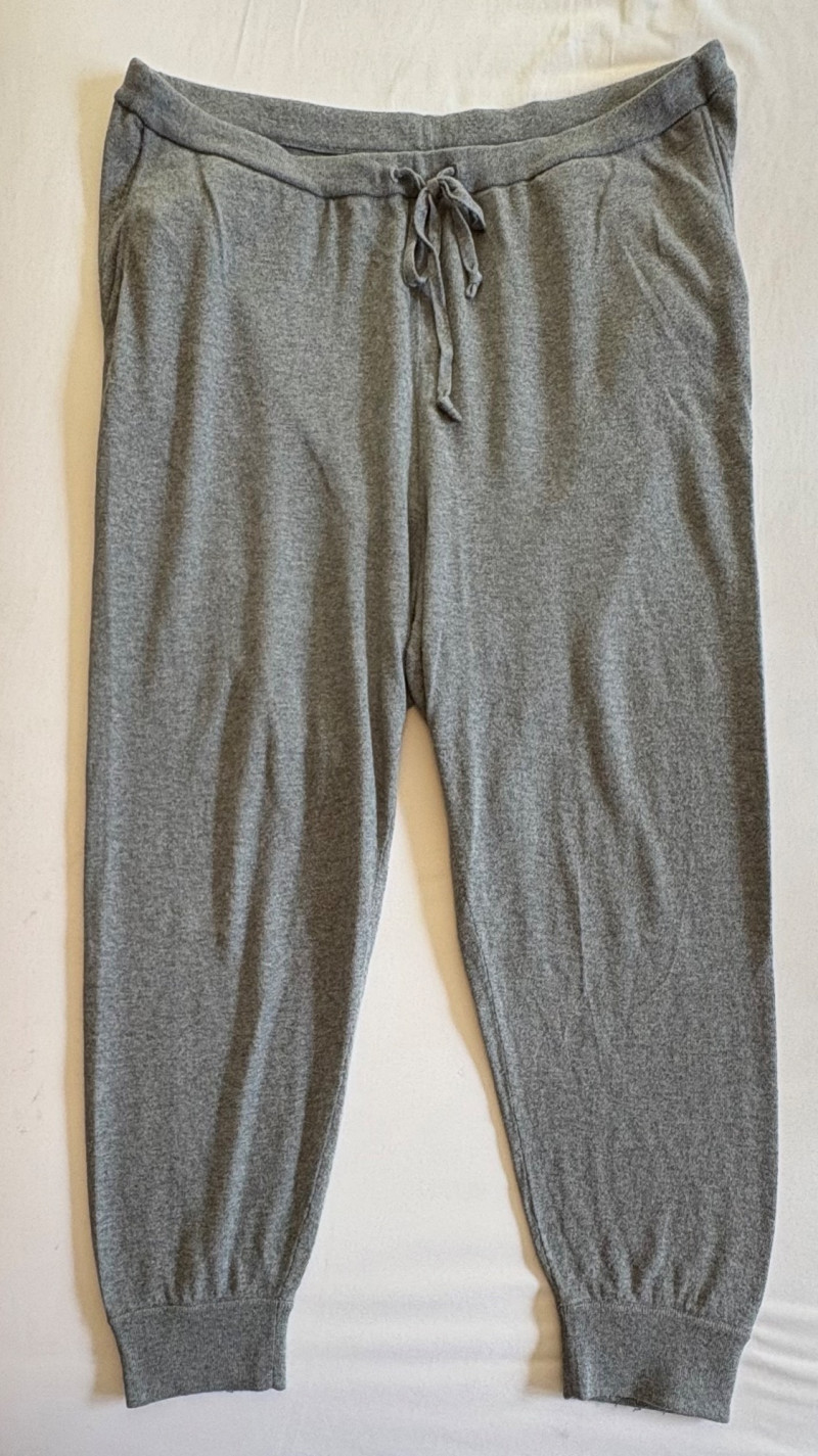 Two pairs of knit pants for lounging or more casual wear from Eileen Fisher. Pants appear to be identical except for color - beige and medium grey. Both are soft knit with in-seam pockets, drawstring waistband, and tapered leg with ribbed cuffs. In excellent condition. 100% organic cotton. Waist side to side measures 20" while inseam measures 26". Size tags are L/G although they appear more generous to our eyes.
