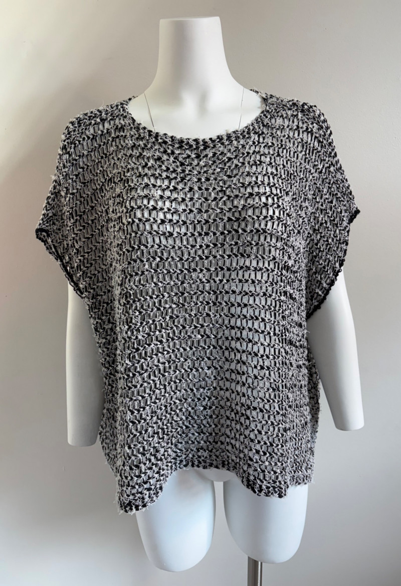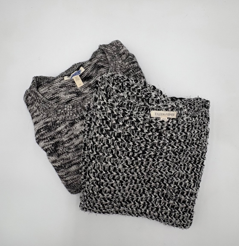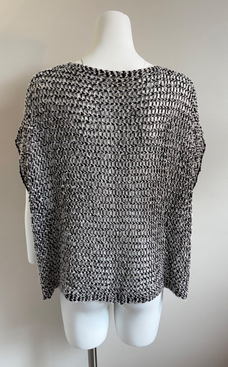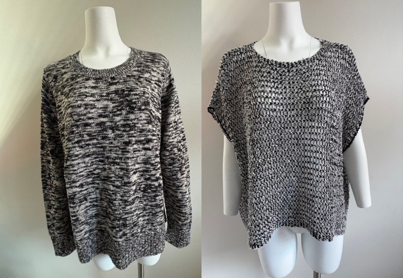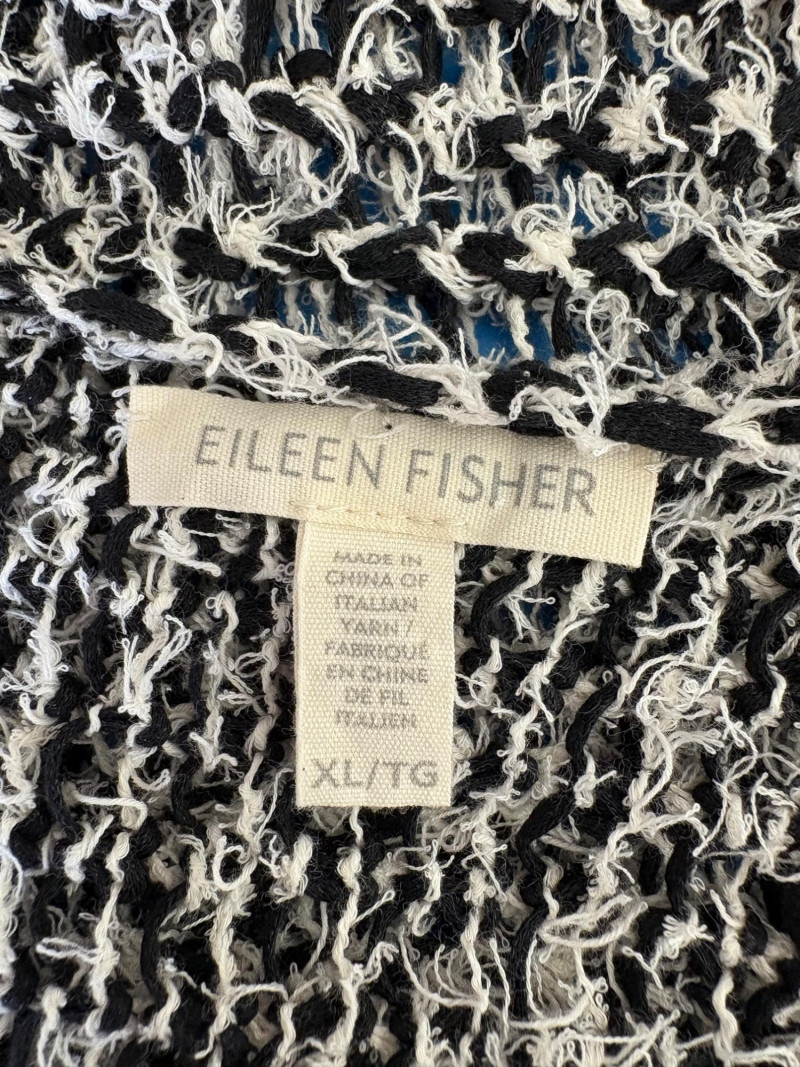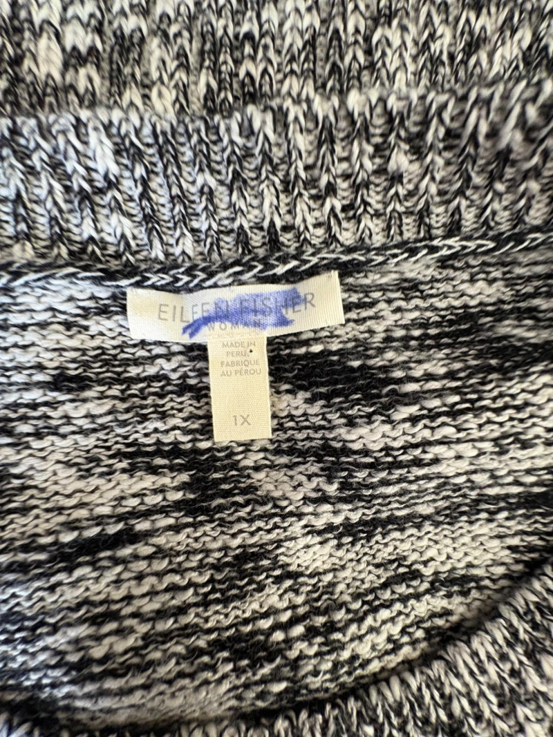 Two lovely black & white sweaters from Eileen Fisher. Black & white marled sweater has ribbed cuffs, neckline, and hem. Shape is straight with split hem and deconstructed design (seam allowances are on the outside). In excellent condition. Fabric content tag is missing, but it feels like a cotton/silk or cotton/Tencel blend. Measures 24.5" pit to pit and 25" from center back neck seam to back hemline. Size tag says 1X. Oversized black & white sleeveless sweater has an open weave and would look terrific over a crisp white shirt. In excellent condition. 87% cotton and 11% polyester with 8% nylon. Measures 27" pit to pit and 20" from center back neck seam to back hemline. Size tag says XL.