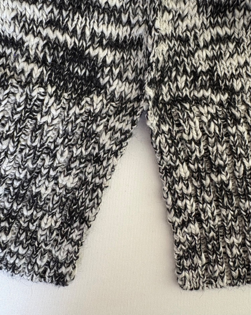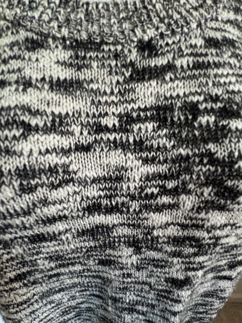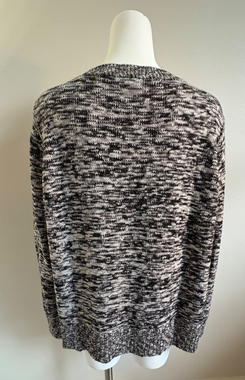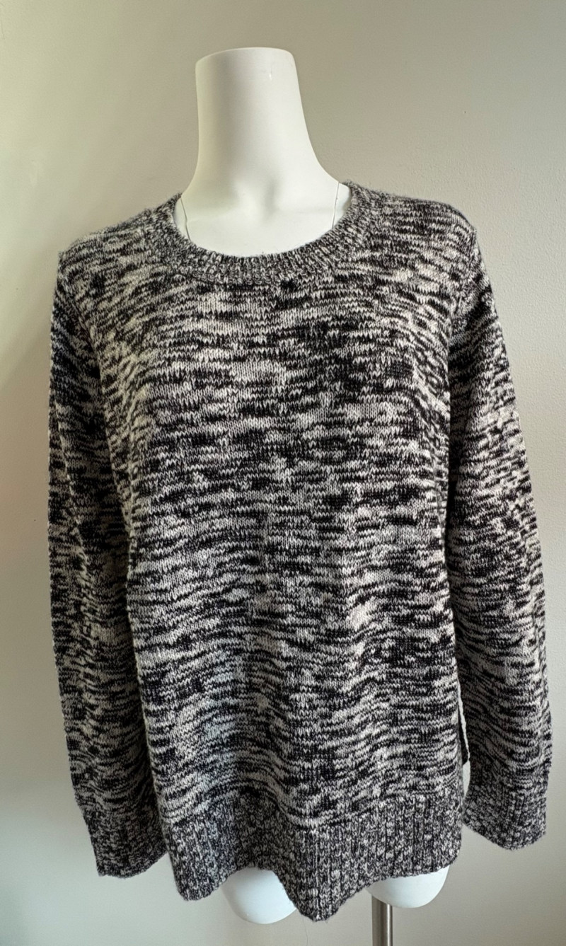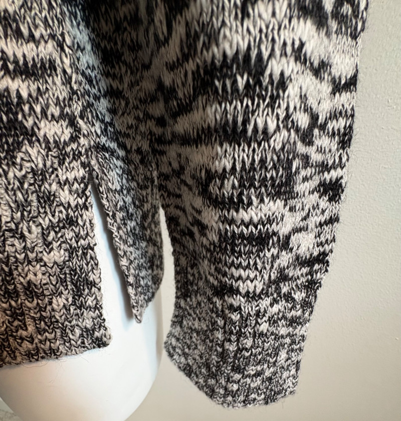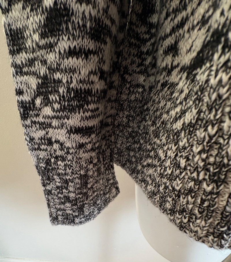 Two lovely black & white sweaters from Eileen Fisher. Black & white marled sweater has ribbed cuffs, neckline, and hem. Shape is straight with split hem and deconstructed design (seam allowances are on the outside). In excellent condition. Fabric content tag is missing, but it feels like a cotton/silk or cotton/Tencel blend. Measures 24.5" pit to pit and 25" from center back neck seam to back hemline. Size tag says 1X. Oversized black & white sleeveless sweater has an open weave and would look terrific over a crisp white shirt. In excellent condition. 87% cotton and 11% polyester with 8% nylon. Measures 27" pit to pit and 20" from center back neck seam to back hemline. Size tag says XL.