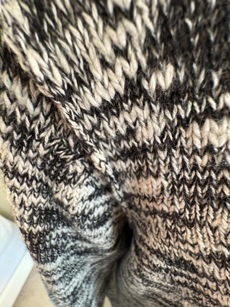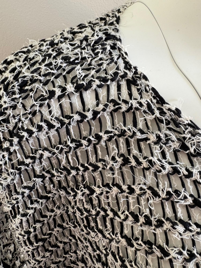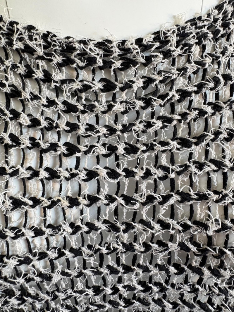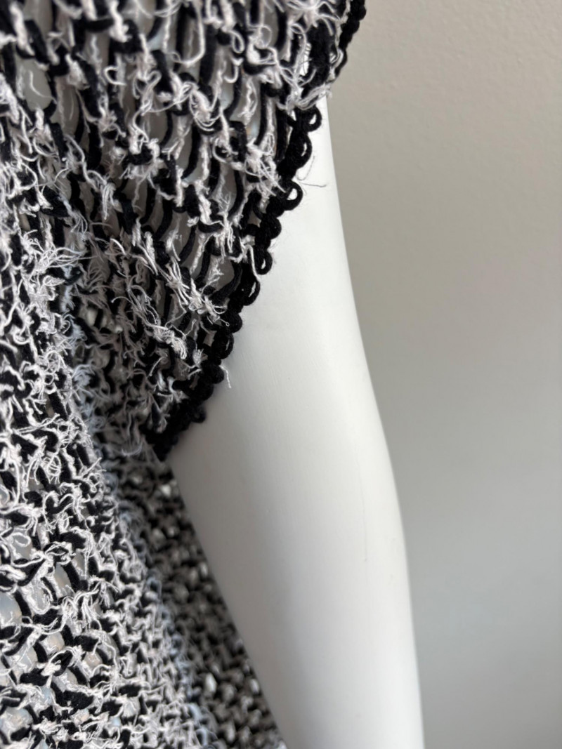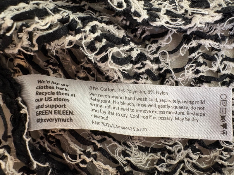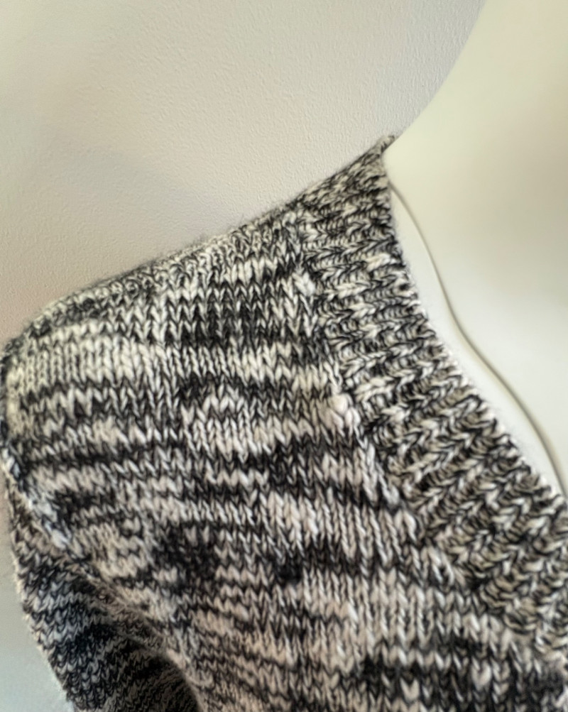 Two lovely black & white sweaters from Eileen Fisher. Black & white marled sweater has ribbed cuffs, neckline, and hem. Shape is straight with split hem and deconstructed design (seam allowances are on the outside). In excellent condition. Fabric content tag is missing, but it feels like a cotton/silk or cotton/Tencel blend. Measures 24.5" pit to pit and 25" from center back neck seam to back hemline. Size tag says 1X. Oversized black & white sleeveless sweater has an open weave and would look terrific over a crisp white shirt. In excellent condition. 87% cotton and 11% polyester with 8% nylon. Measures 27" pit to pit and 20" from center back neck seam to back hemline. Size tag says XL.