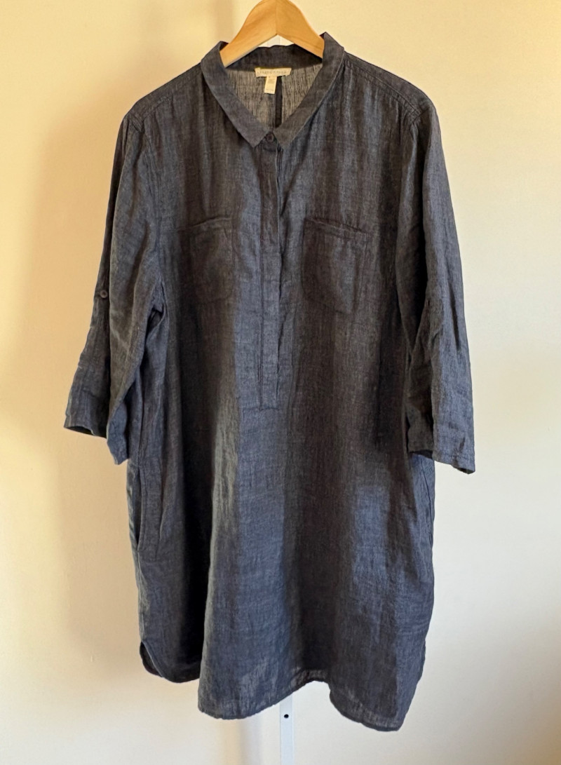 Classic charcoal/black shirt dress from Eileen Fisher. Small curved collar, hidden half-length button closure with front placket, in-seam pockets, breast pockets, roll-up sleeves with tabs, and split hem. 100% linen. In good condition. Measures 23" pit to pit and 38"from center back neck seam to back hemline. Size tag says XL.