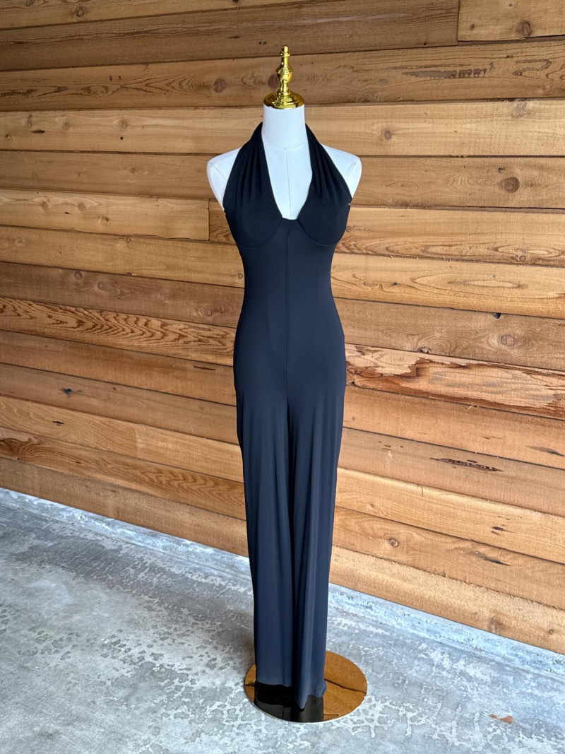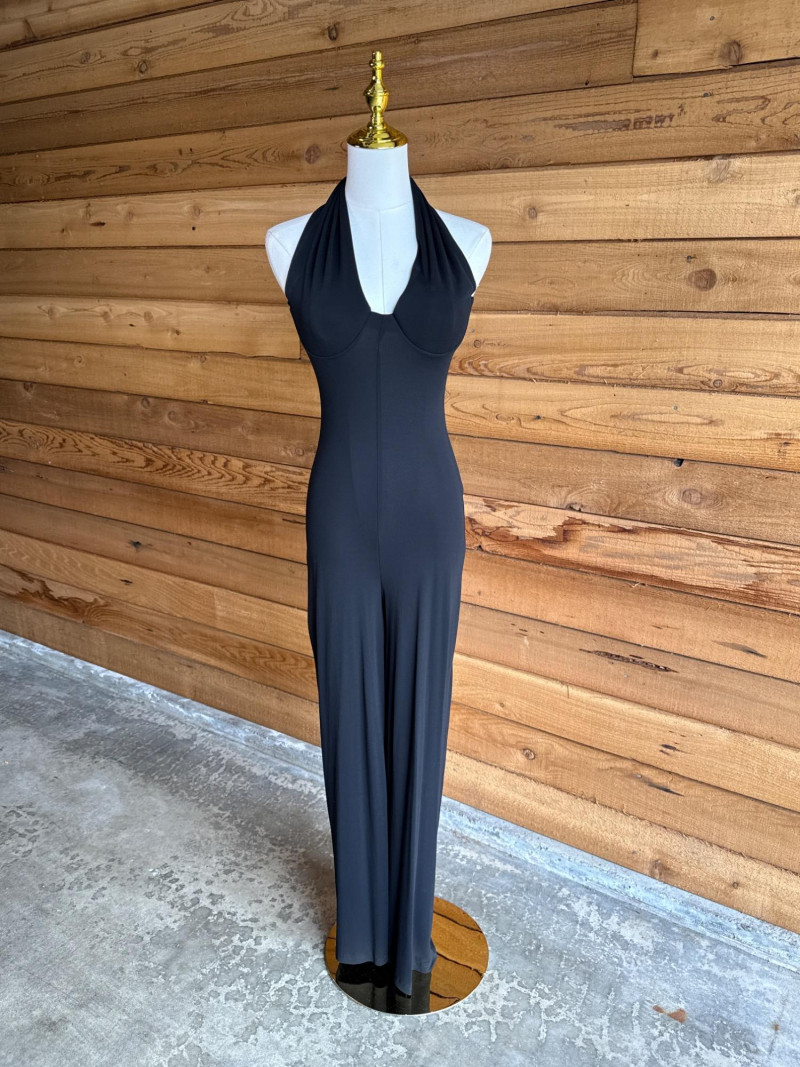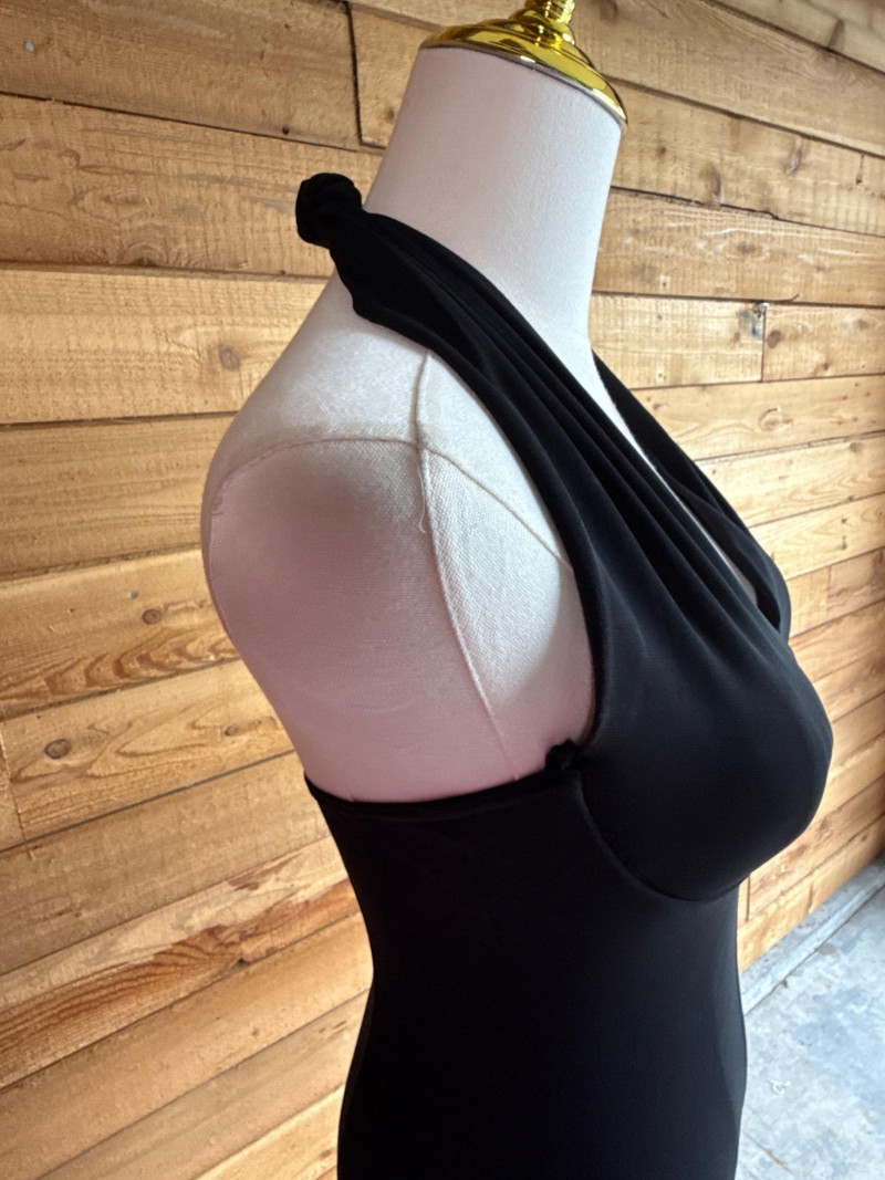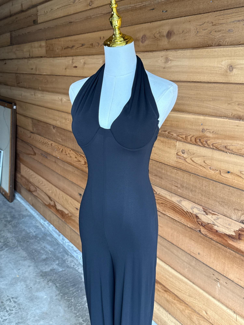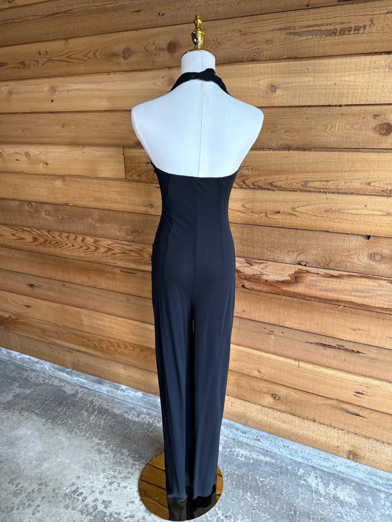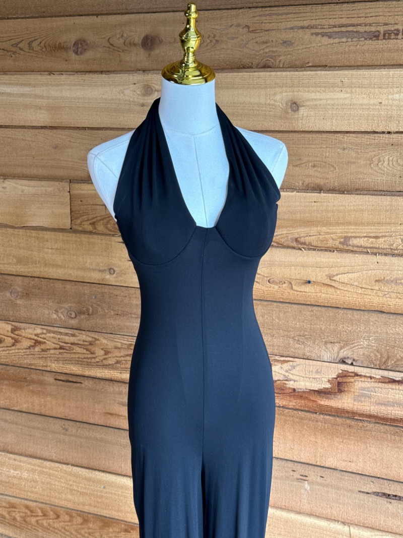 Black Halter Pant Suit Stretch material. Soft knit. No size tag Would estimate it to be about a xs/s. Has moulded bra cups.