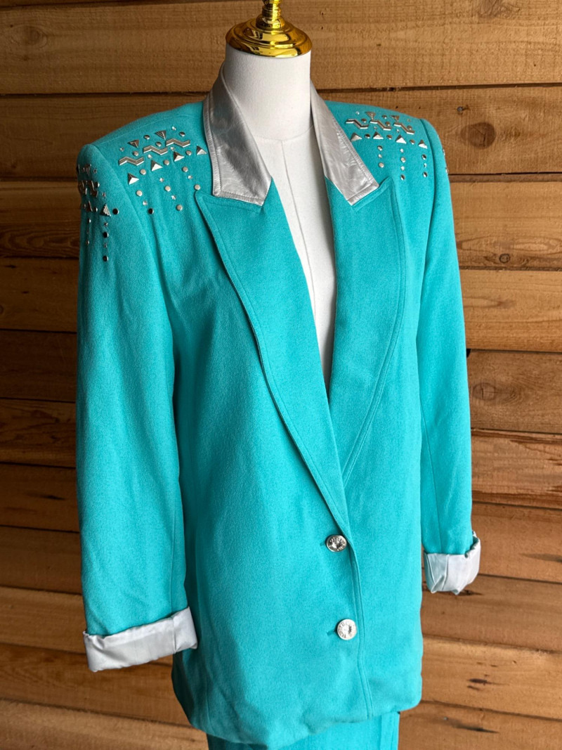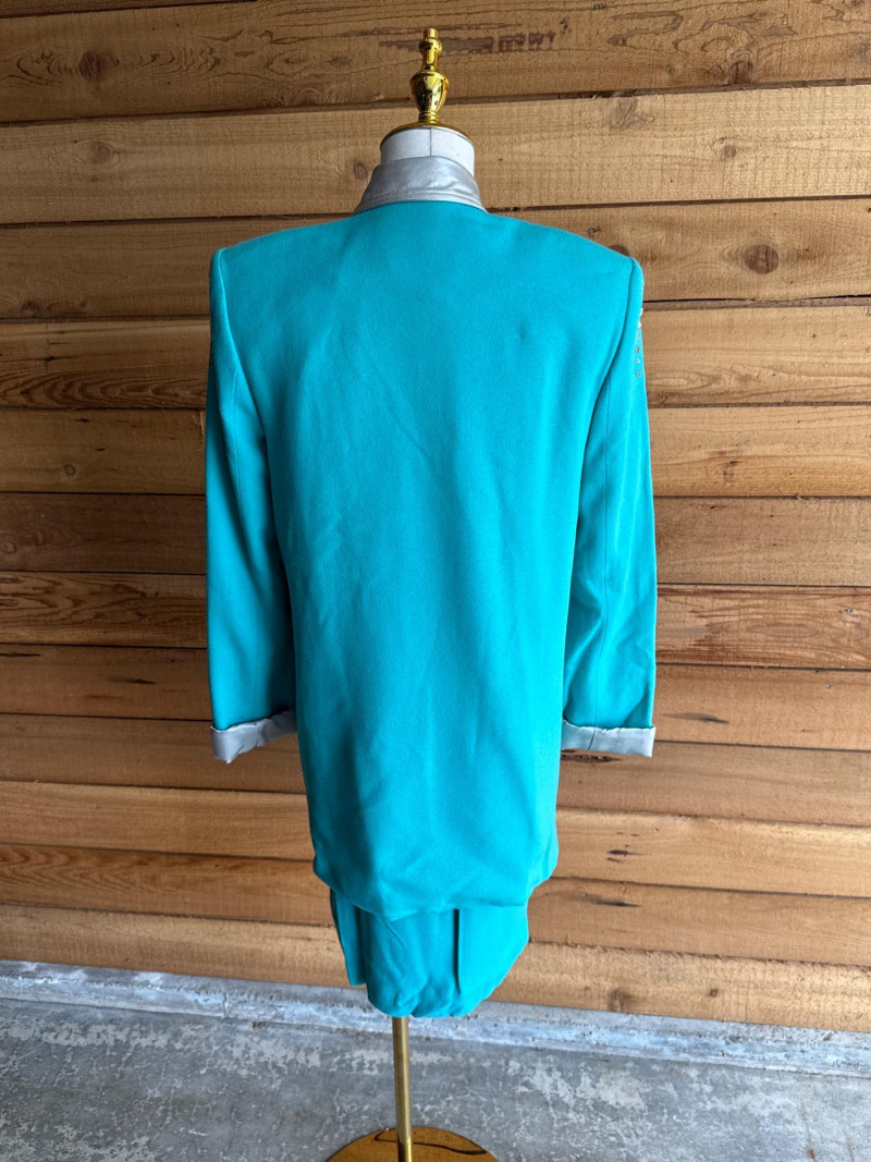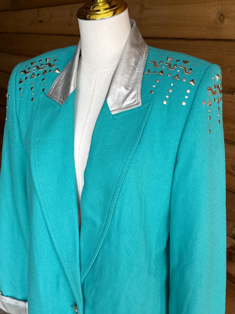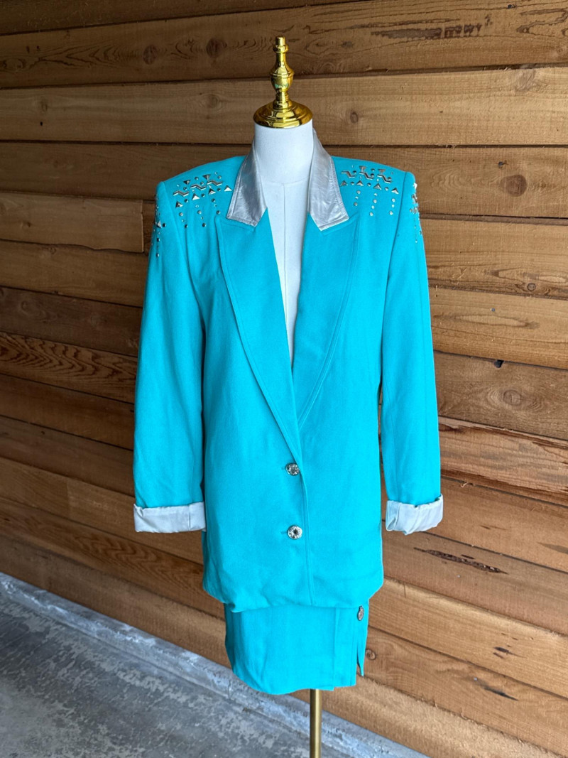 CRISCOINE Vintage Aqua w/ Leather Collar Skirt Suit- Sz XS