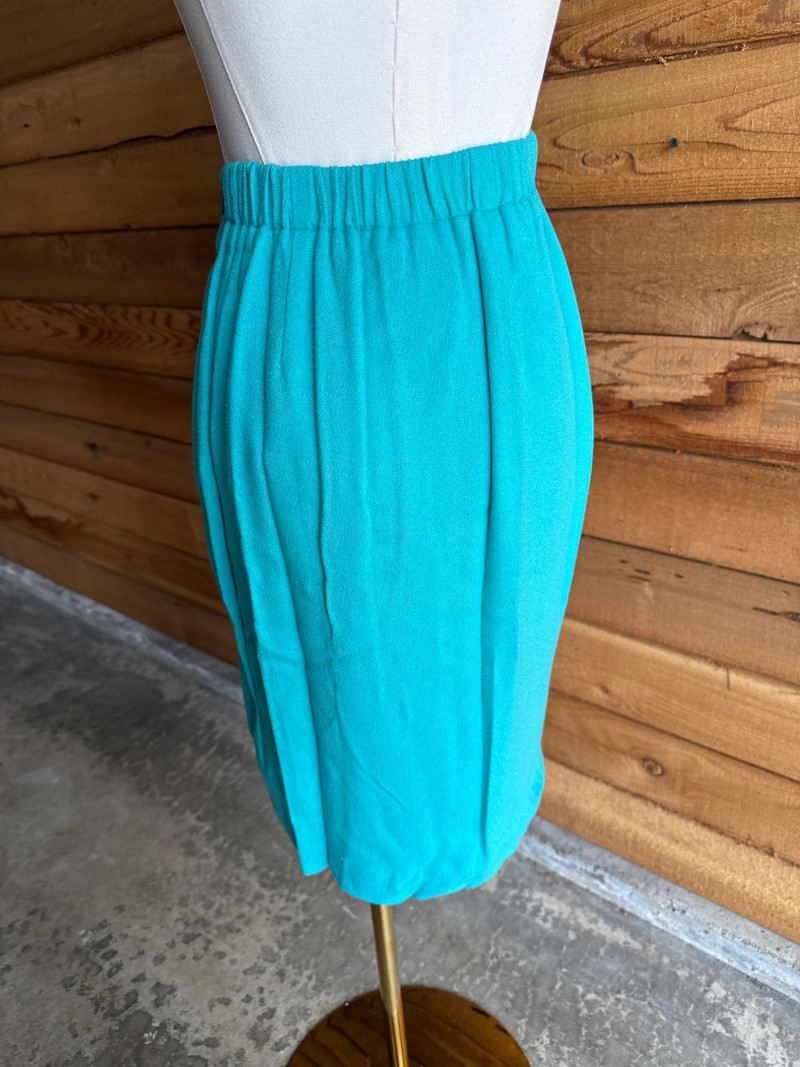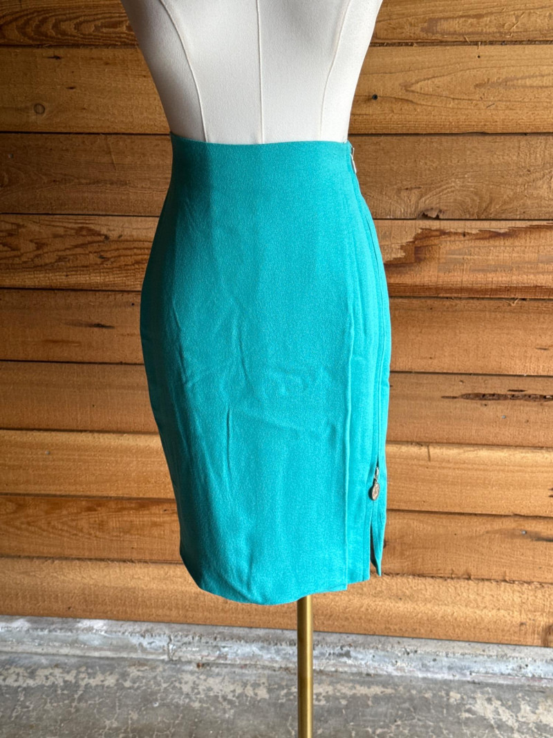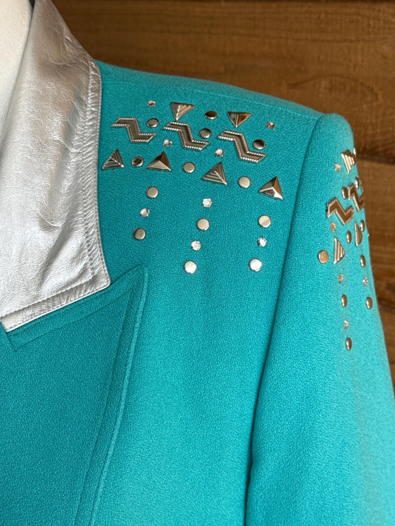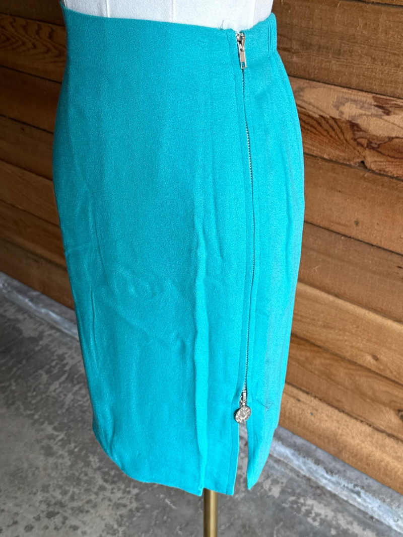 CRISCOINE Vintage Aqua w/ Leather Collar Skirt Suit- Sz XS