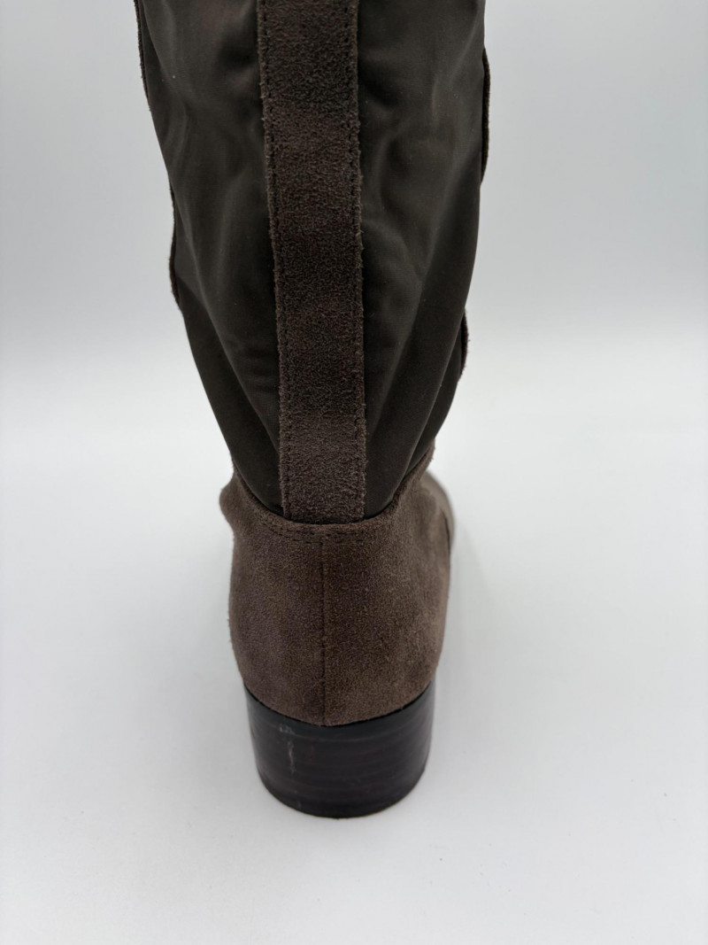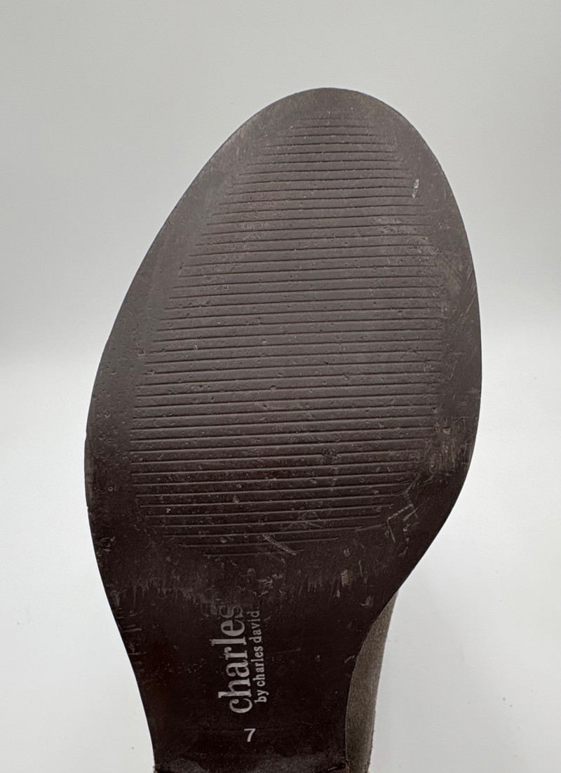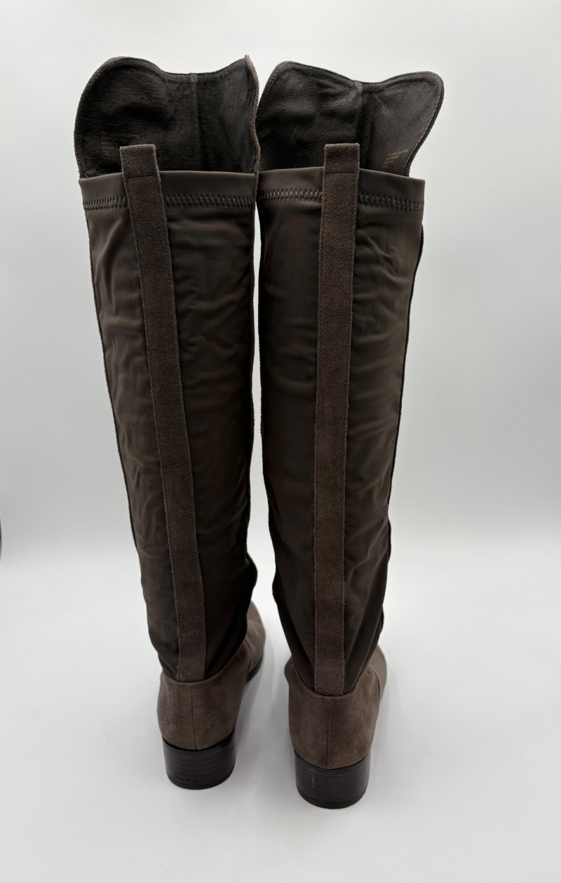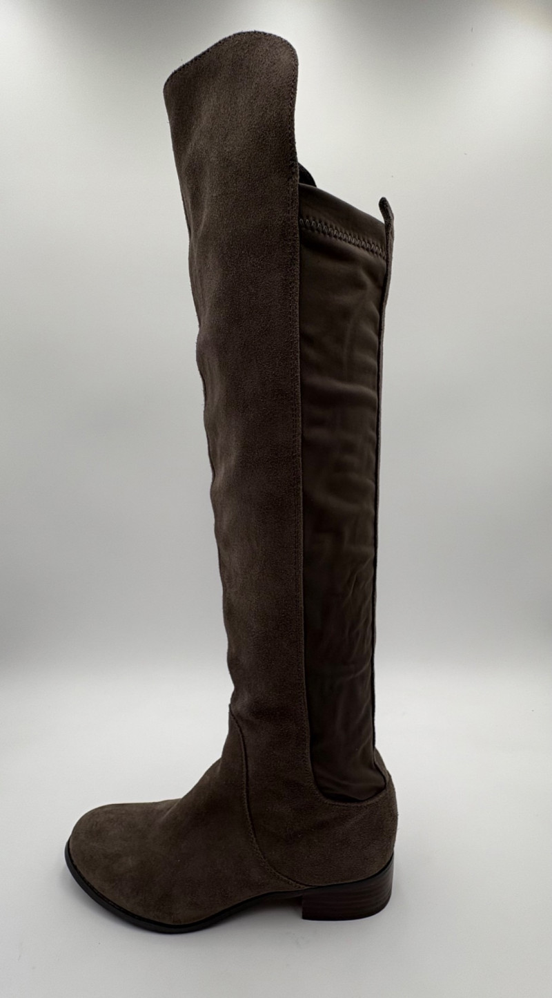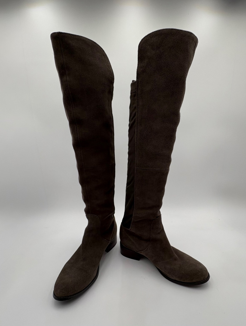 Wonderful over-the-knee boots from Charles David. Boots in soft grey suede with front of shaft extending over kneecap. 2 elastic inserts inside & outside of shaft make for a good fit regardless of calf size. Suede strip up back of calf extending above opening with tab for help putting on. Stacked 1 3/8" heel. Shaft measures 16" from top of heel to top of back elastic section. Knee tab extends approx. 3" above rest of boot. In excellent condition with a few very slight scuffs on heel (too faint to show up in photos). Size 7