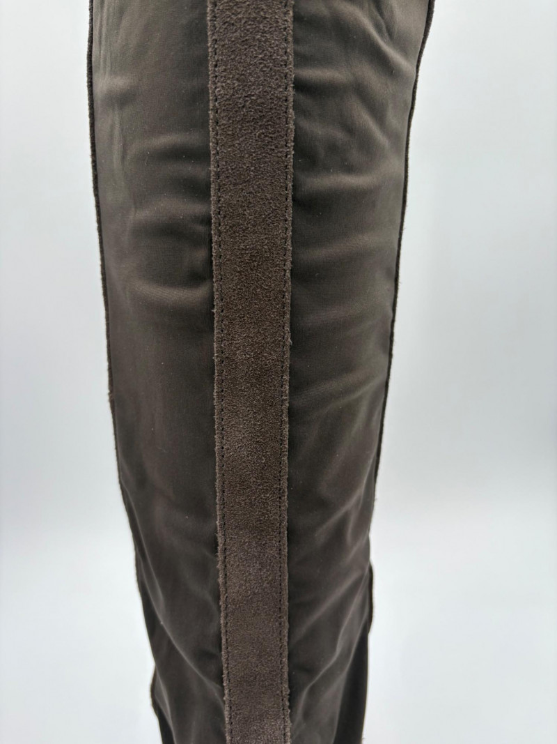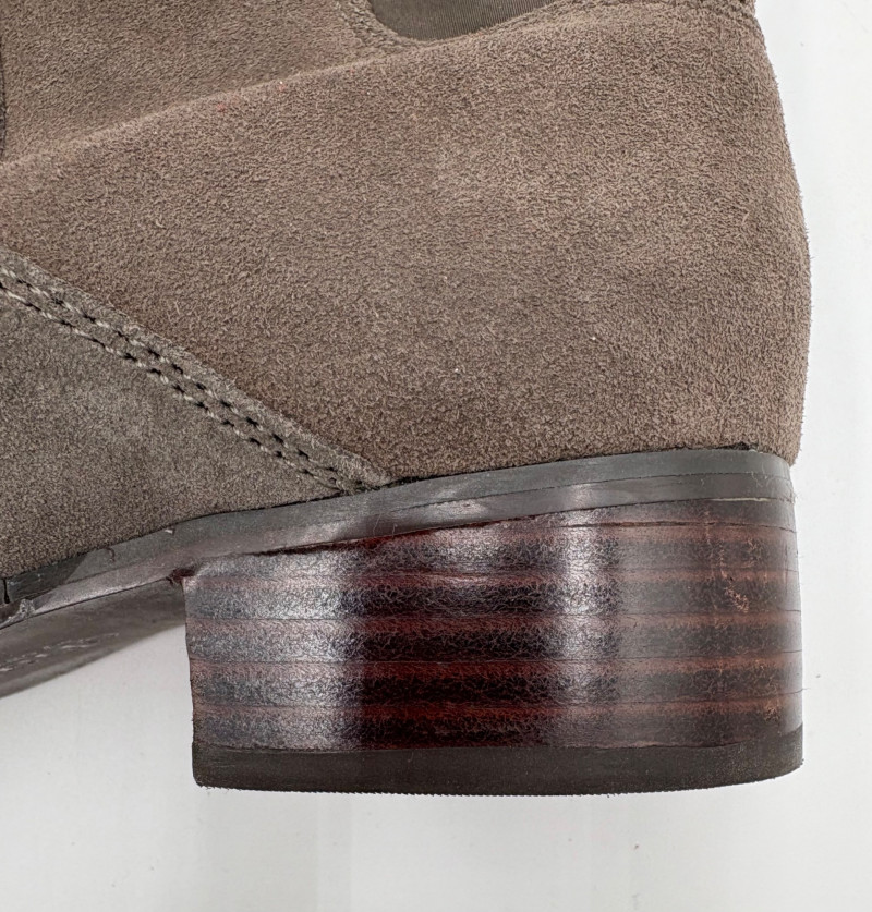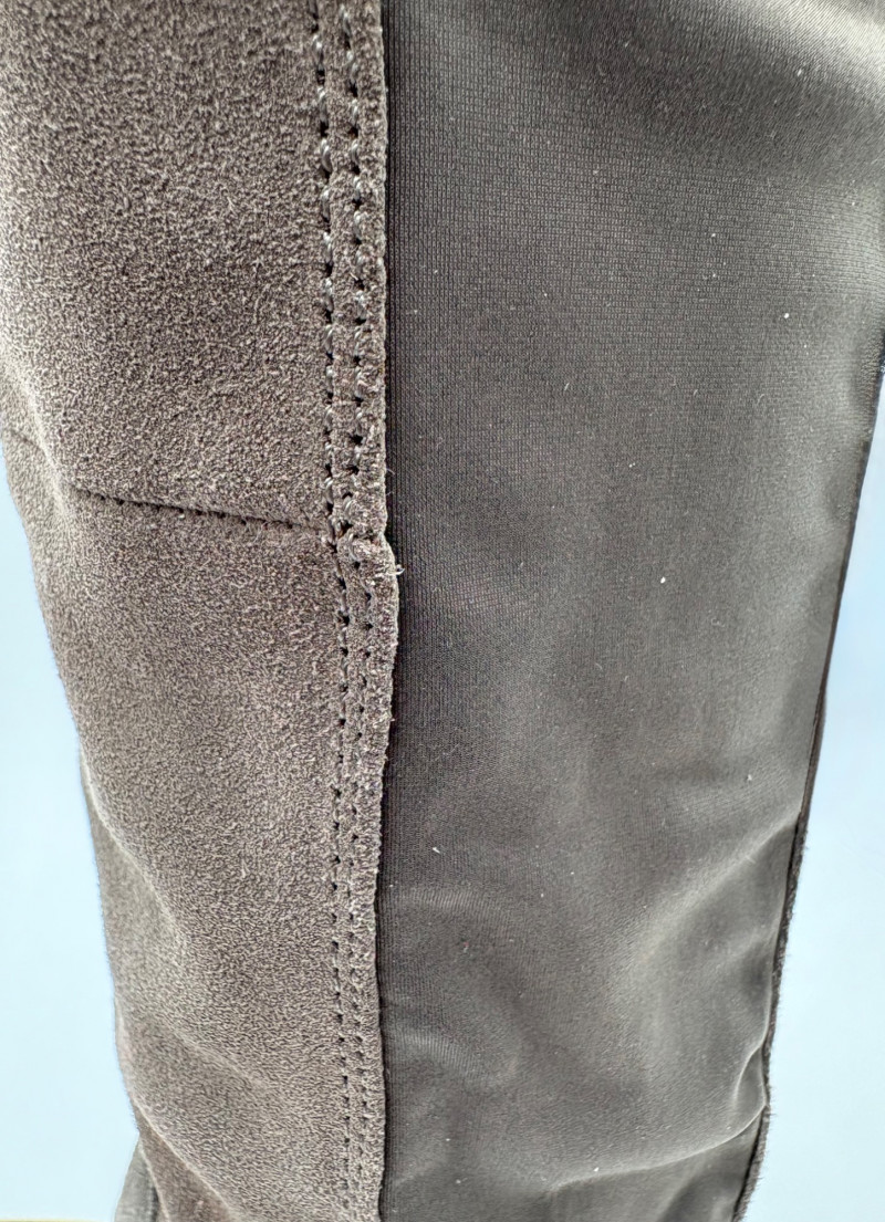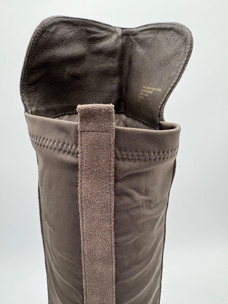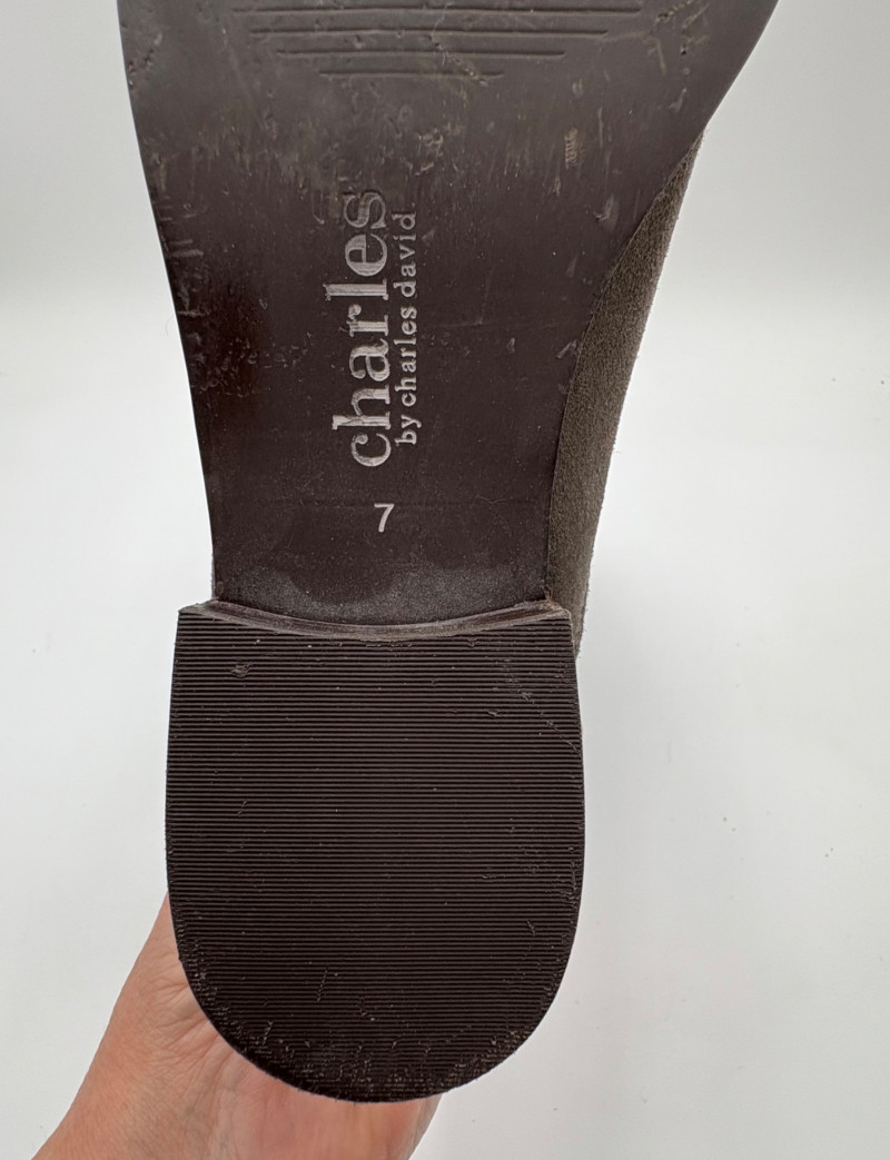 Wonderful over-the-knee boots from Charles David. Boots in soft grey suede with front of shaft extending over kneecap. 2 elastic inserts inside & outside of shaft make for a good fit regardless of calf size. Suede strip up back of calf extending above opening with tab for help putting on. Stacked 1 3/8" heel. Shaft measures 16" from top of heel to top of back elastic section. Knee tab extends approx. 3" above rest of boot. In excellent condition with a few very slight scuffs on heel (too faint to show up in photos). Size 7