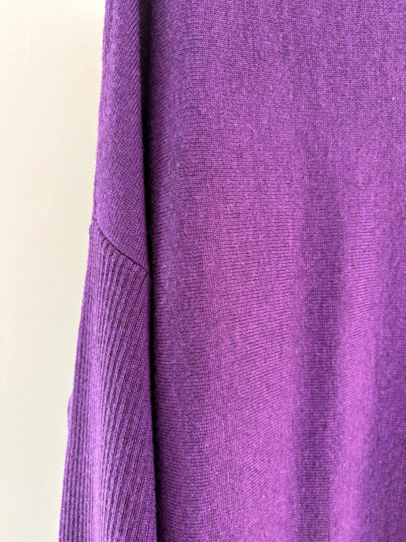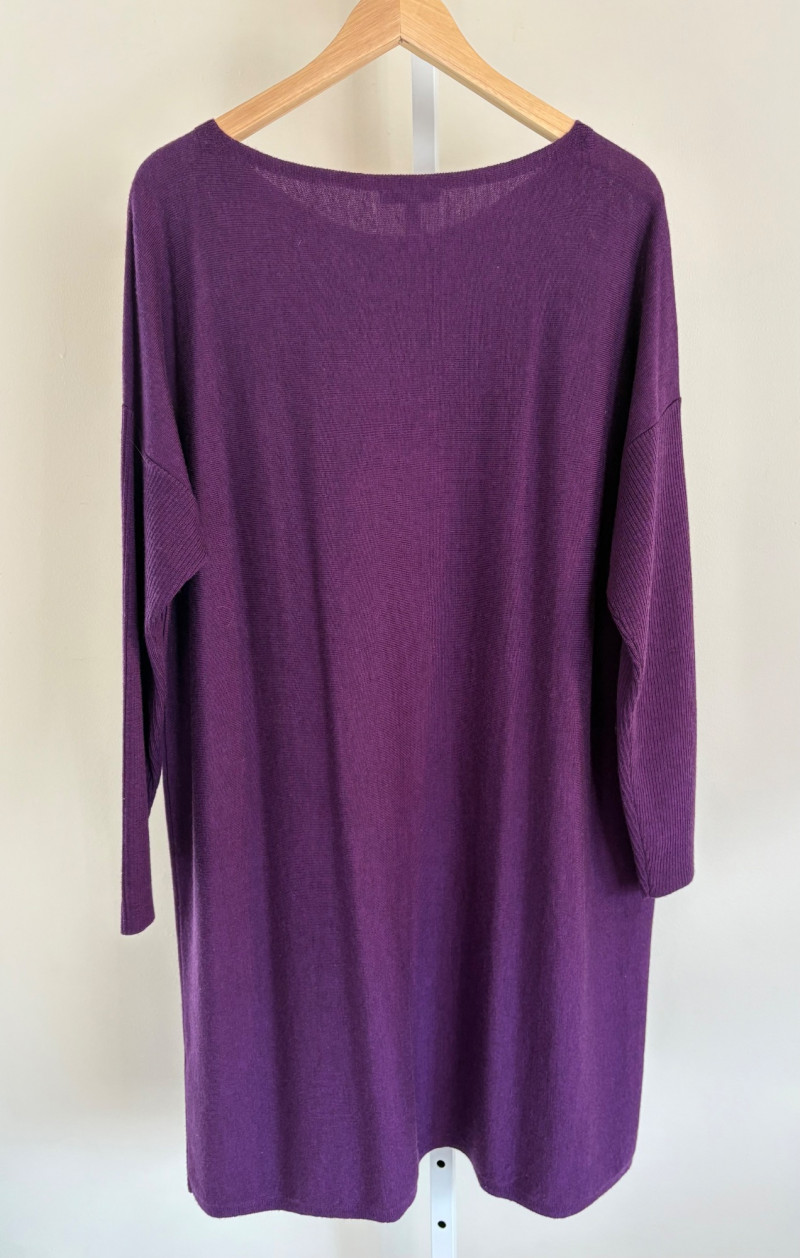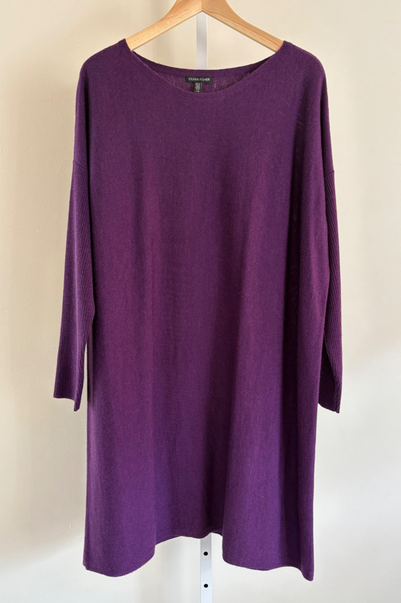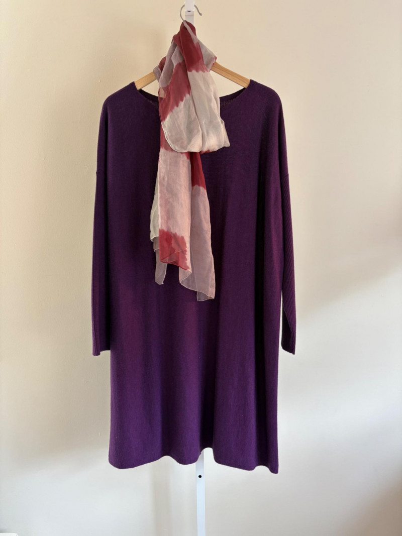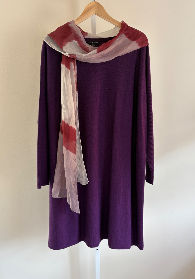 Versatile dress from Eileen Fisher & scarf from unknown maker. Gorgeous purple sweater dress from Eileen Fisher has dropped shoulder seams and ribbed neck & sleeves. In excellent condition. 100% merino wool. Measures 26" pit to pit and 37" from center back neck to back hemline. Size tag says L/G. Light scarf with burgundy, ivory, and pale purple wash of color. No maker or fabric tag, but feels like at least partially silk. Measures approx. 18" x 74".