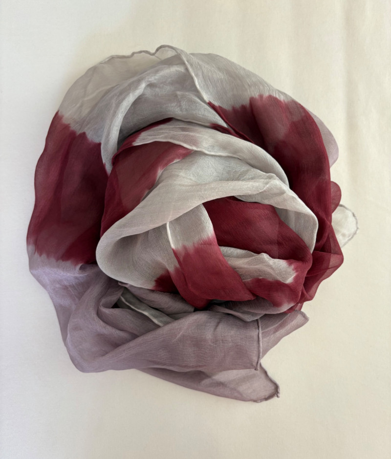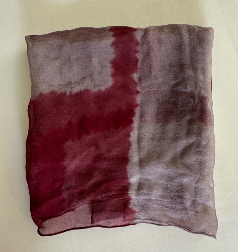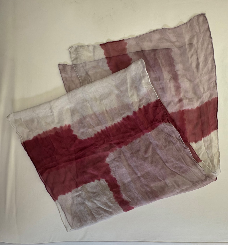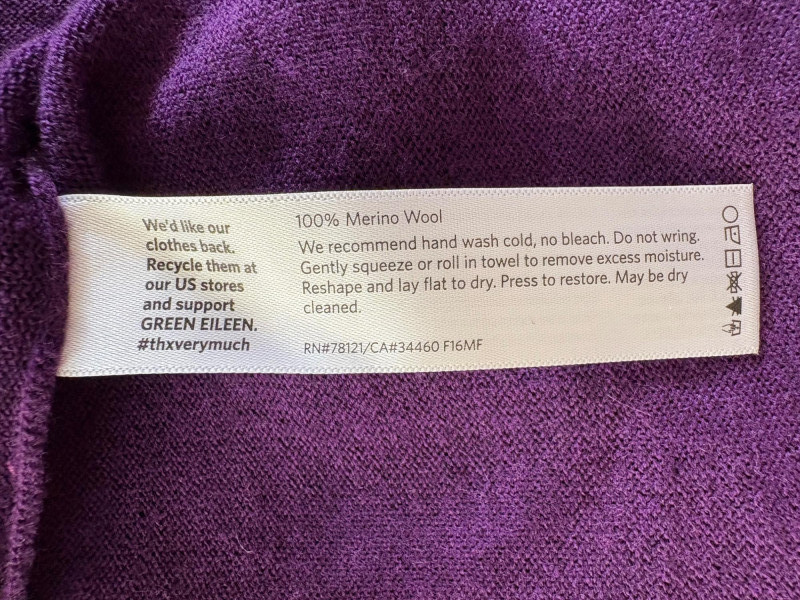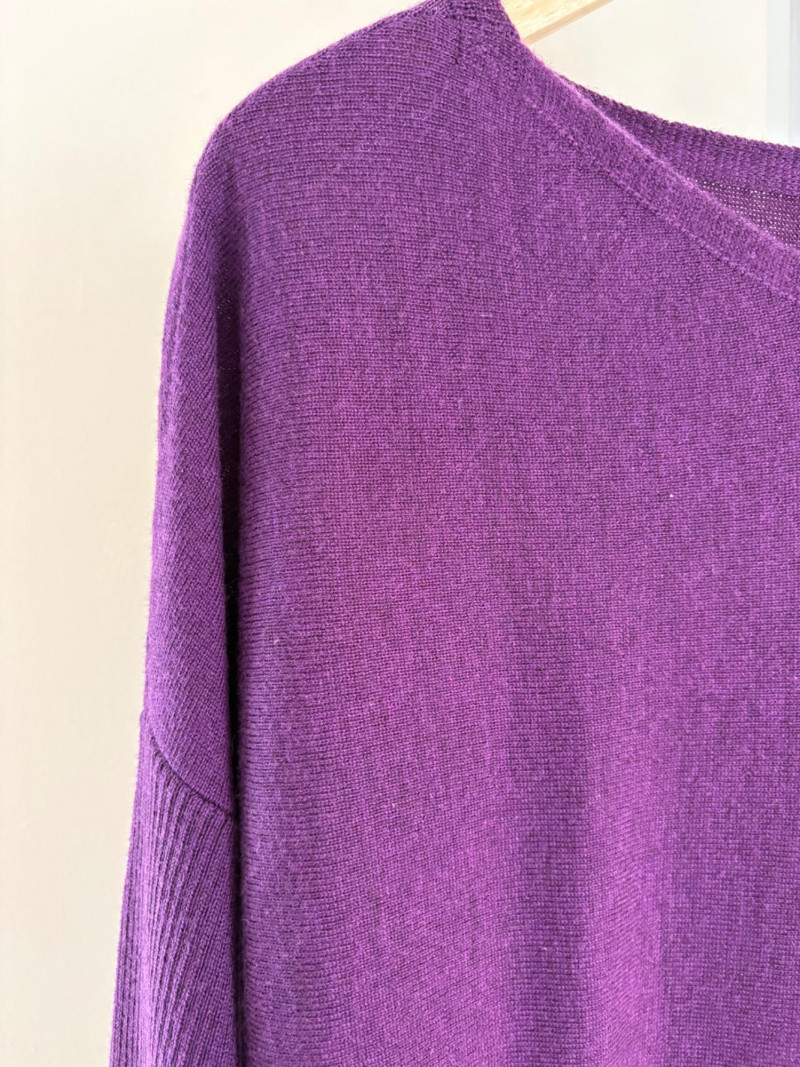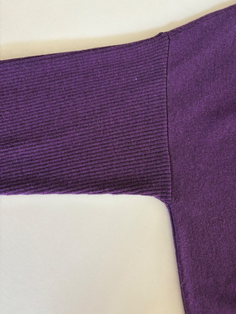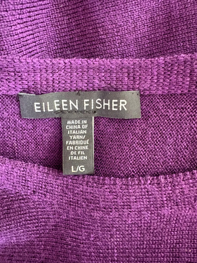 Versatile dress from Eileen Fisher & scarf from unknown maker. Gorgeous purple sweater dress from Eileen Fisher has dropped shoulder seams and ribbed neck & sleeves. In excellent condition. 100% merino wool. Measures 26" pit to pit and 37" from center back neck to back hemline. Size tag says L/G. Light scarf with burgundy, ivory, and pale purple wash of color. No maker or fabric tag, but feels like at least partially silk. Measures approx. 18" x 74".