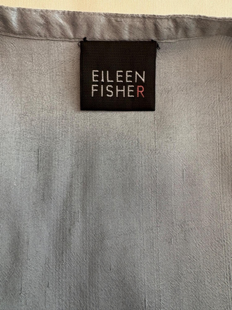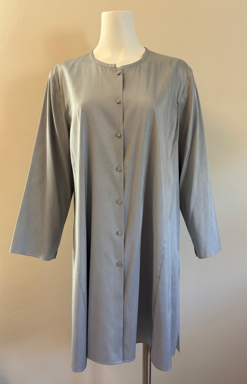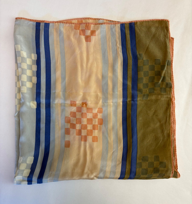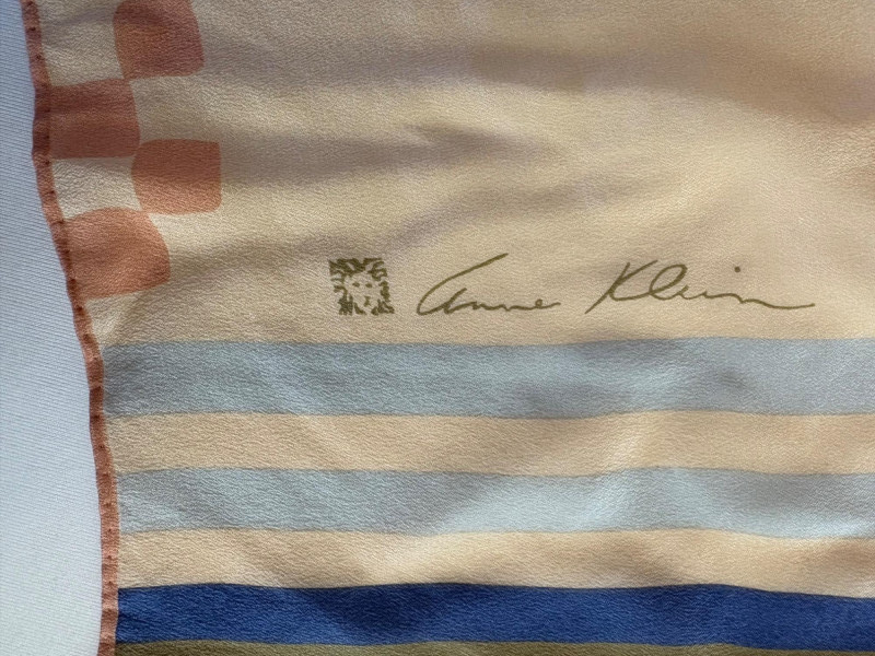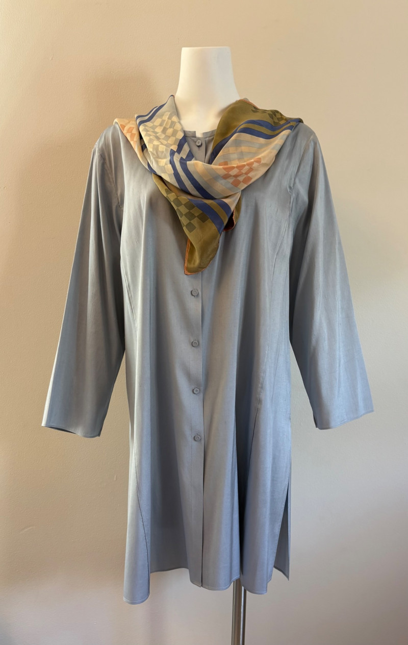 Stunning pale blue thigh-length tunic from Eileen Fisher personifies understated elegance with lovely lines. Button close front with self-covered buttons, princess seams, mandarin collar, long split hem sleeves, and split lower hem. . In excellent condition. 100% silk. Measures 23" pit to pit and 35.5" from back neckline to bottom back hem. Size tag is missing. Soft multi-hued scarf from Anne Klein has geometric stripes & checkerboard pattern. In good condition with some slight discoloration on beige section - see last photo - will probably launder out. Fabric tag is missing, but it feels like 100% silk. Measures approx. 29" square.