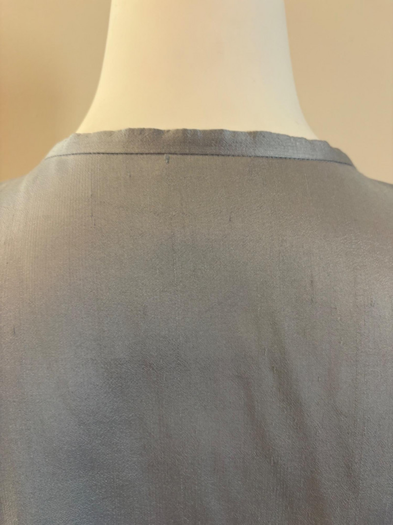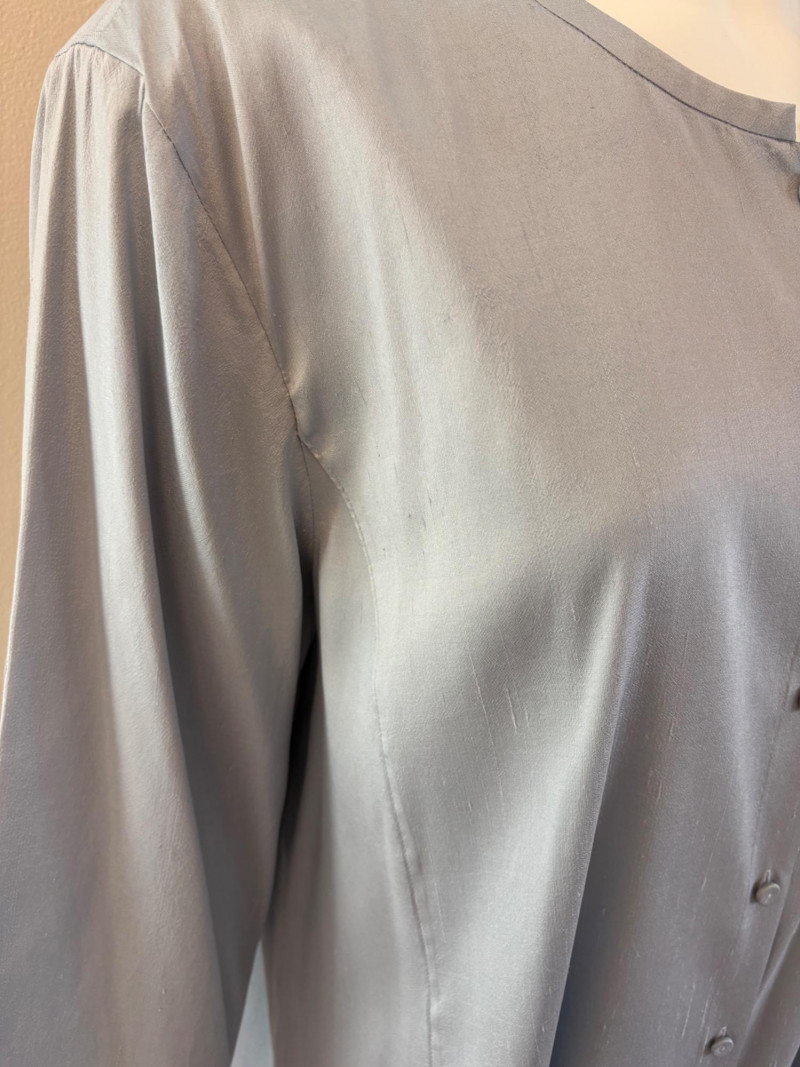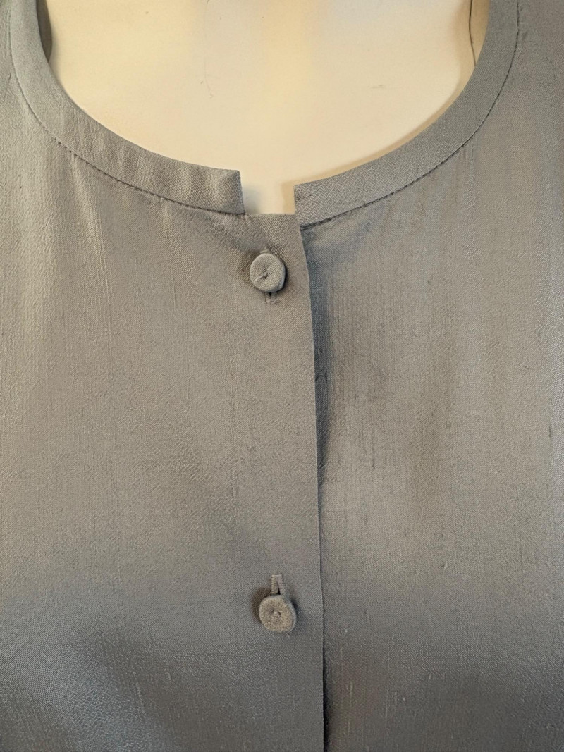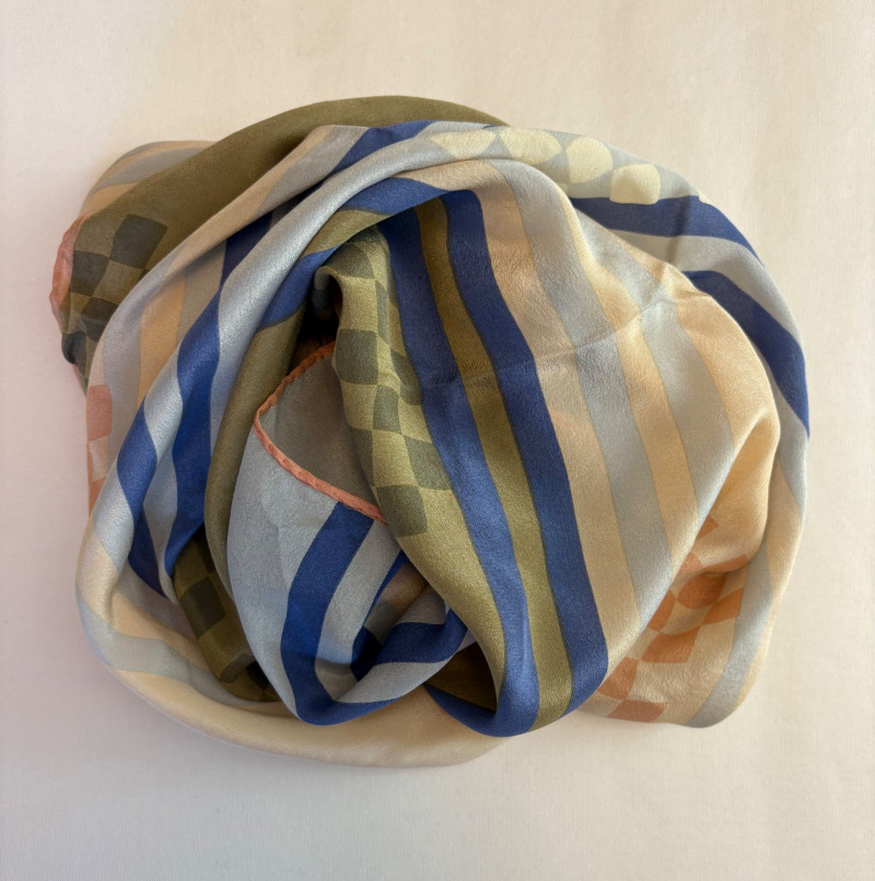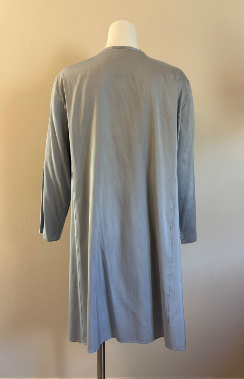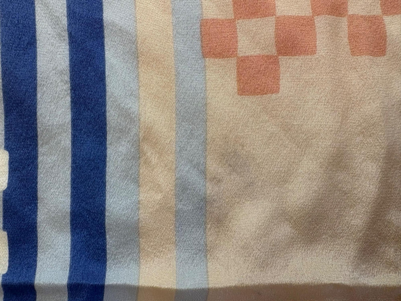 Stunning pale blue thigh-length tunic from Eileen Fisher personifies understated elegance with lovely lines. Button close front with self-covered buttons, princess seams, mandarin collar, long split hem sleeves, and split lower hem. . In excellent condition. 100% silk. Measures 23" pit to pit and 35.5" from back neckline to bottom back hem. Size tag is missing. Soft multi-hued scarf from Anne Klein has geometric stripes & checkerboard pattern. In good condition with some slight discoloration on beige section - see last photo - will probably launder out. Fabric tag is missing, but it feels like 100% silk. Measures approx. 29" square.