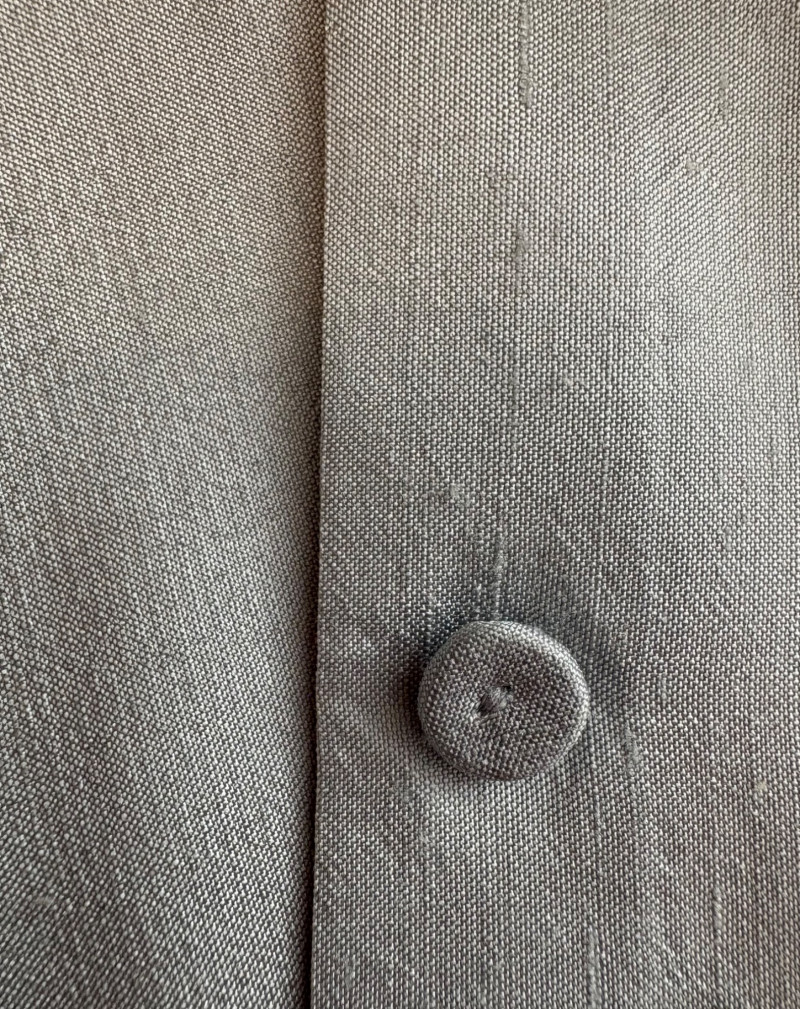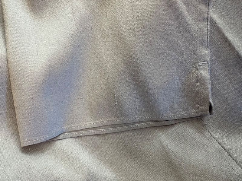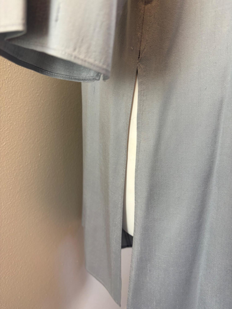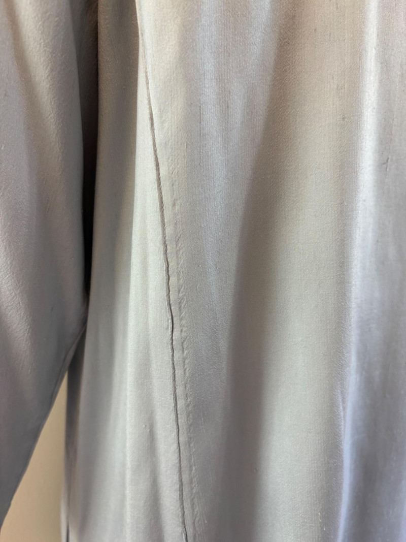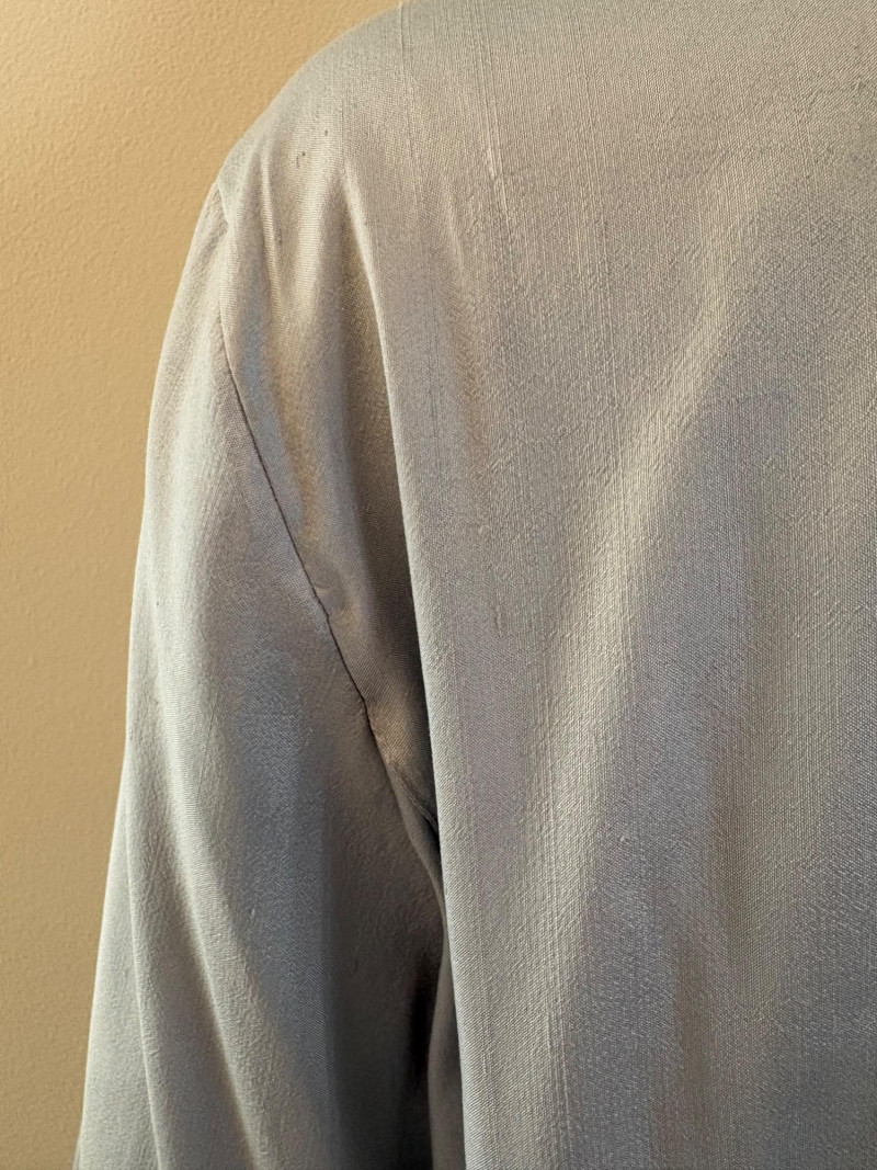 Stunning pale blue thigh-length tunic from Eileen Fisher personifies understated elegance with lovely lines. Button close front with self-covered buttons, princess seams, mandarin collar, long split hem sleeves, and split lower hem. . In excellent condition. 100% silk. Measures 23" pit to pit and 35.5" from back neckline to bottom back hem. Size tag is missing. Soft multi-hued scarf from Anne Klein has geometric stripes & checkerboard pattern. In good condition with some slight discoloration on beige section - see last photo - will probably launder out. Fabric tag is missing, but it feels like 100% silk. Measures approx. 29" square.
