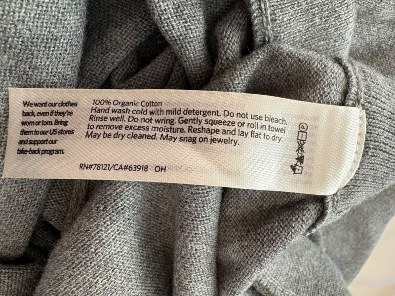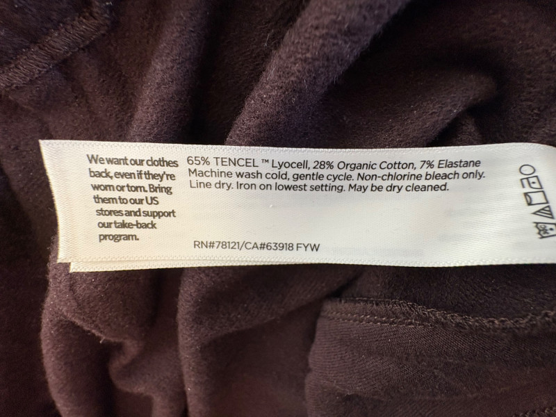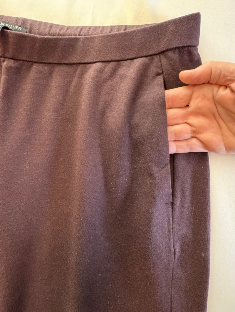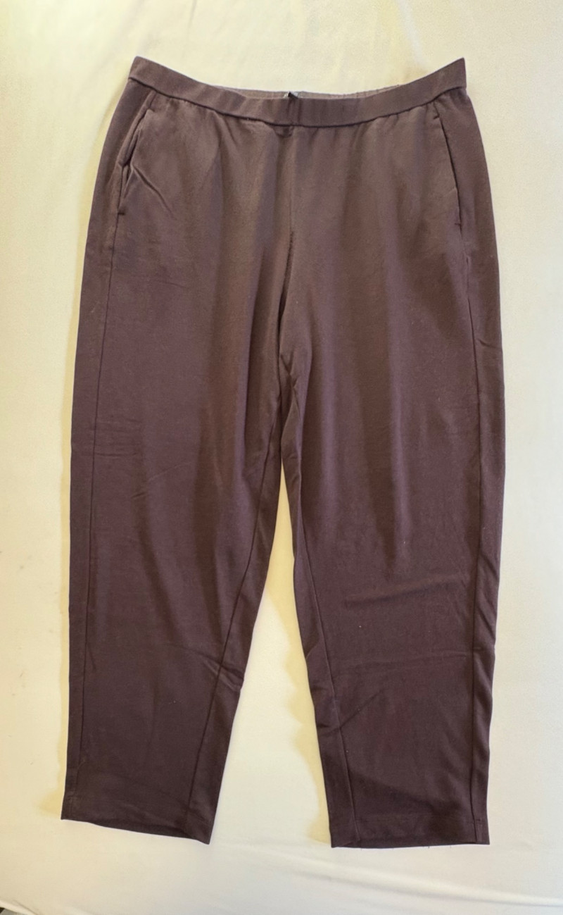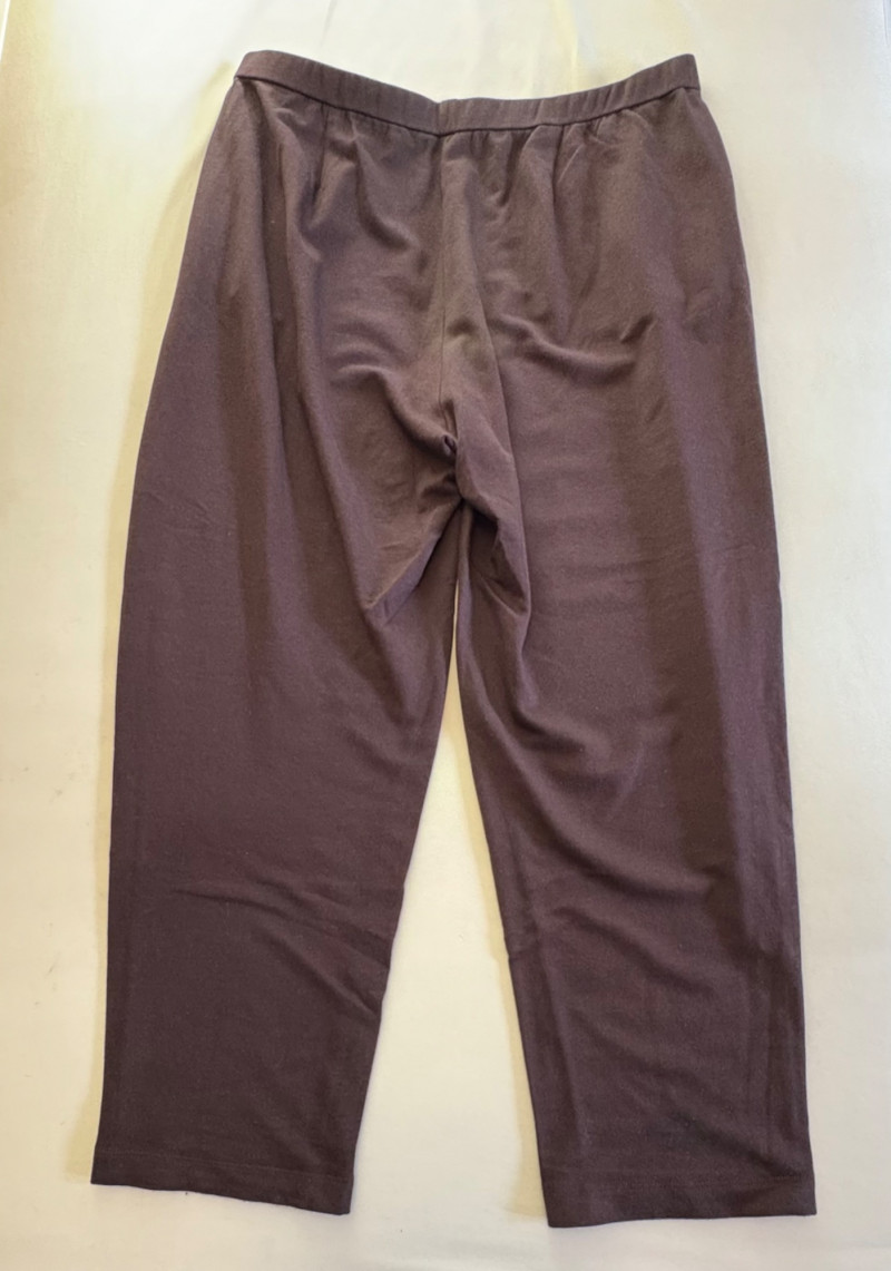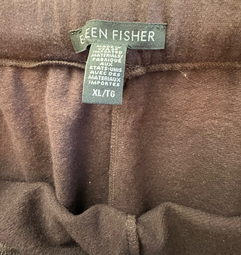 Two wonderful pairs of knit pants from Eileen Fisher in chocolate brown & light grey. This lot is a good example of why we put in measurements - both pants measure the same in the waist, but have different size tags on them! Light grey pair has elasticated waistband and wide legs. In excellent condition. 100% cotton. Measure 18.5" side to side at waist with 25" inseam. Size tag says L/G. Chocolate brown pair has elasticated waistband, in-seam side pockets, back darts, and tapered legs. 65% Tencel with 28% cotton and 7% elastane. In excellent condition. Measure 18.5" side to side at waist with 27" inseam. Size tag says XL.