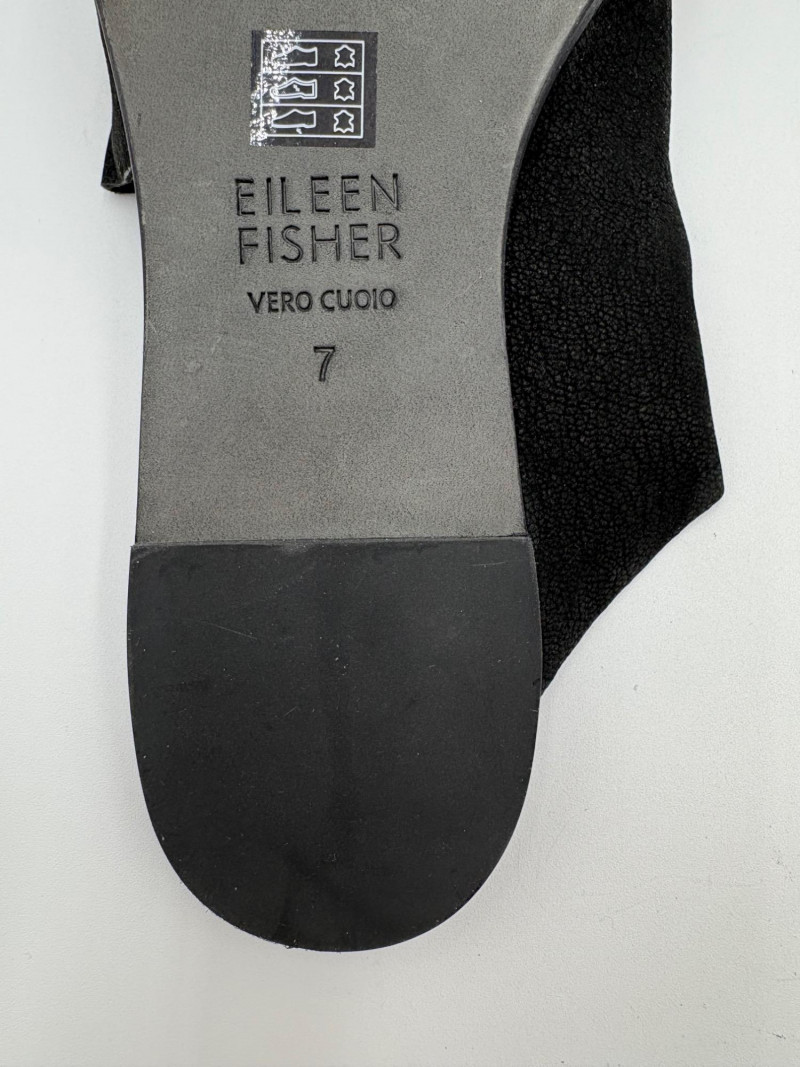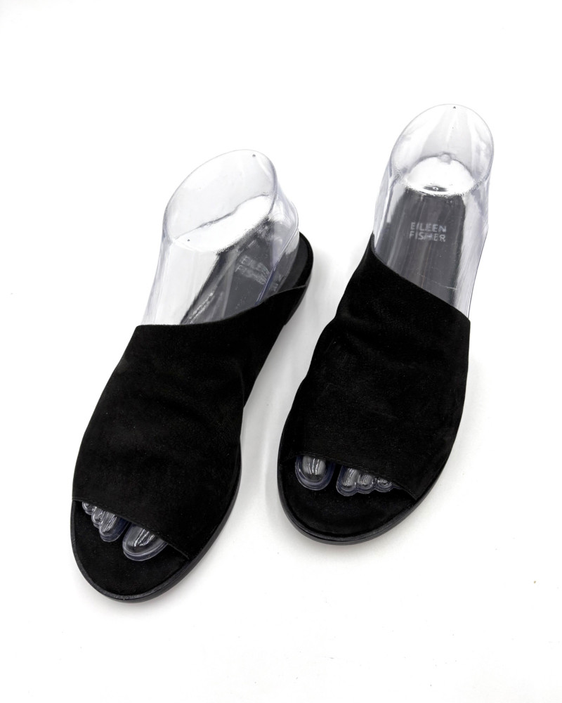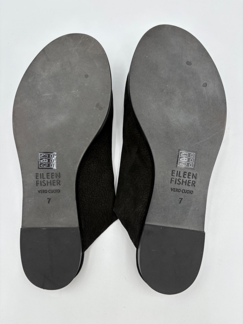 Soft black leather slides from Eileen Fisher. Black leather soles, smooth black leather insole, and soft suede wrap upper. Open toe. Appear to be new with virtually no soiling on soles - probably just worn to try on. Size 7