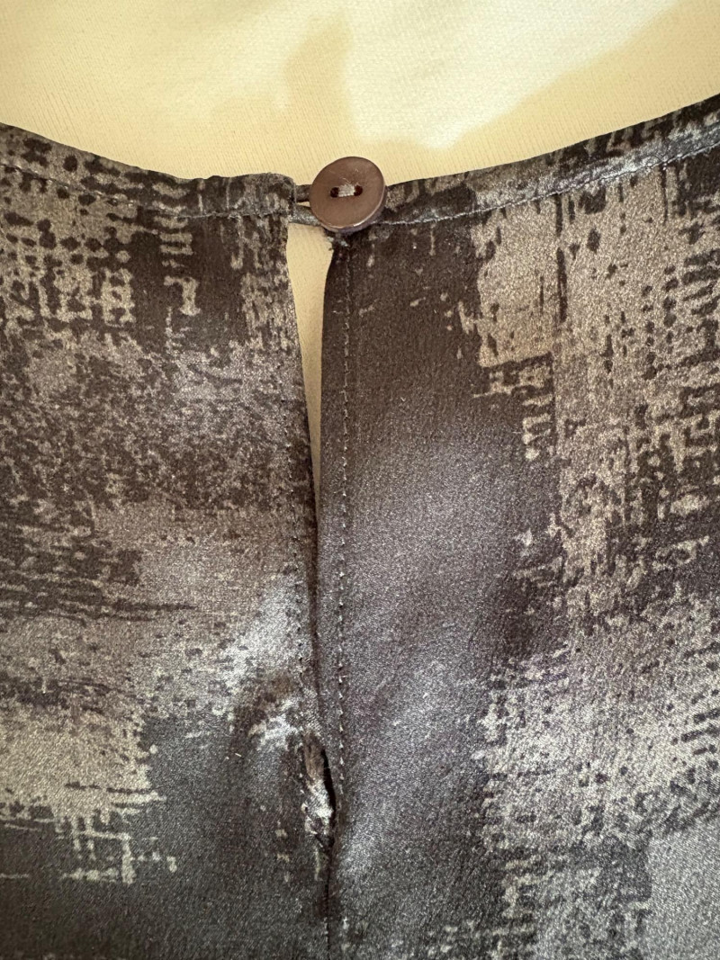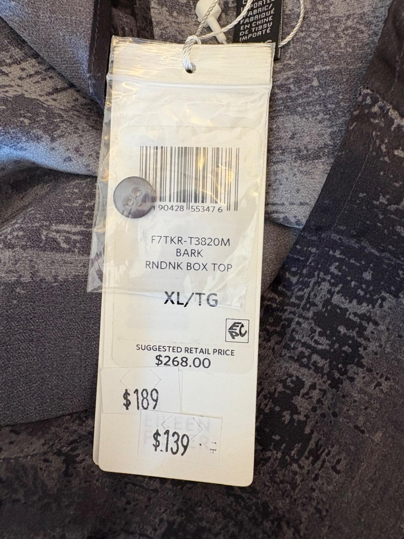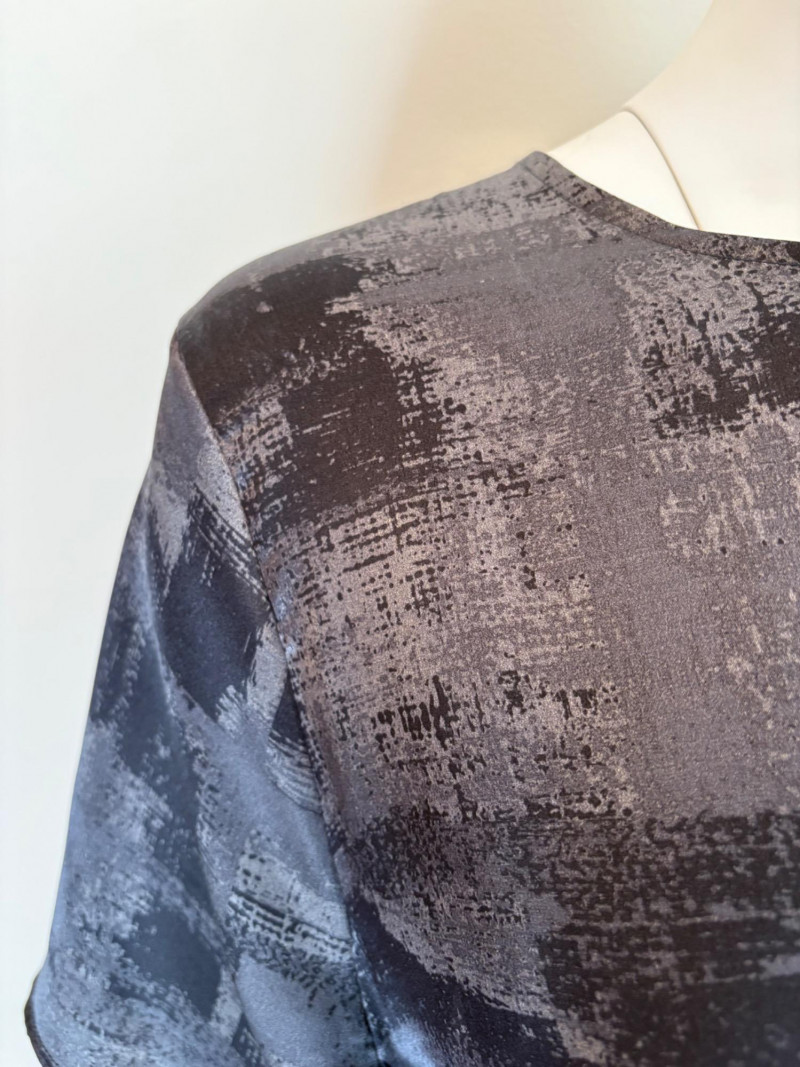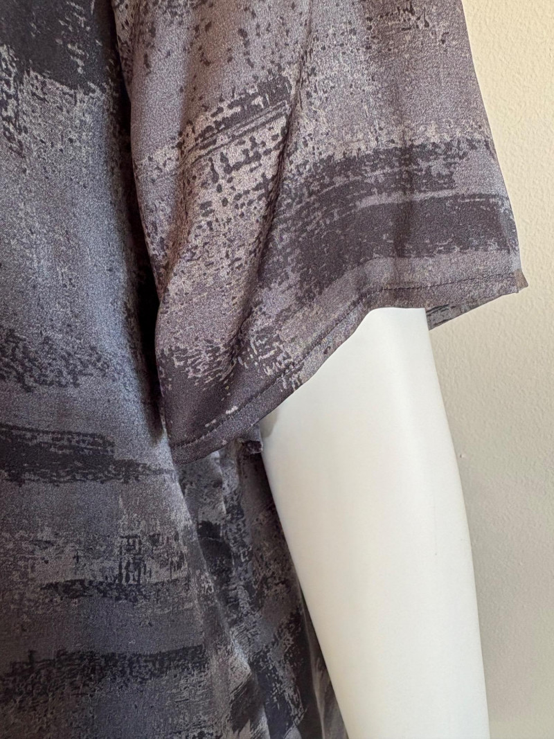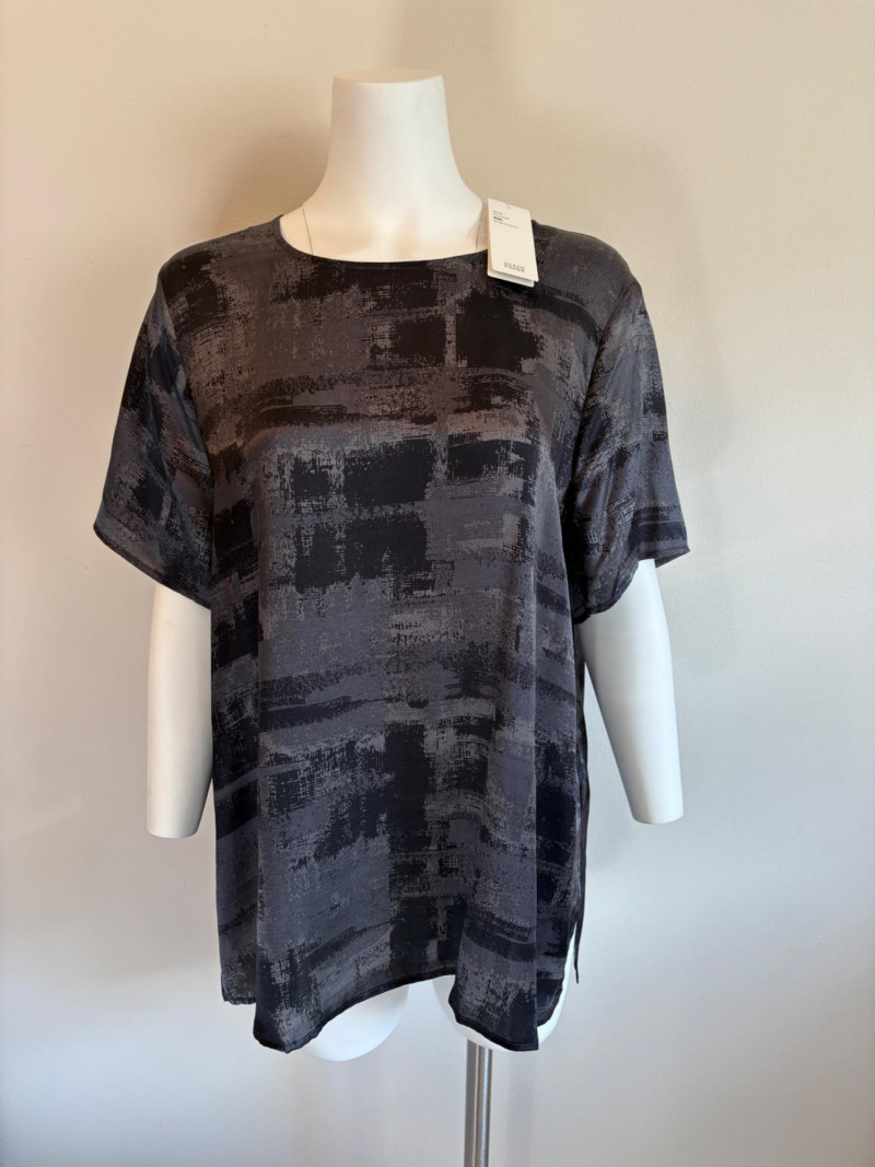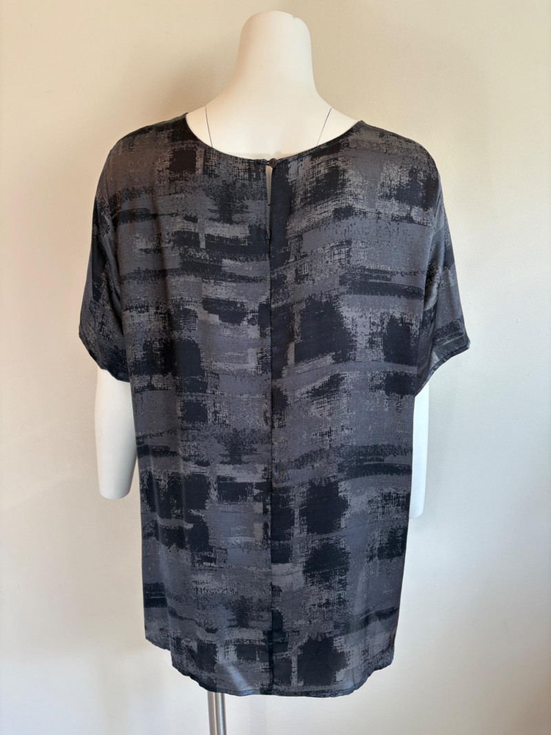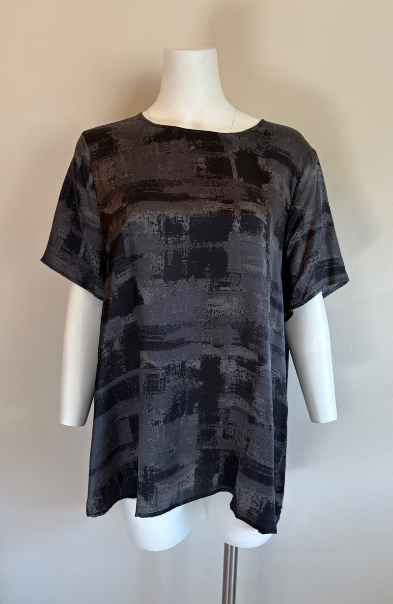 Truly gorgeous grey and black print shirt in 100% silk from Eileen Fisher. Simple scoop neck, single button back neckline closure, short sleeves, and split hem make this a piece that will go with a multitude of pants or skirts. New with tag. Measures 23" pit to pit and 27" from back neckline to back bottom hemline. Size tag says XL.