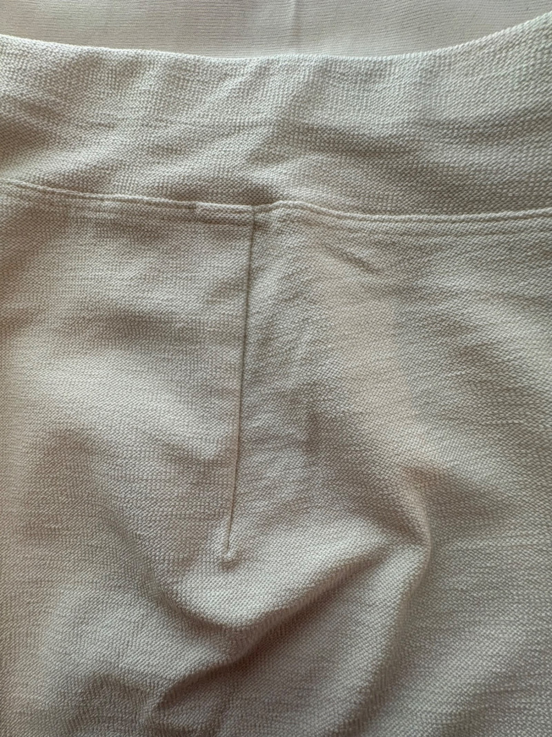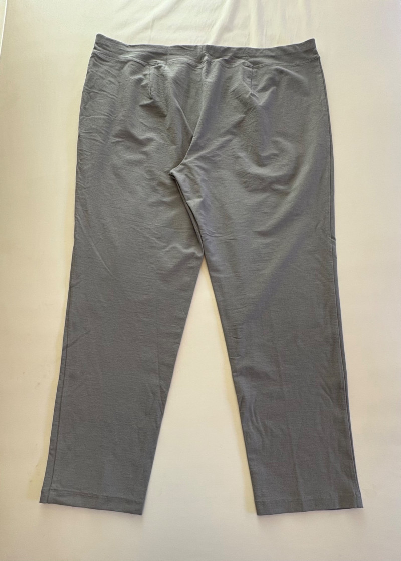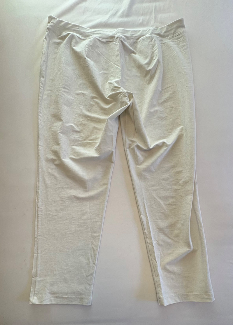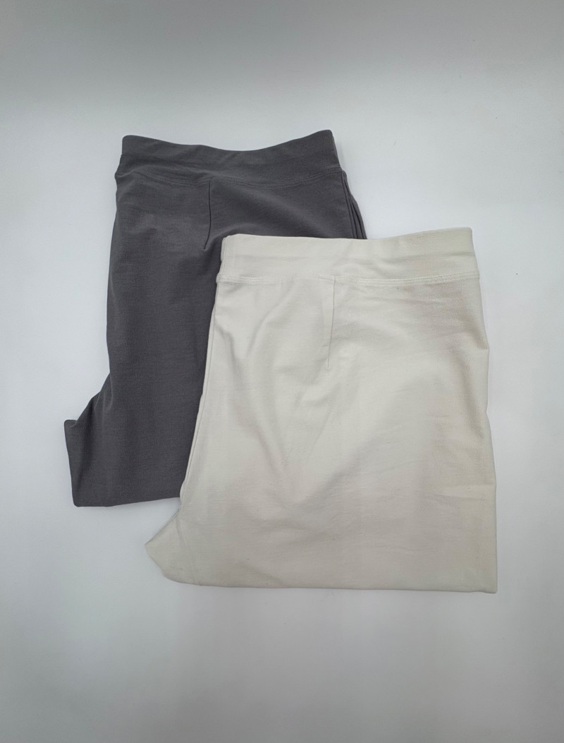Two pairs of slim stretch pants perfect for under a long sweater or larger shirt/jacket. Both pairs have a wide flat elasticated waistband, back waistline hip darts, and a slim leg. Both are in excellent condition and are made of 70% viscose with 24% nylon and 6% spandex. White pair measures 19.5" side to side at waist with 28" inseam. Size tag says XL. Medium grey pair measures 19.5" side to side at waist with 27.5" inseam. Size tag says XL.