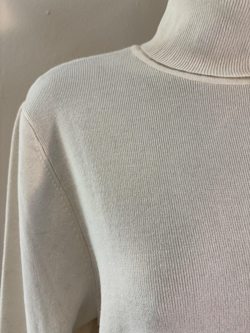 3 turtlenecks from Chico's in smooth super-soft knit made of 75% rayon with 25% polyester. They have a fold over turtleneck, long sleeves, and straight cut in neutral colors of white, black, and tan. All are in excellent condition and measure approximately 20" pit to pit and 24" from back neck seam to hem. Size tags say 3.