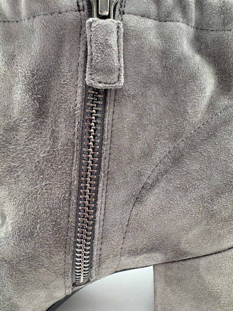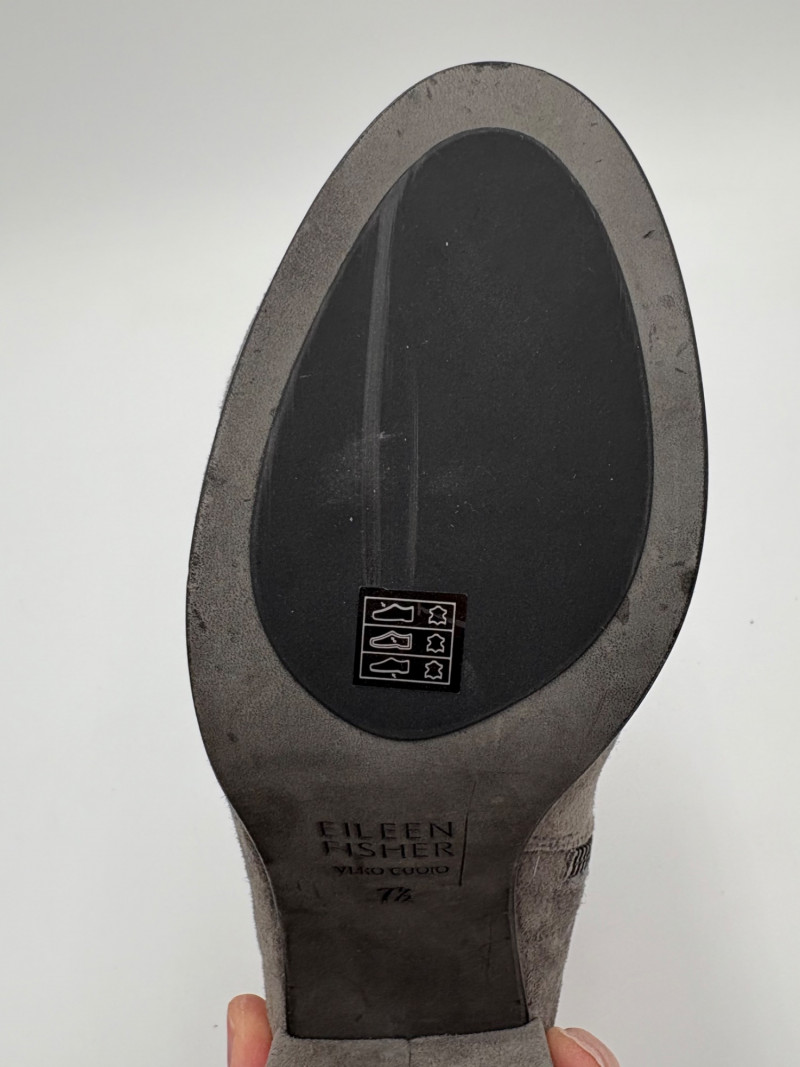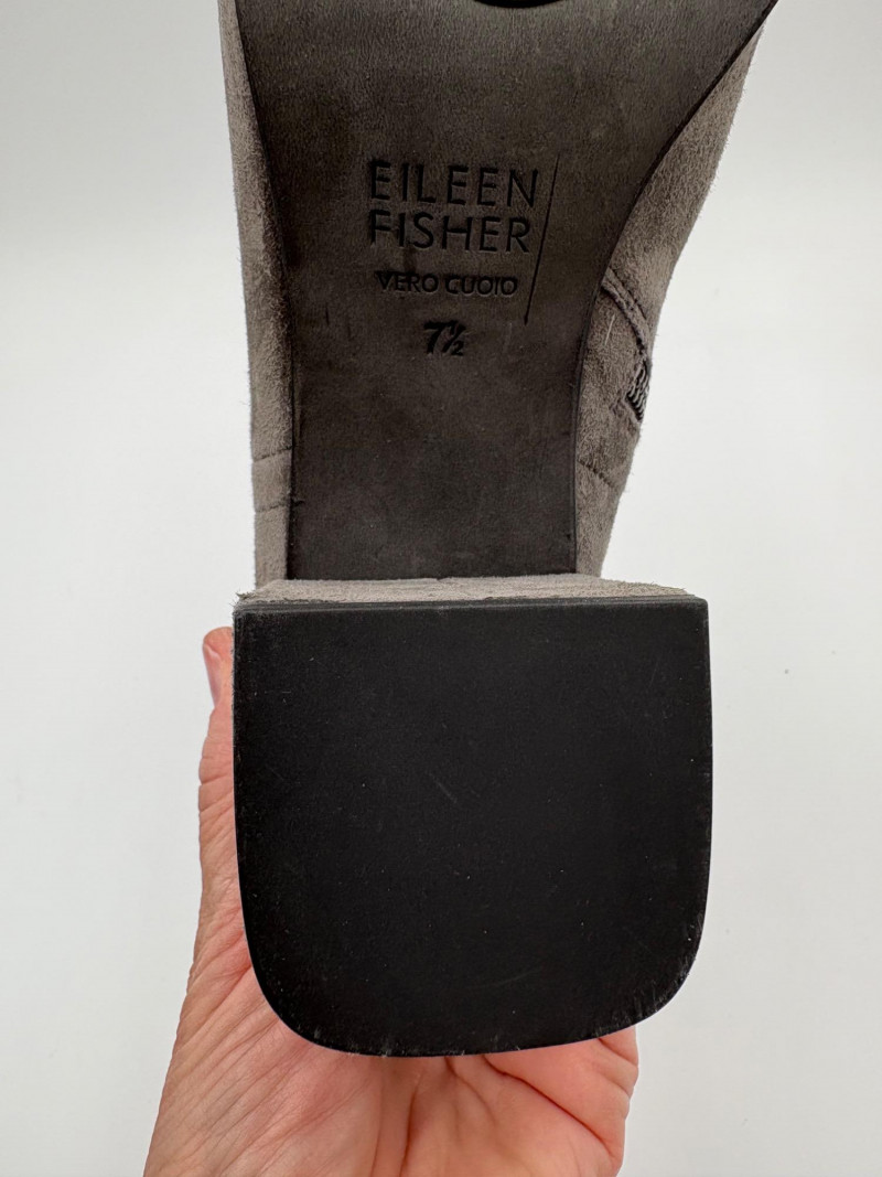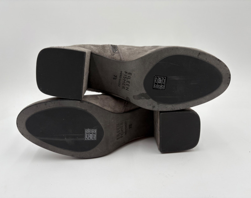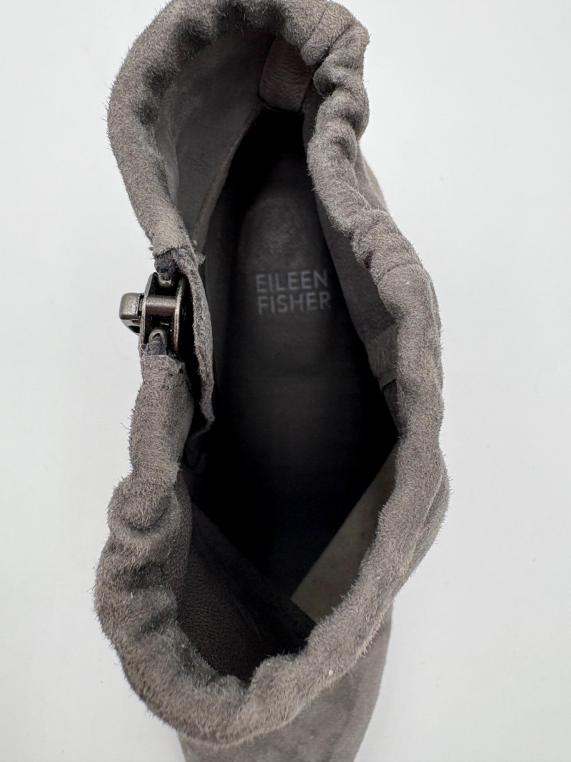 Trendy suede boots with chunky heel from Eileen Fisher. Grey smooth suede uppers, inside zip closure, elasticated top edge, leather sole with non-slip rubber insert, and covered 2.75" heel. We believe they may be new as there is no sign of use on soles or uppers. Size 7.5