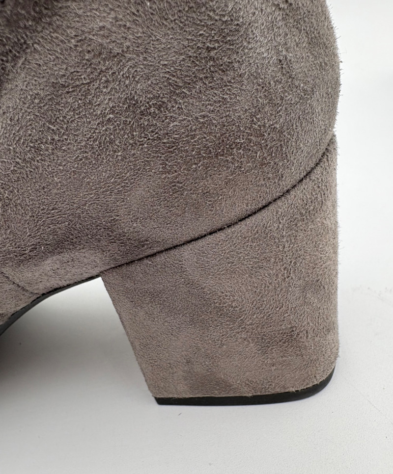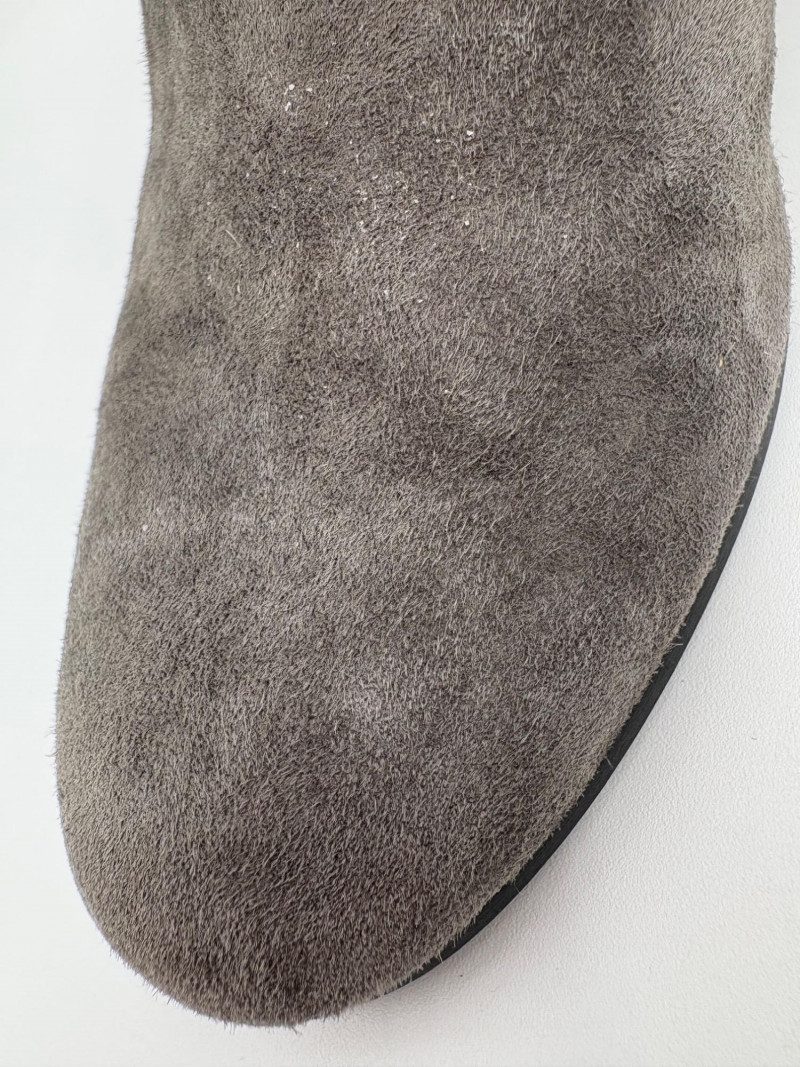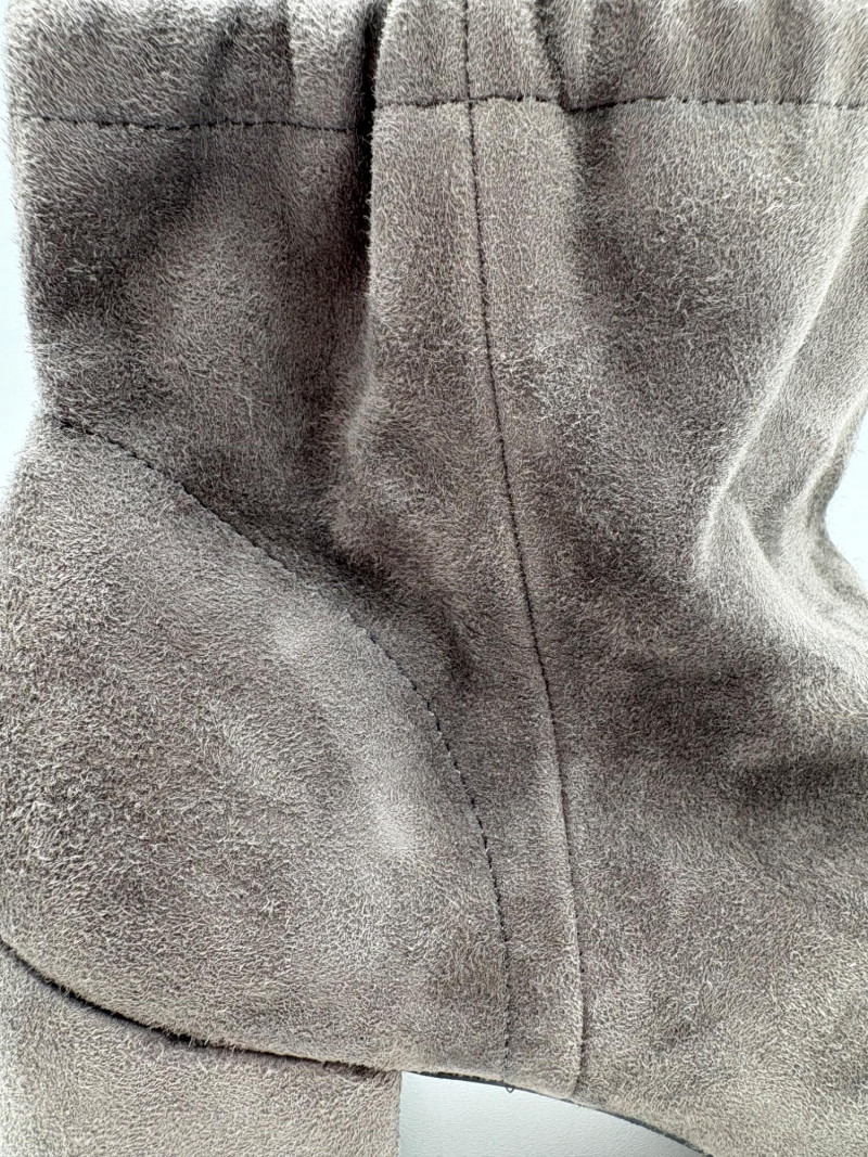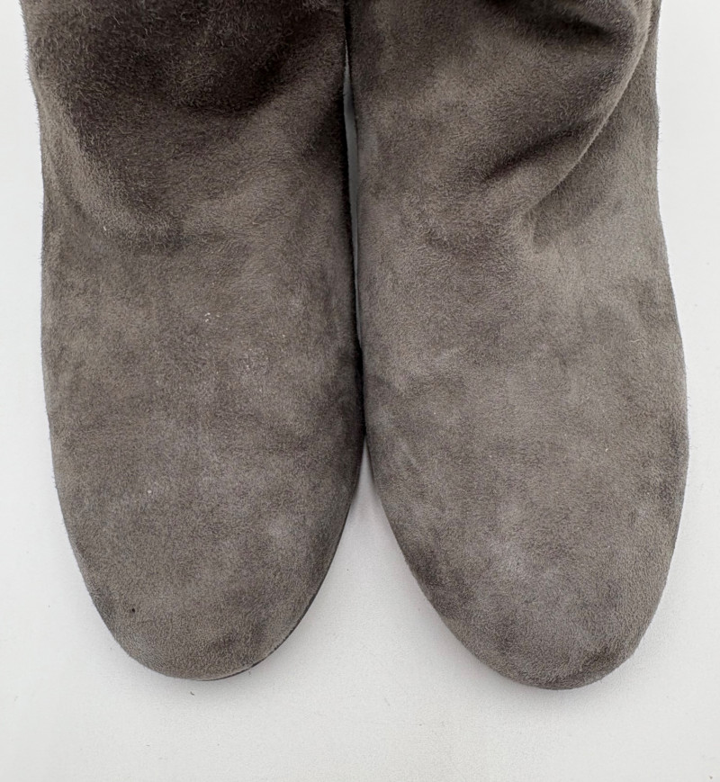 Trendy suede boots with chunky heel from Eileen Fisher. Grey smooth suede uppers, inside zip closure, elasticated top edge, leather sole with non-slip rubber insert, and covered 2.75" heel. We believe they may be new as there is no sign of use on soles or uppers. Size 7.5
