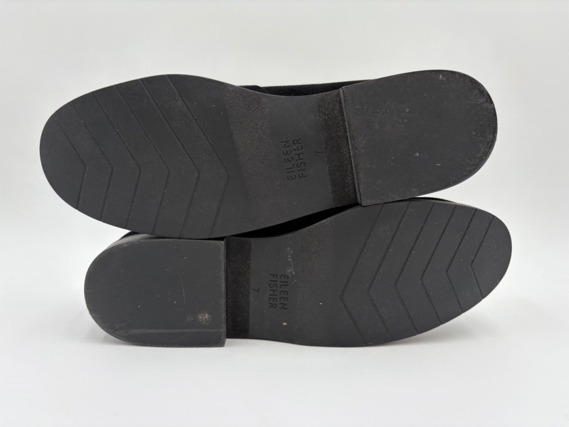Terrific black velvet tuxedo shoes from Eileen Fisher. Black rubber sole, stacked low heel, traditionally styled uppers and small pull tab at heel. In excellent condition with no obvious wear and very little soiling on soles. Size 7