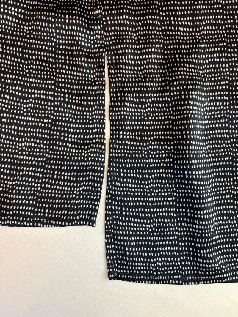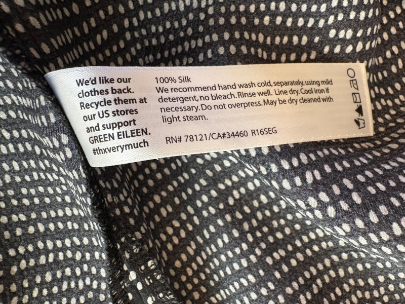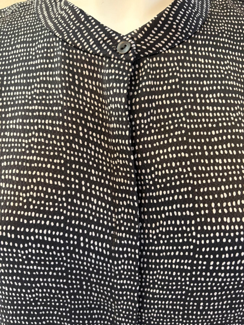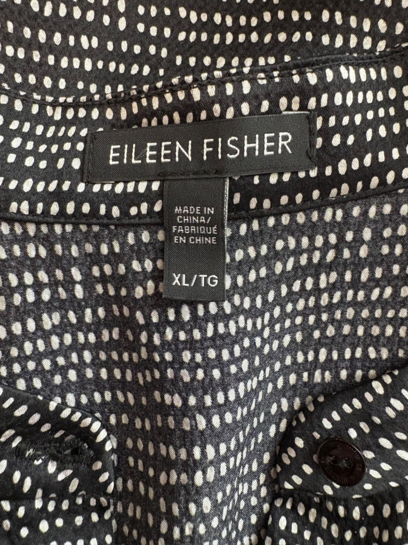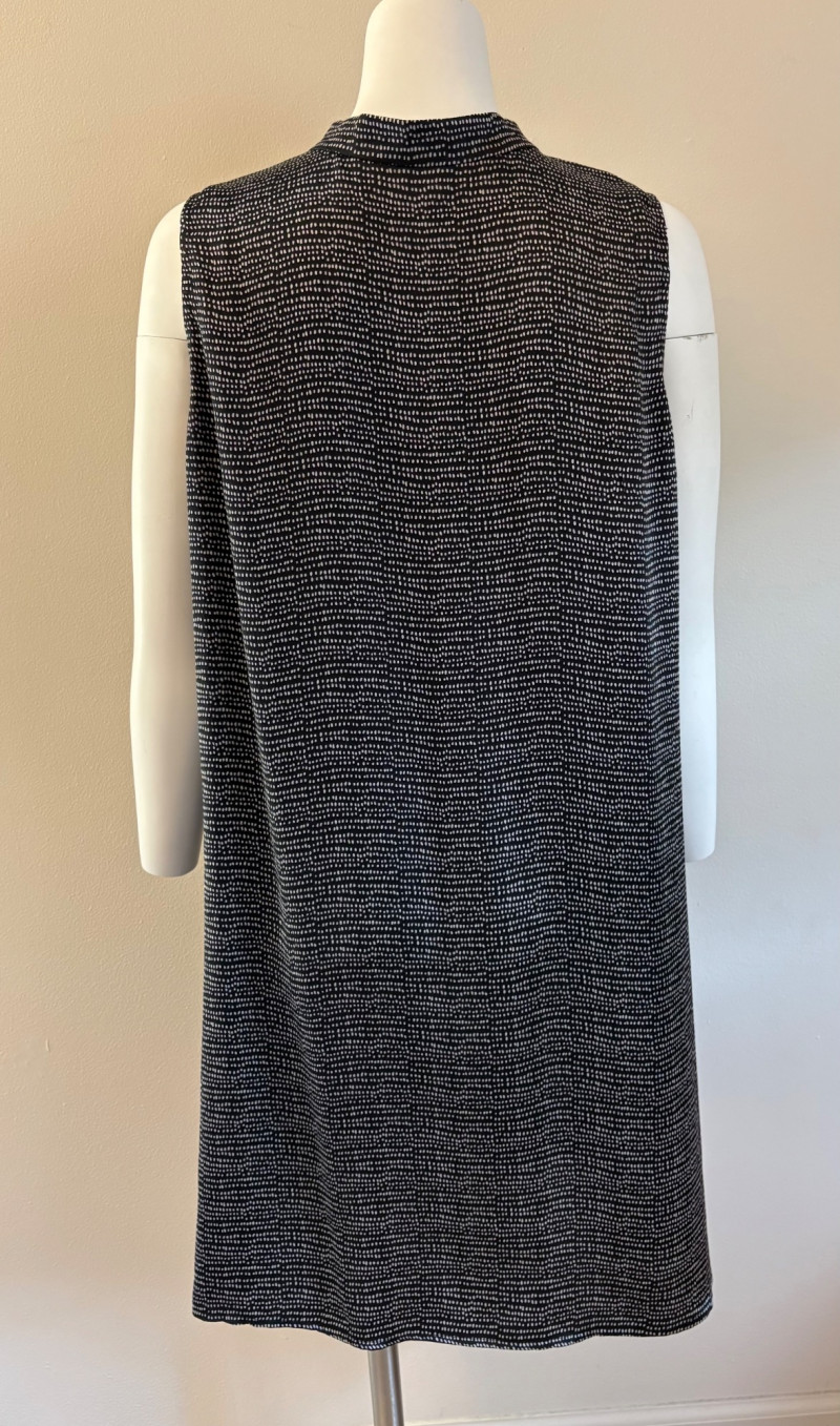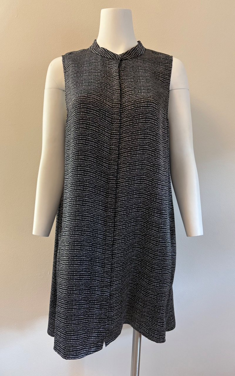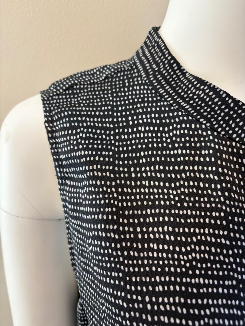 Sleeveless tunic in black with small white dots from Eileen Fisher has front button closure with hidden placket, banded collar, and split hem with back hem approx. 2" longer in the back than front. In excellent condition. 100% silk. Measures 23" pit to pit and 35" from back neckline to bottom back hemline. Size tag says XL