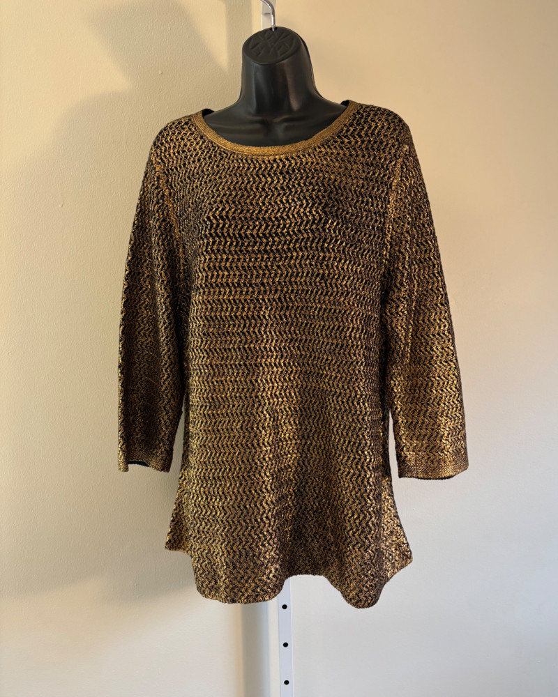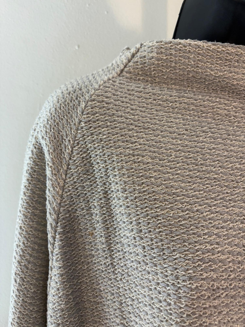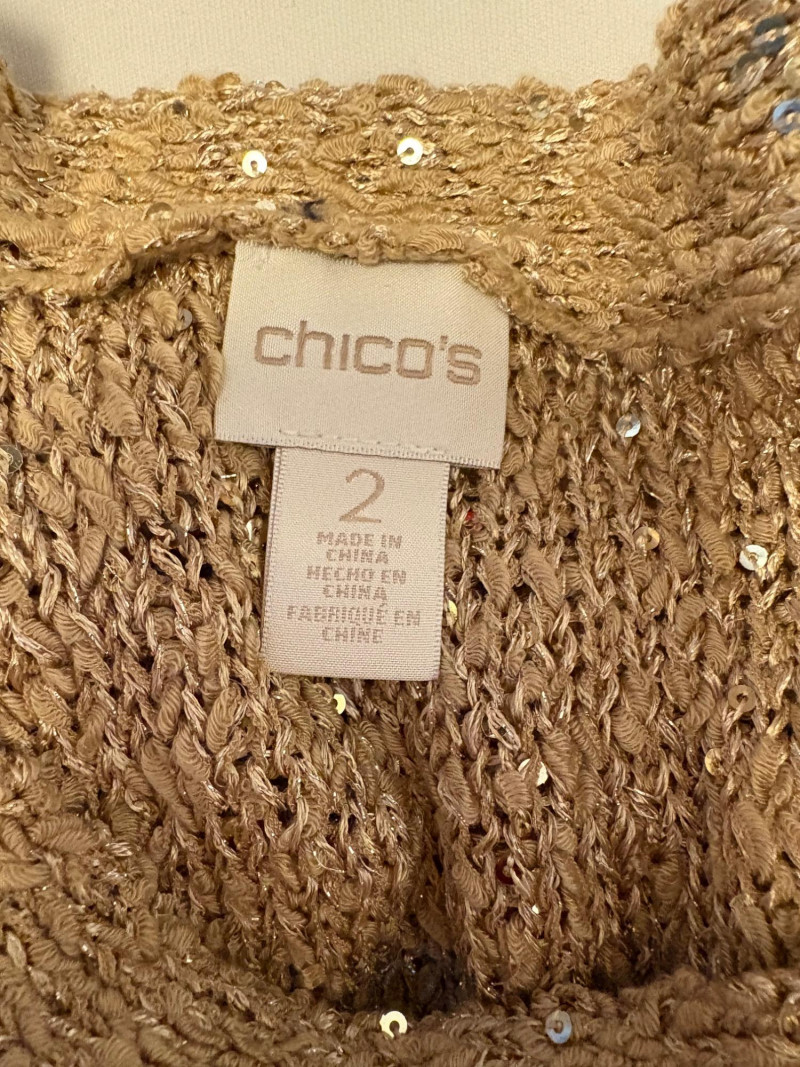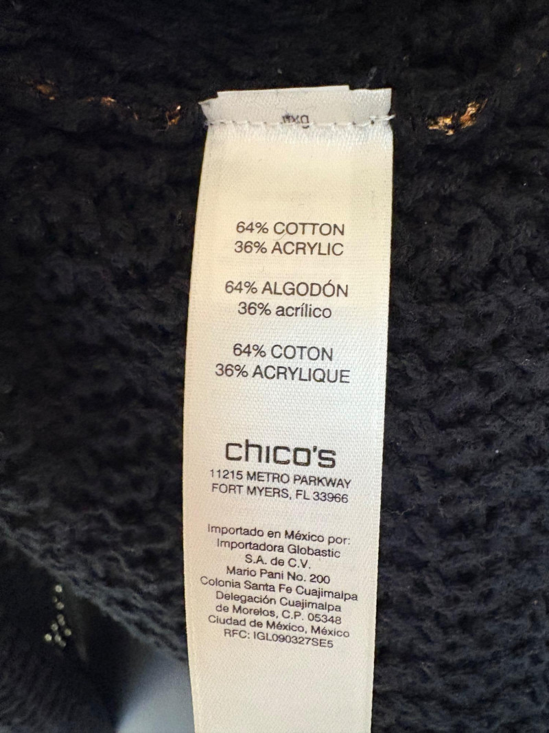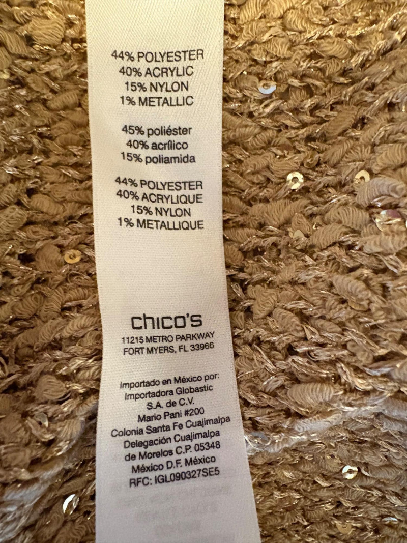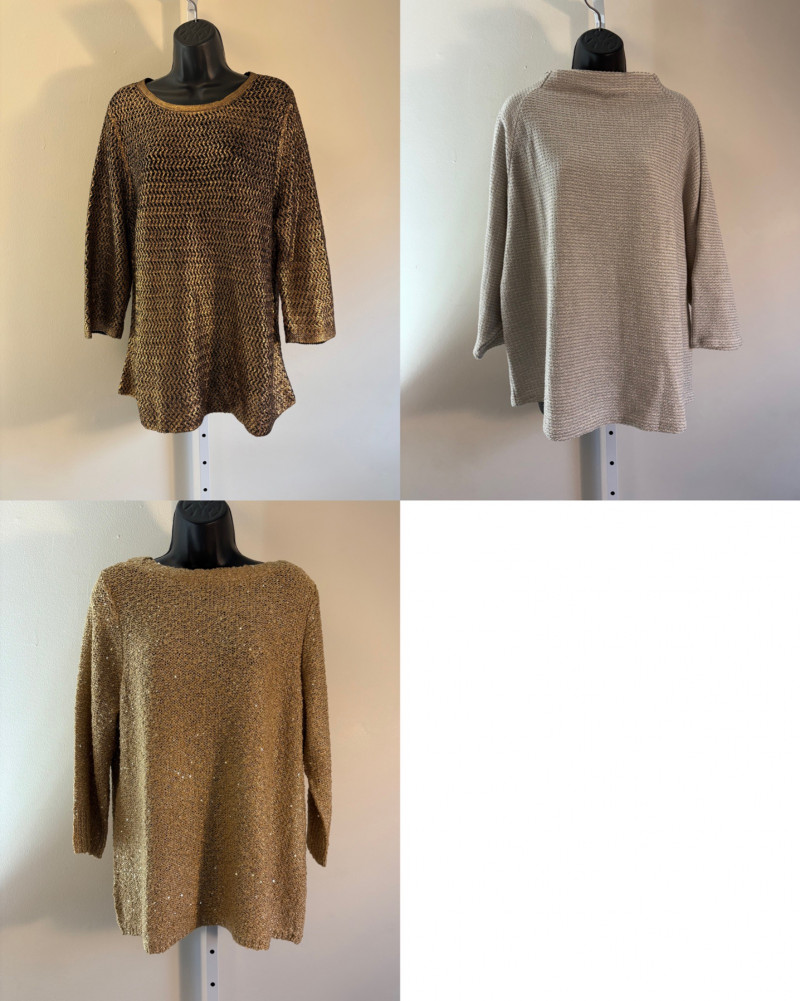 Three special occasion sweaters with a little bit of glitz. All from Chico’s and all in very good used condition Loosely woven gold sweater with gold sequins has wide ribbed cuffs and narrow ribbed hem. 44% polyester, 40% acrylic, 15% nylon, and 1% metallic. Measures 22.5" pit to pit and 25" from back neckline to bottom hem. Size tag says 3. Black and gold zigzag sweater has ribbed neckline and cuffs. 64% cotton with 38% acrylic. Measures 23" pit to pit and 26.5" from back neckline to hem. Size tag says 4. Funnel neck sweater has raglan sleeves in a gray & cream knit with small bits of silver thread. 90% cotton and 8% polyester with 2% other fibers. Measures 24.5" pit to pit and 27" from back neckline to hem. Size tag says 3. We noticed a small spot near the right sleeve, but believe it will launder out - see last photo.