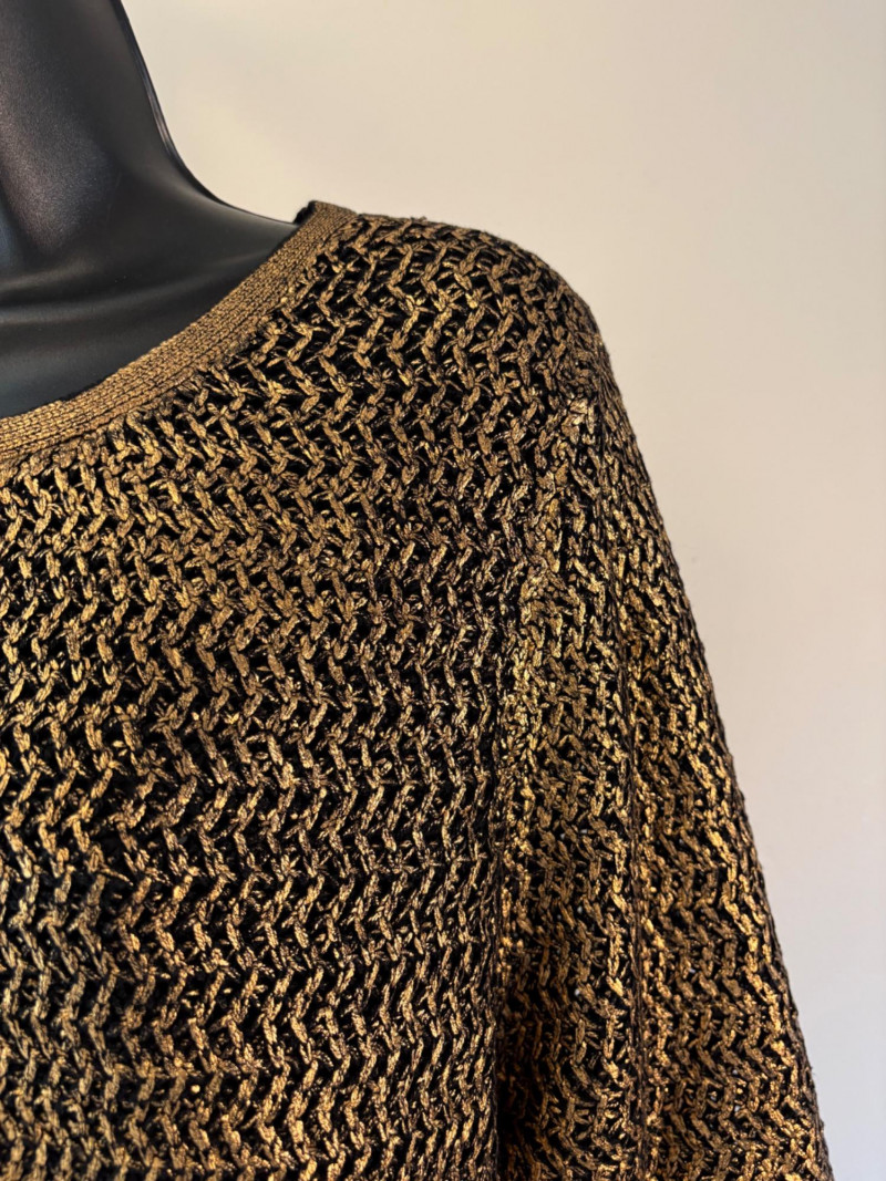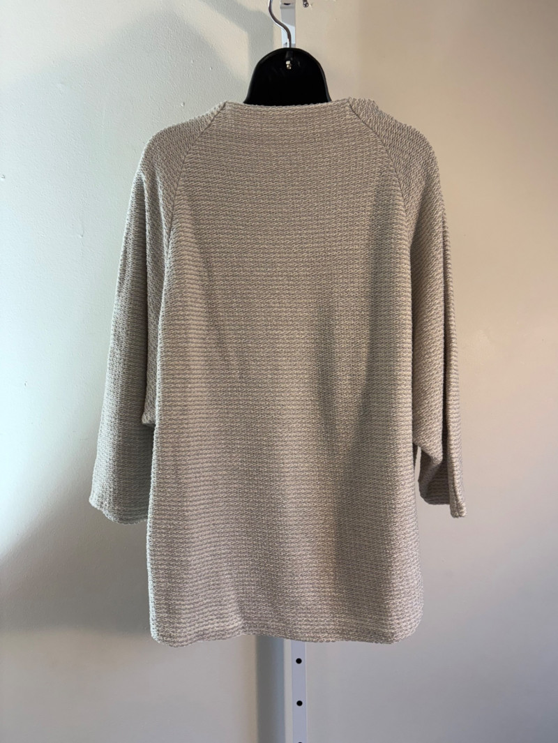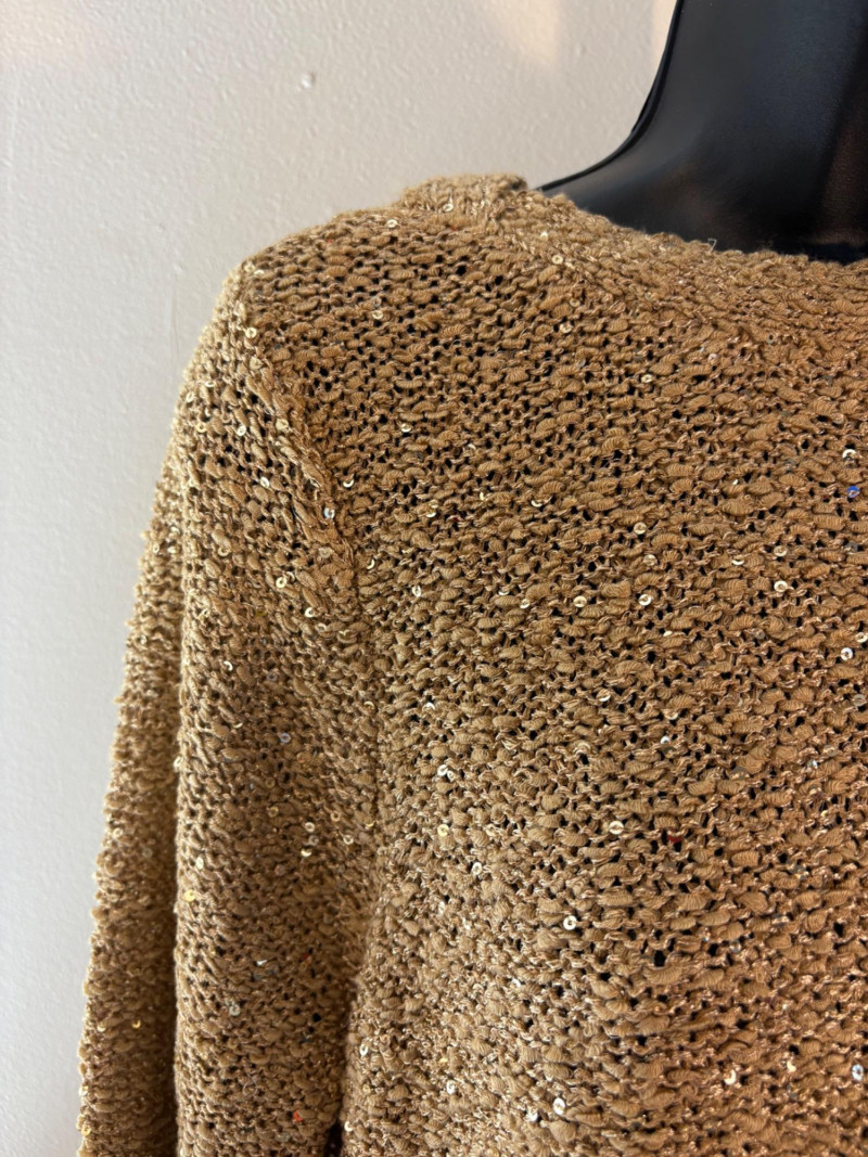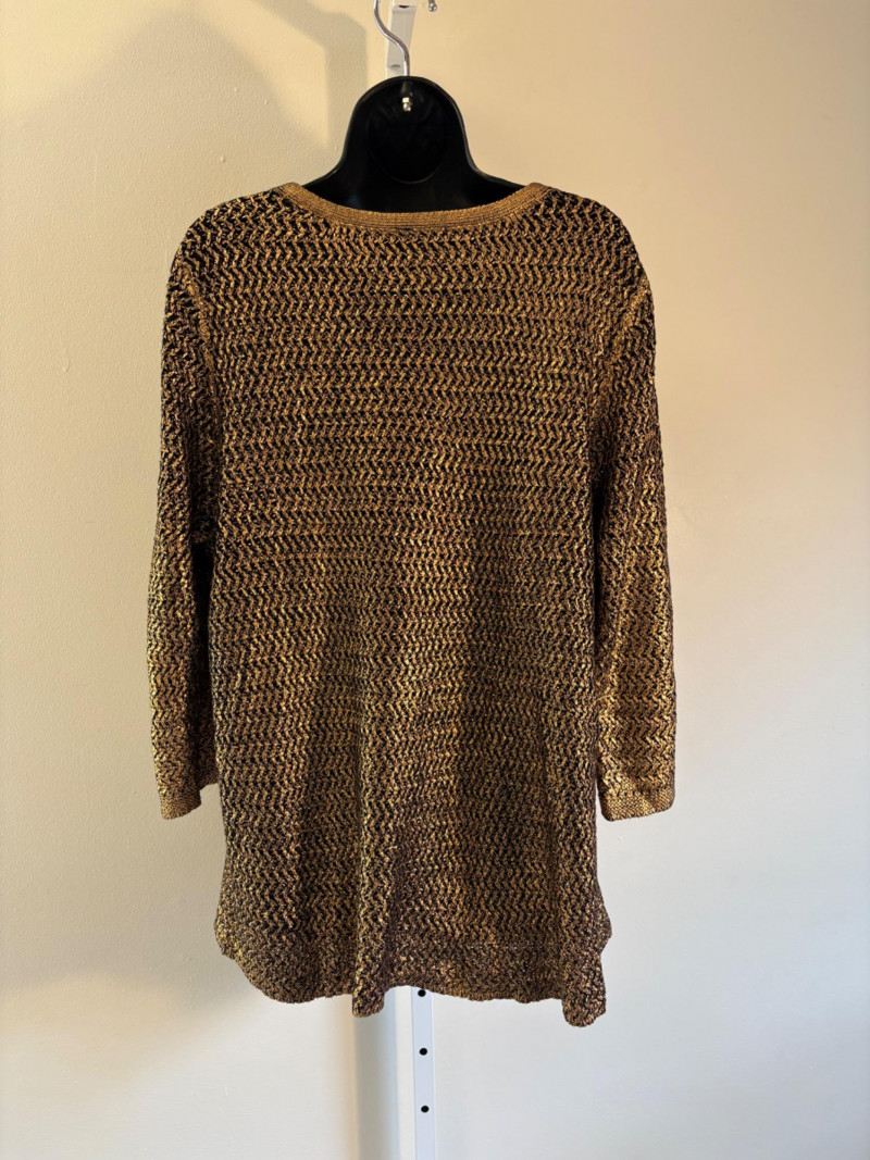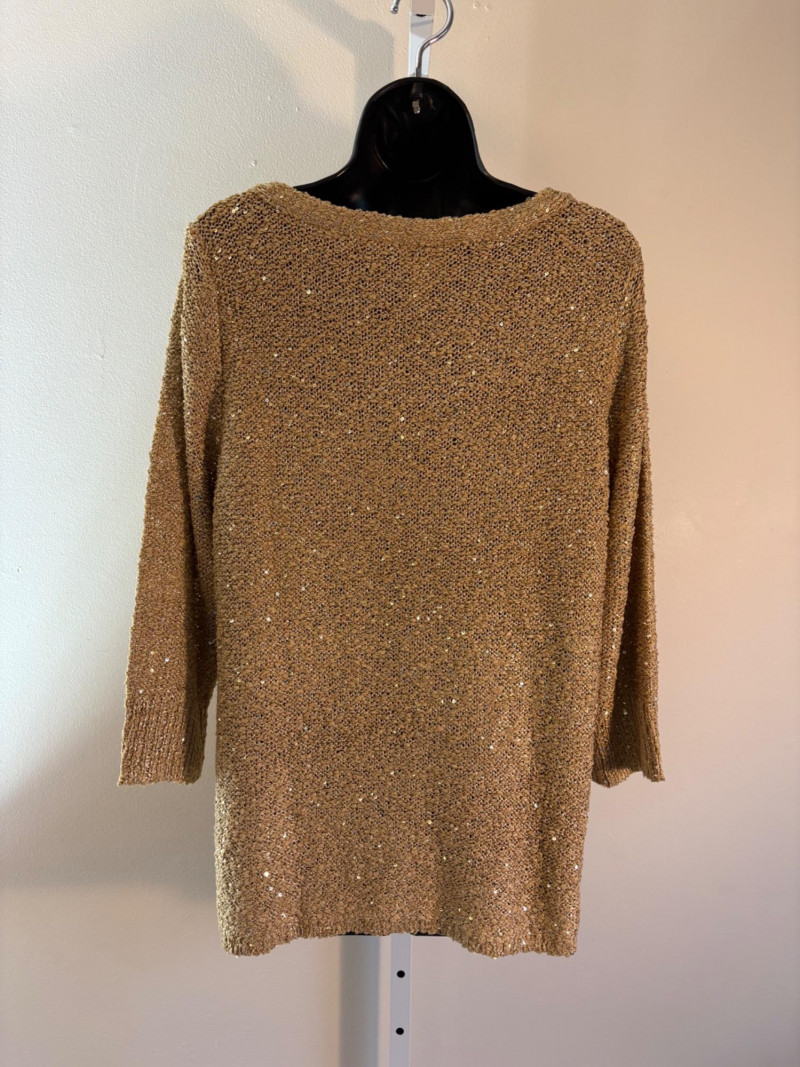 Three special occasion sweaters with a little bit of glitz. All from Chico’s and all in very good used condition Loosely woven gold sweater with gold sequins has wide ribbed cuffs and narrow ribbed hem. 44% polyester, 40% acrylic, 15% nylon, and 1% metallic. Measures 22.5" pit to pit and 25" from back neckline to bottom hem. Size tag says 3. Black and gold zigzag sweater has ribbed neckline and cuffs. 64% cotton with 38% acrylic. Measures 23" pit to pit and 26.5" from back neckline to hem. Size tag says 4. Funnel neck sweater has raglan sleeves in a gray & cream knit with small bits of silver thread. 90% cotton and 8% polyester with 2% other fibers. Measures 24.5" pit to pit and 27" from back neckline to hem. Size tag says 3. We noticed a small spot near the right sleeve, but believe it will launder out - see last photo.