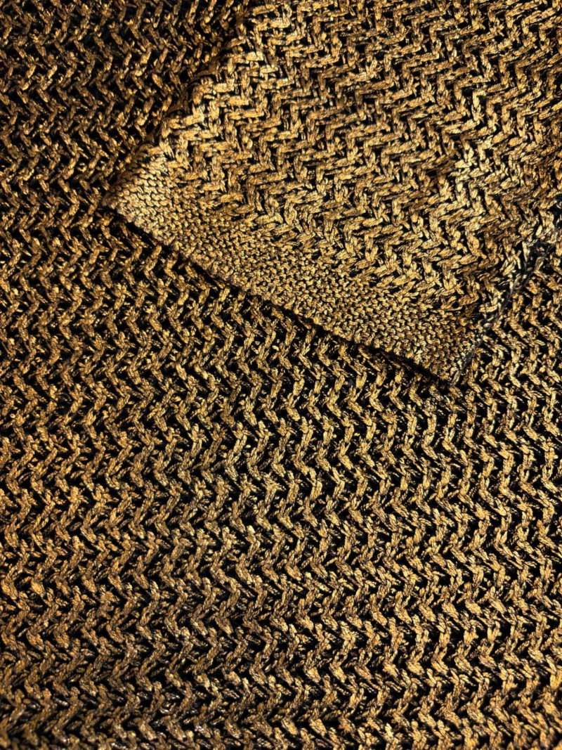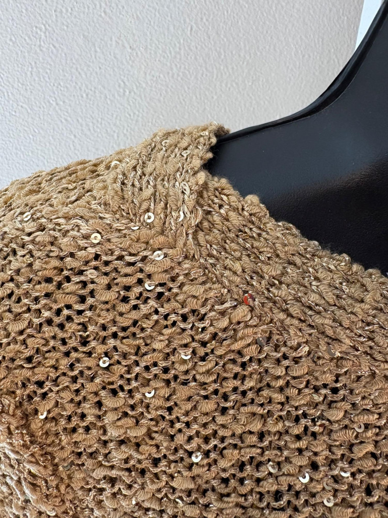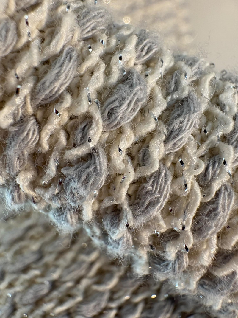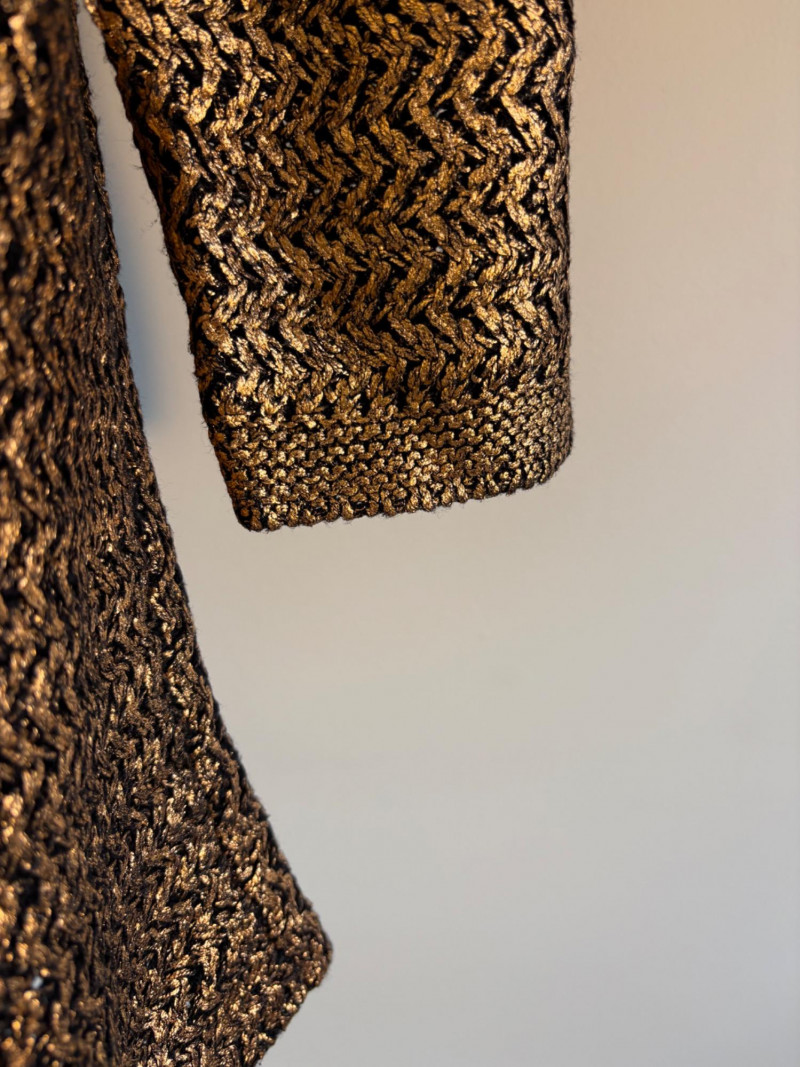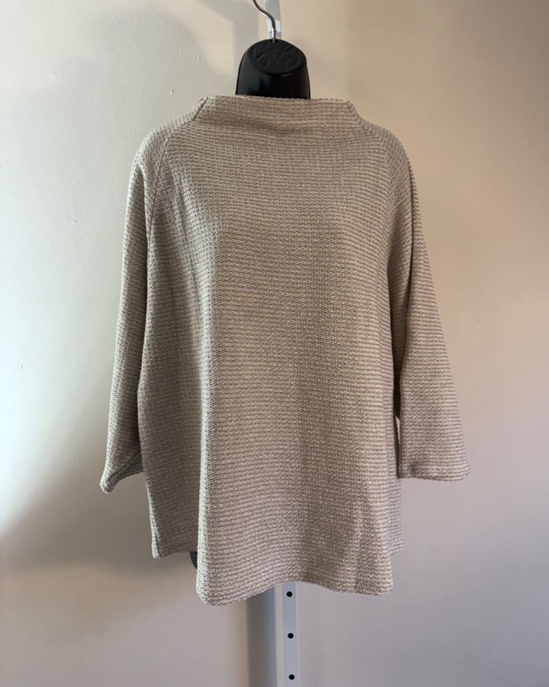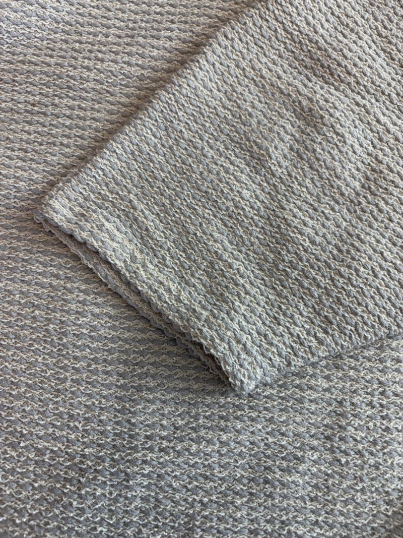 Three special occasion sweaters with a little bit of glitz. All from Chico’s and all in very good used condition Loosely woven gold sweater with gold sequins has wide ribbed cuffs and narrow ribbed hem. 44% polyester, 40% acrylic, 15% nylon, and 1% metallic. Measures 22.5" pit to pit and 25" from back neckline to bottom hem. Size tag says 3. Black and gold zigzag sweater has ribbed neckline and cuffs. 64% cotton with 38% acrylic. Measures 23" pit to pit and 26.5" from back neckline to hem. Size tag says 4. Funnel neck sweater has raglan sleeves in a gray & cream knit with small bits of silver thread. 90% cotton and 8% polyester with 2% other fibers. Measures 24.5" pit to pit and 27" from back neckline to hem. Size tag says 3. We noticed a small spot near the right sleeve, but believe it will launder out - see last photo.