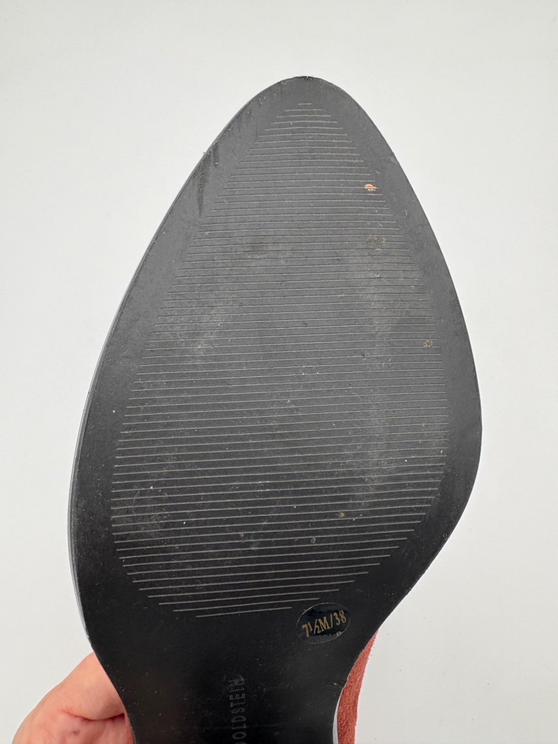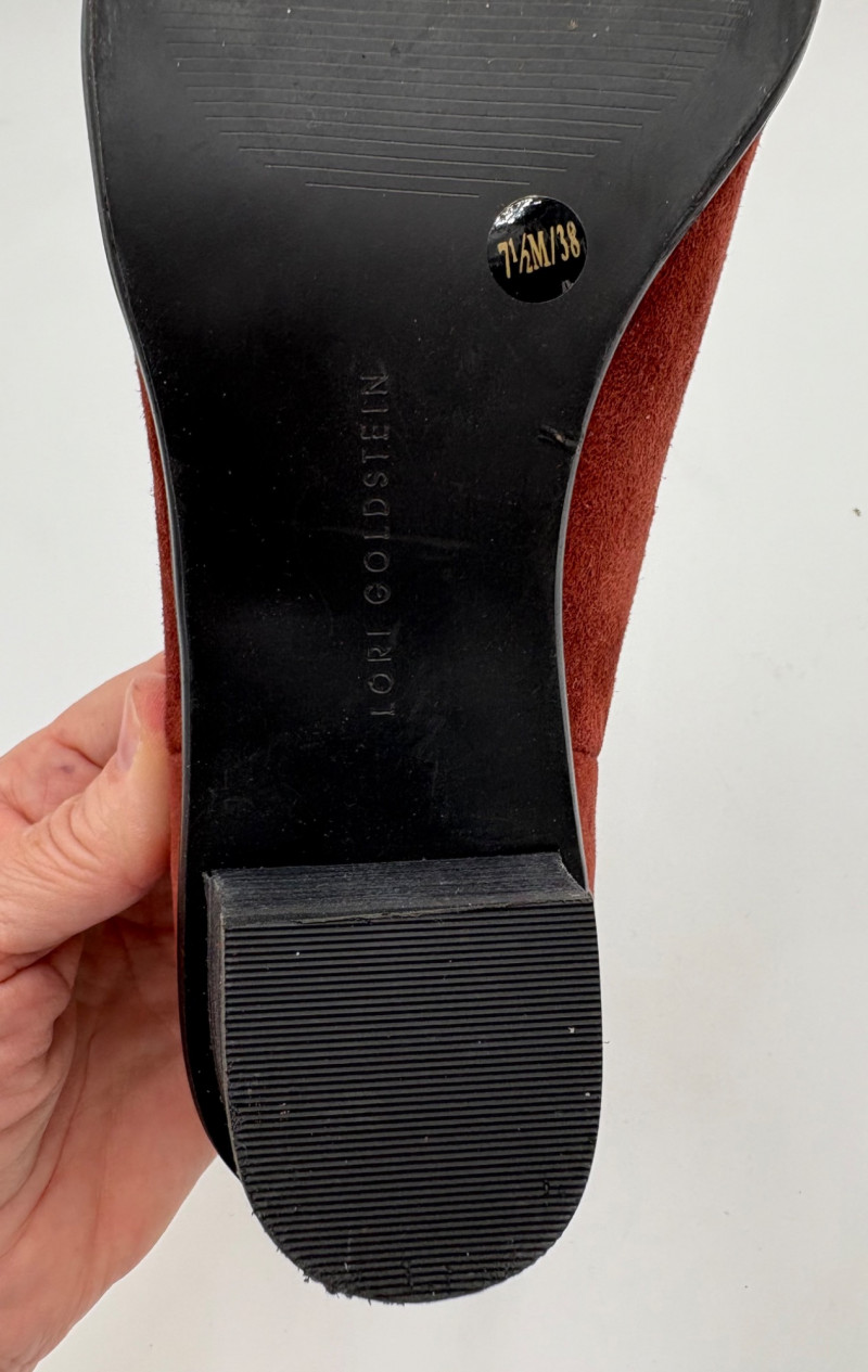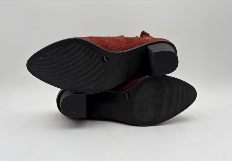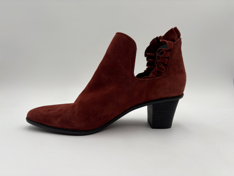 Soft reddish brown ankle boots from Lori Goldstein have ankle cut-out both inside and out with a ruffled inset at the back of the opening. Pointed toe and stacked 2" heel. In excellent condition. Size 7.5