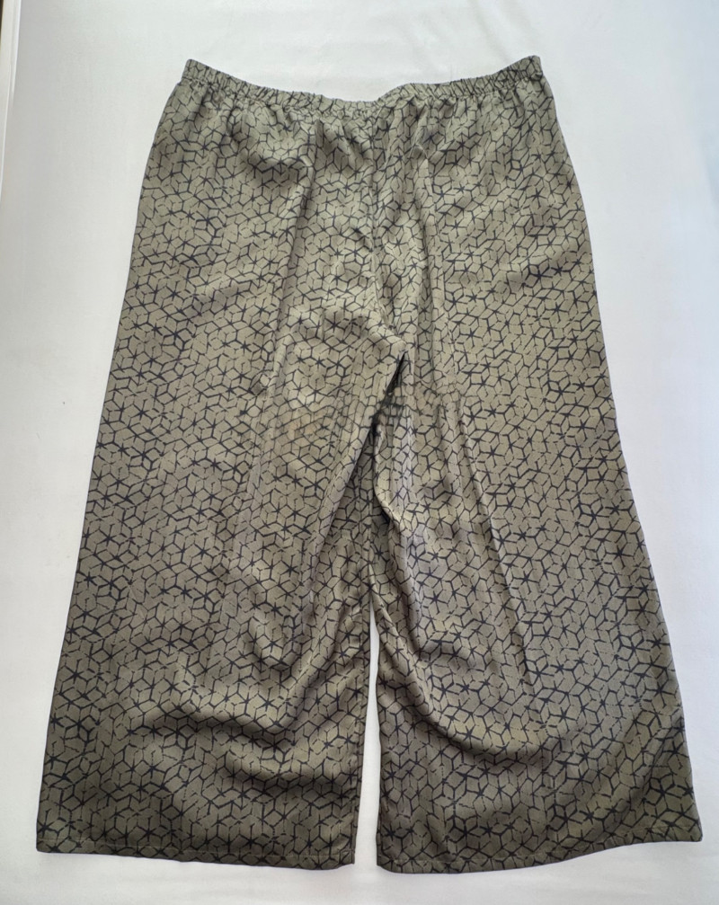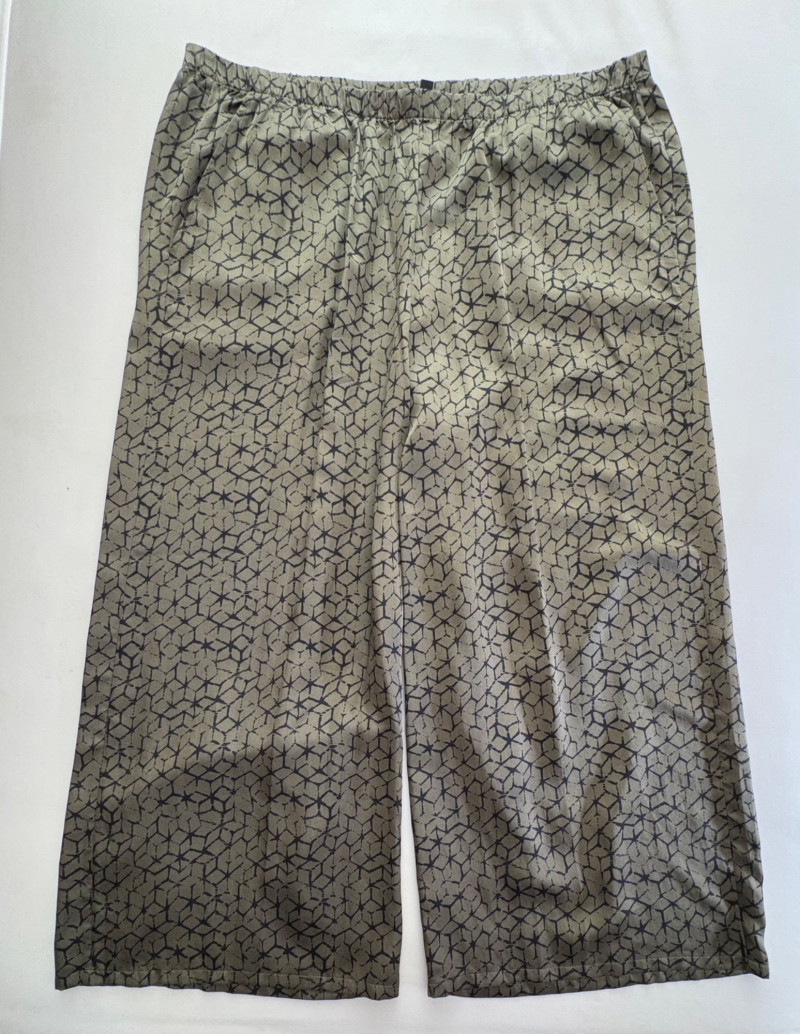 Wonderful loose tunic & pants duo from Eileen Fisher. (They are the same color despite what the photos look like!). Tunic has short dolman sleeves with V neckline and front patch pockets. In excellent condition. 100% silk. Measures 25" pit to pit and 32.5" from back neckline to back bottom hemline. Size tag says XL. Pants in black & olive print have elasticated waistband, set-in side front pockets, and wide legs. In excellent condition. 70% silk with 30% cotton. Measure 19" side to side at waist with 25.5" inseam. Size tag says XL.