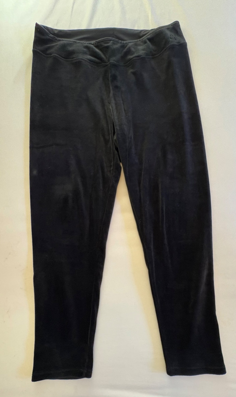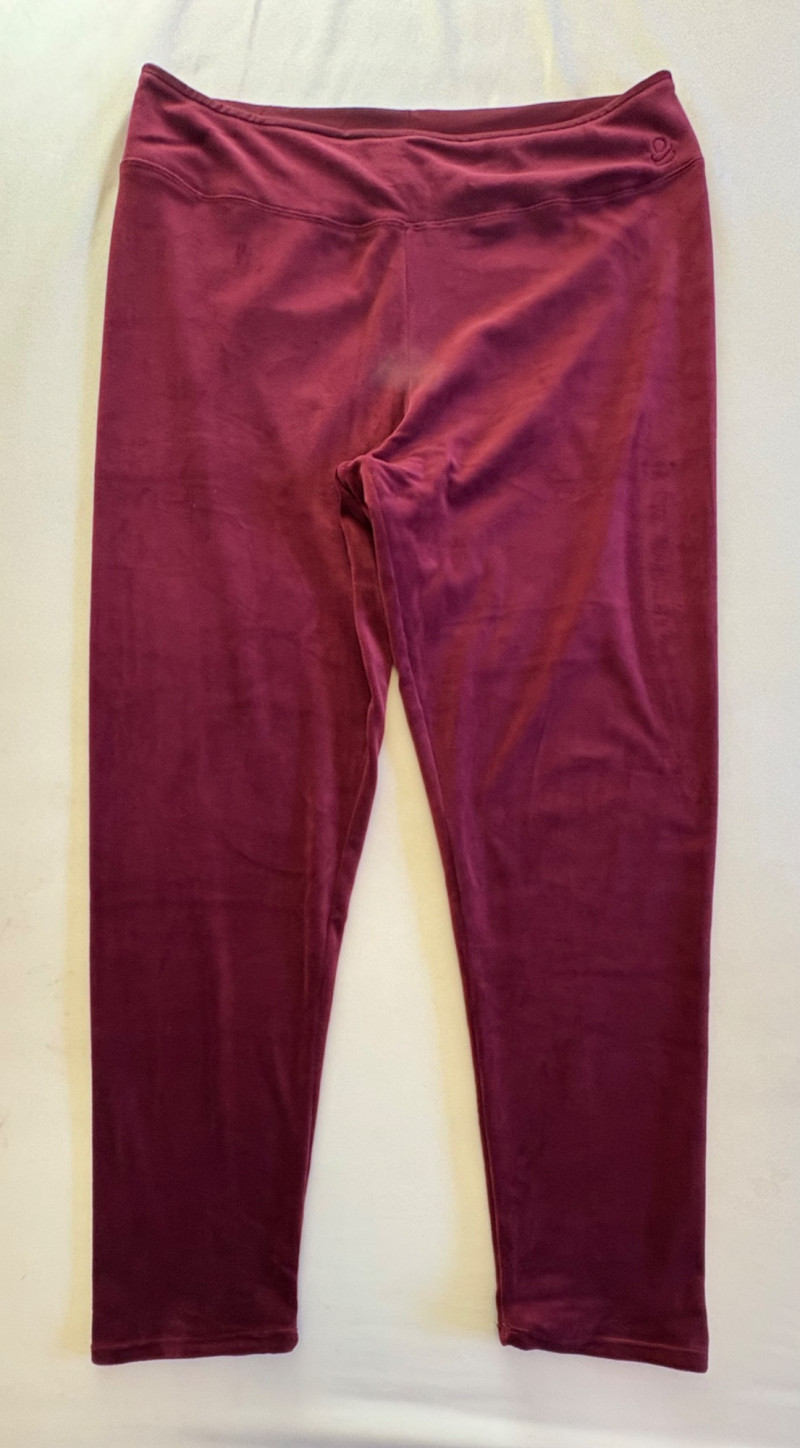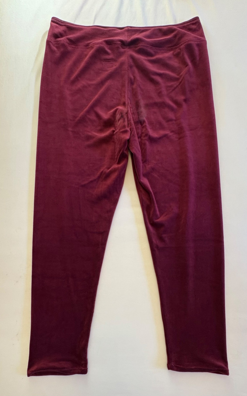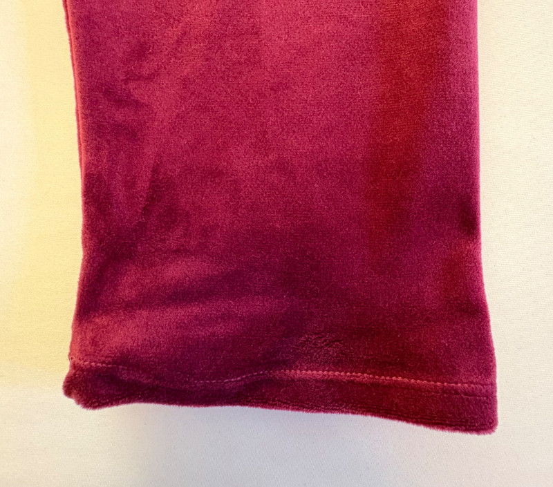 3 pairs of incredibly soft velour pants* from Cuddle Duds in medium grey, burgundy, and black. All have small waistline yoke with thin elastic waistband and tapered legs. All are in excellent condition. 95% polyester with 5% spandex. All measure 18.5" side to side at waist with 28" inseam. Size tags say XL. * we think they feel like Minky fabric