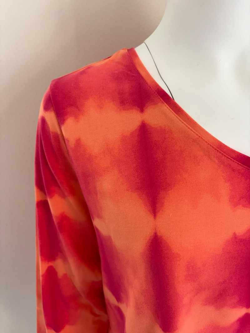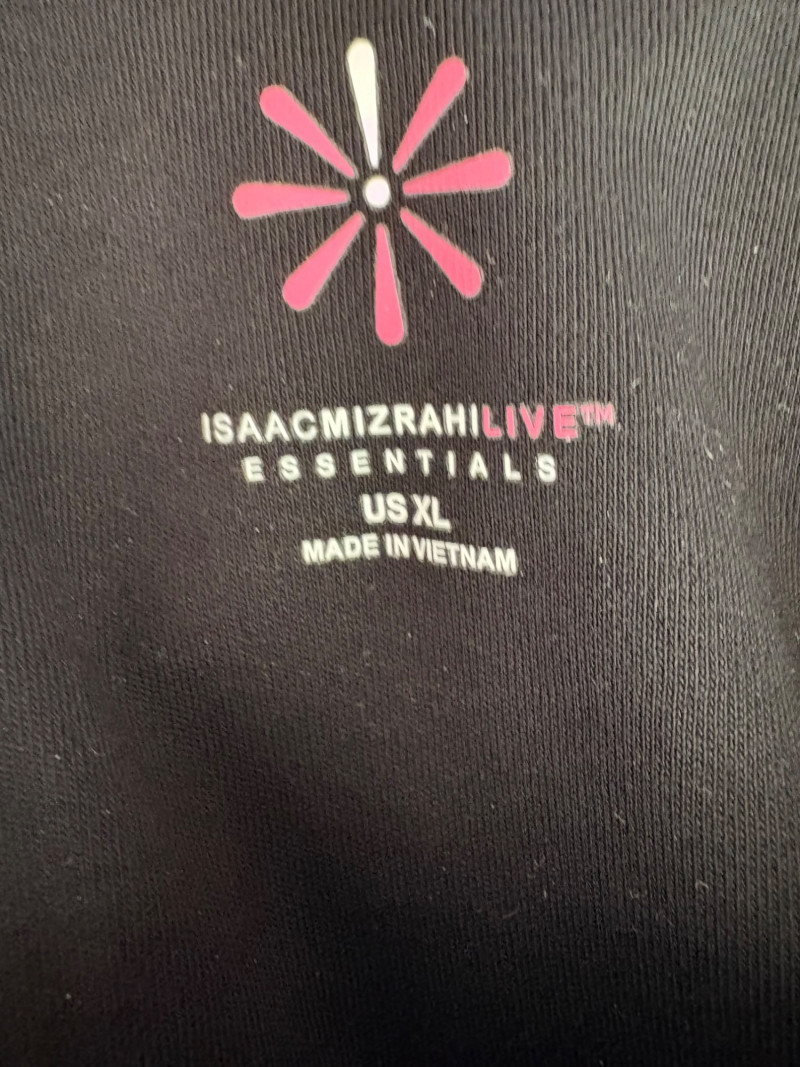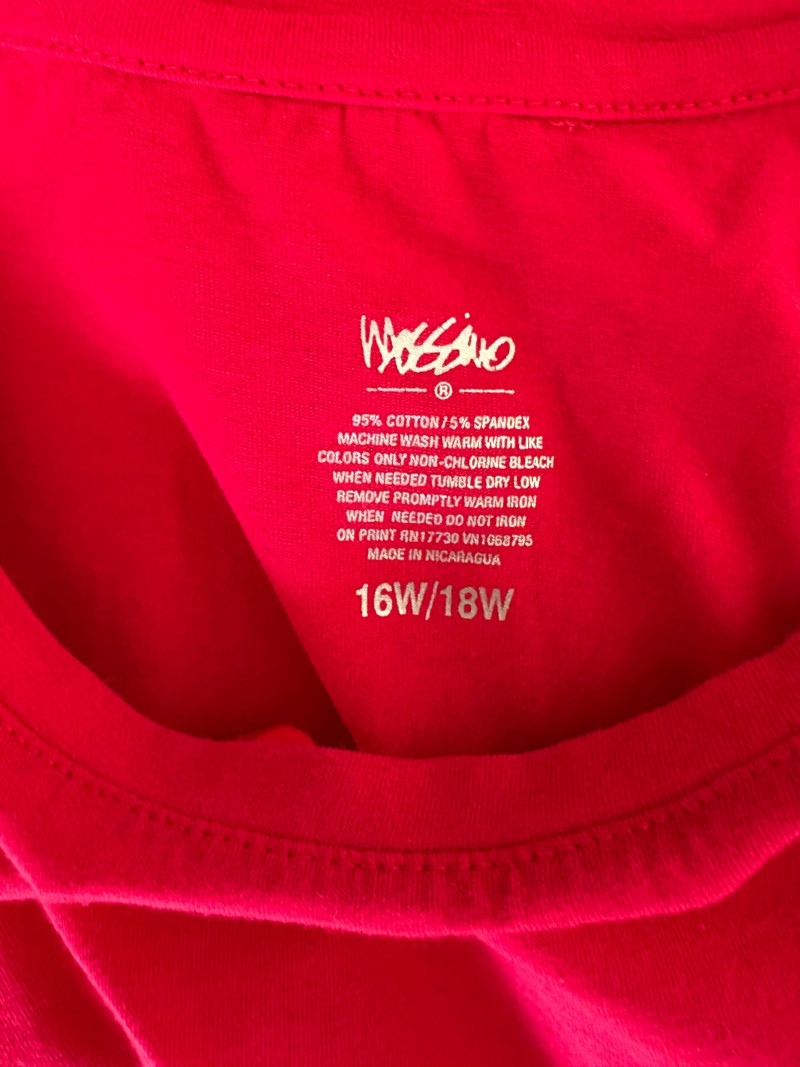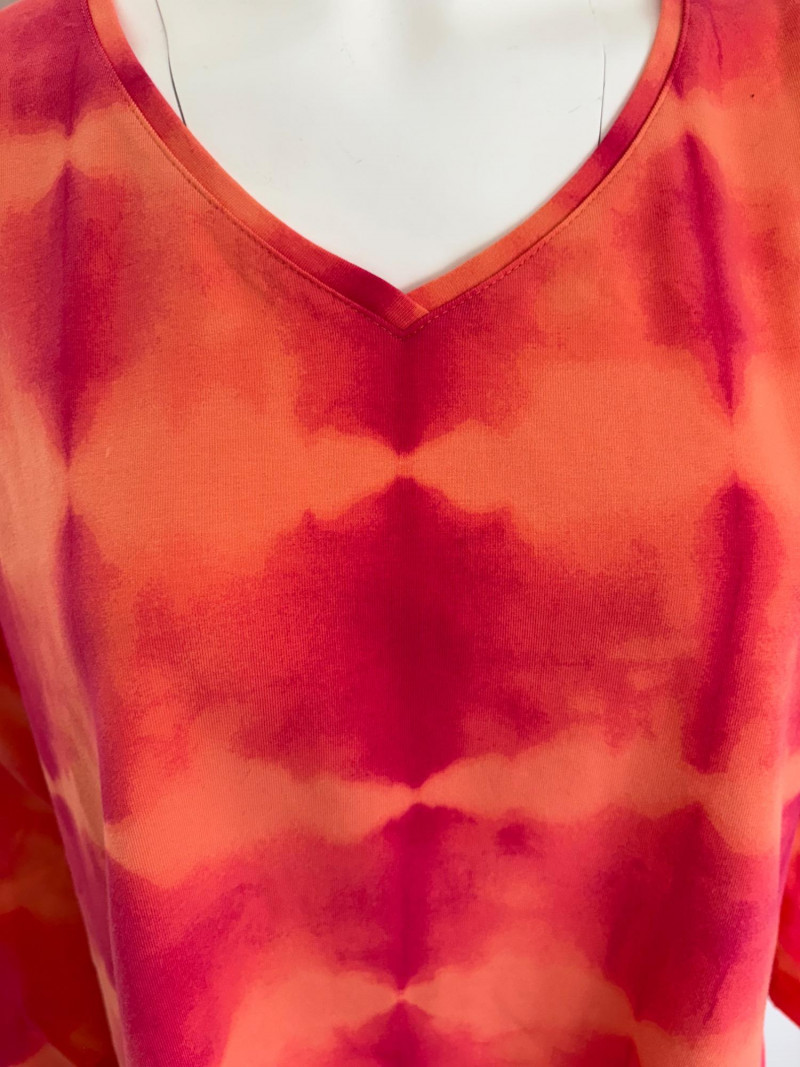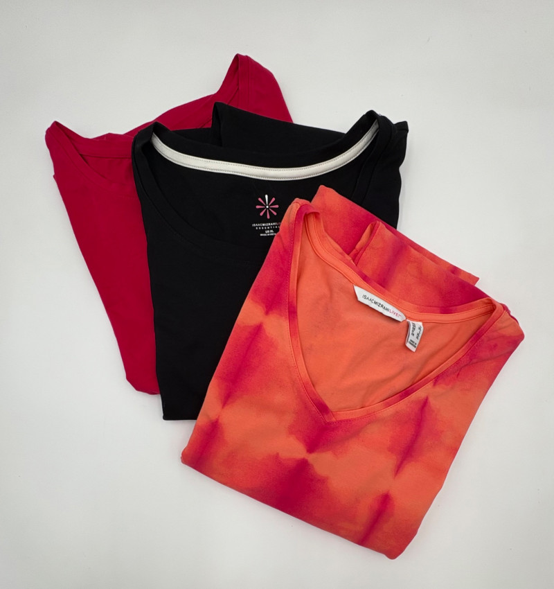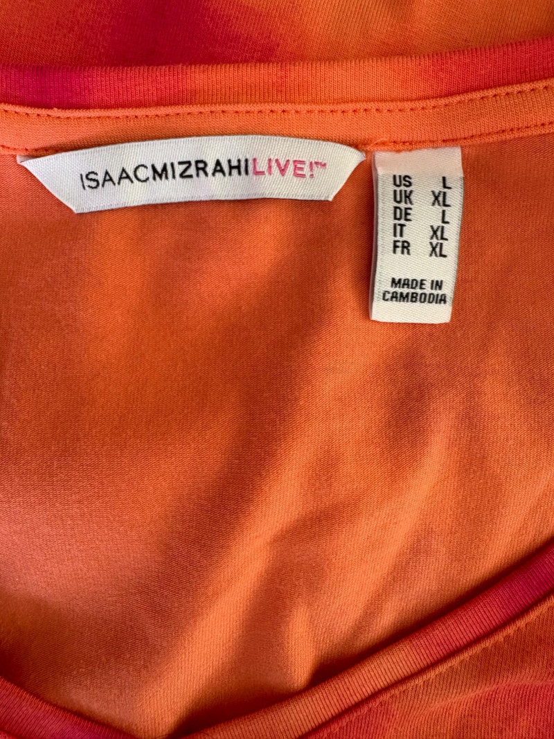 Three knit shirts from Isaac Mizrahi & Massimo. Black scoop neck short sleeve shirt from Mizrahi has ribbed collar and straight cut - knit is heavier than your average t-shirt. In excellent condition with no fading. 100% cotton. Measures 22" pit to pit and 25.5" from back collar to back bottom hemline. Size tag says XL. Tie-dye V-neck shirt from Mizrahi has ribbed collar, 3/4 sleeves, and split hem - knit is heavier than your average t-shirt. In excellent condition with no fading. 100% cotton. Measures 22.5" pit to pit and 26.5" from back collar to back bottom hemline. Size tag says L. Red t-shirt from Massimo has curved neckline and very short sleeves. In excellent condition. 95% cotton with 5% spandex. Measures 23" pit to pit and 26" from back neckline to back hemline. Size tag says16W/18W.