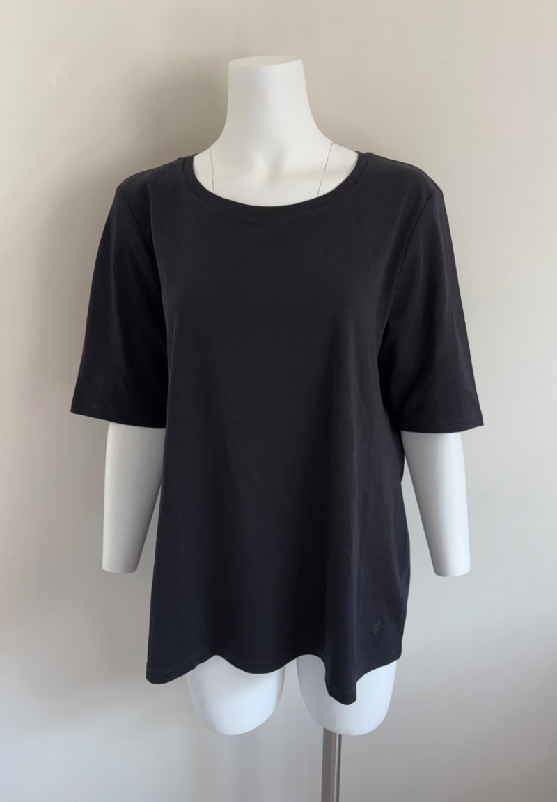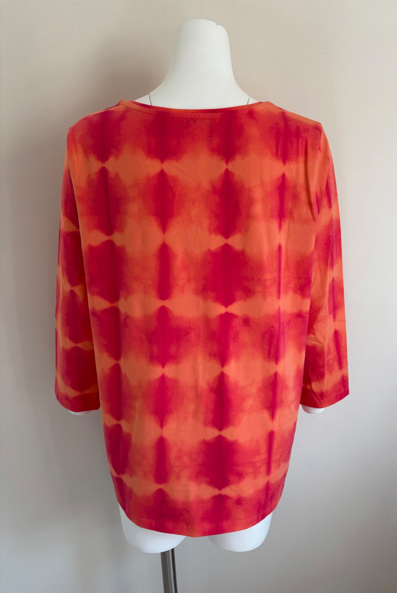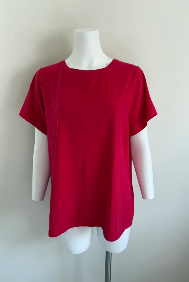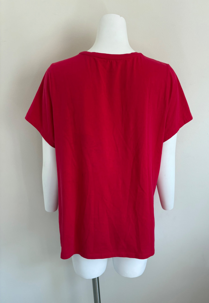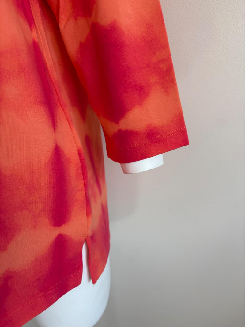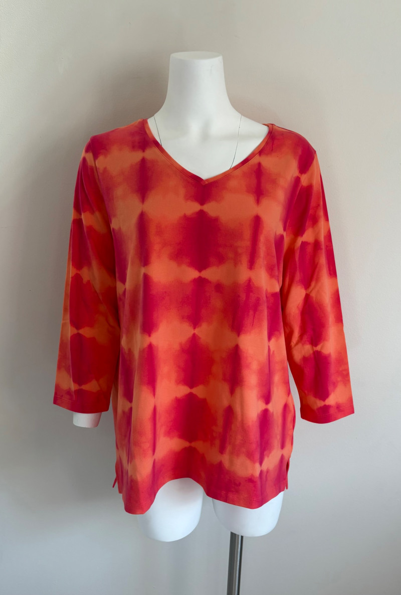 Three knit shirts from Isaac Mizrahi & Massimo. Black scoop neck short sleeve shirt from Mizrahi has ribbed collar and straight cut - knit is heavier than your average t-shirt. In excellent condition with no fading. 100% cotton. Measures 22" pit to pit and 25.5" from back collar to back bottom hemline. Size tag says XL. Tie-dye V-neck shirt from Mizrahi has ribbed collar, 3/4 sleeves, and split hem - knit is heavier than your average t-shirt. In excellent condition with no fading. 100% cotton. Measures 22.5" pit to pit and 26.5" from back collar to back bottom hemline. Size tag says L. Red t-shirt from Massimo has curved neckline and very short sleeves. In excellent condition. 95% cotton with 5% spandex. Measures 23" pit to pit and 26" from back neckline to back hemline. Size tag says16W/18W.