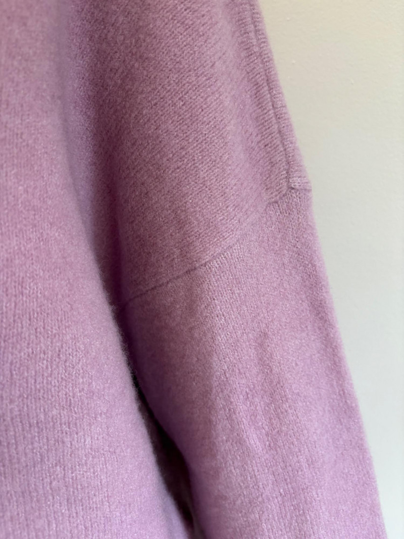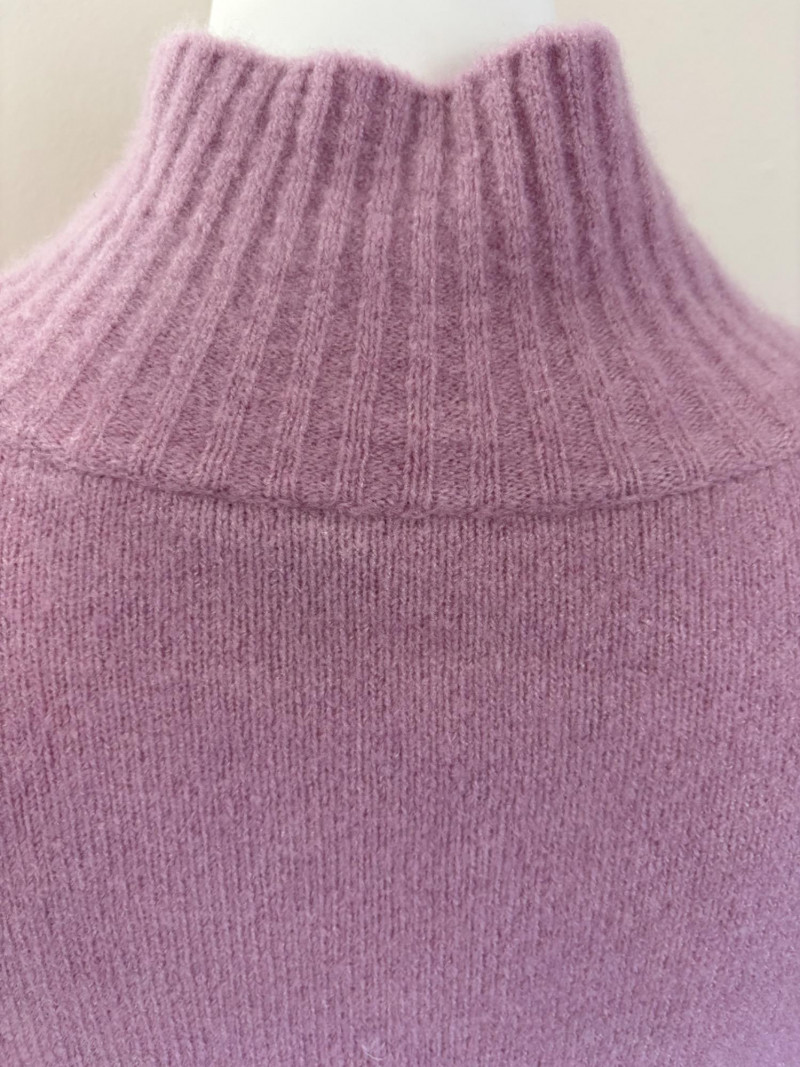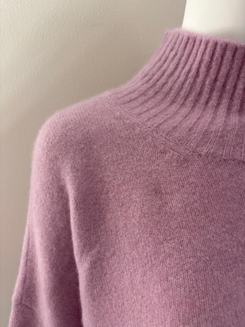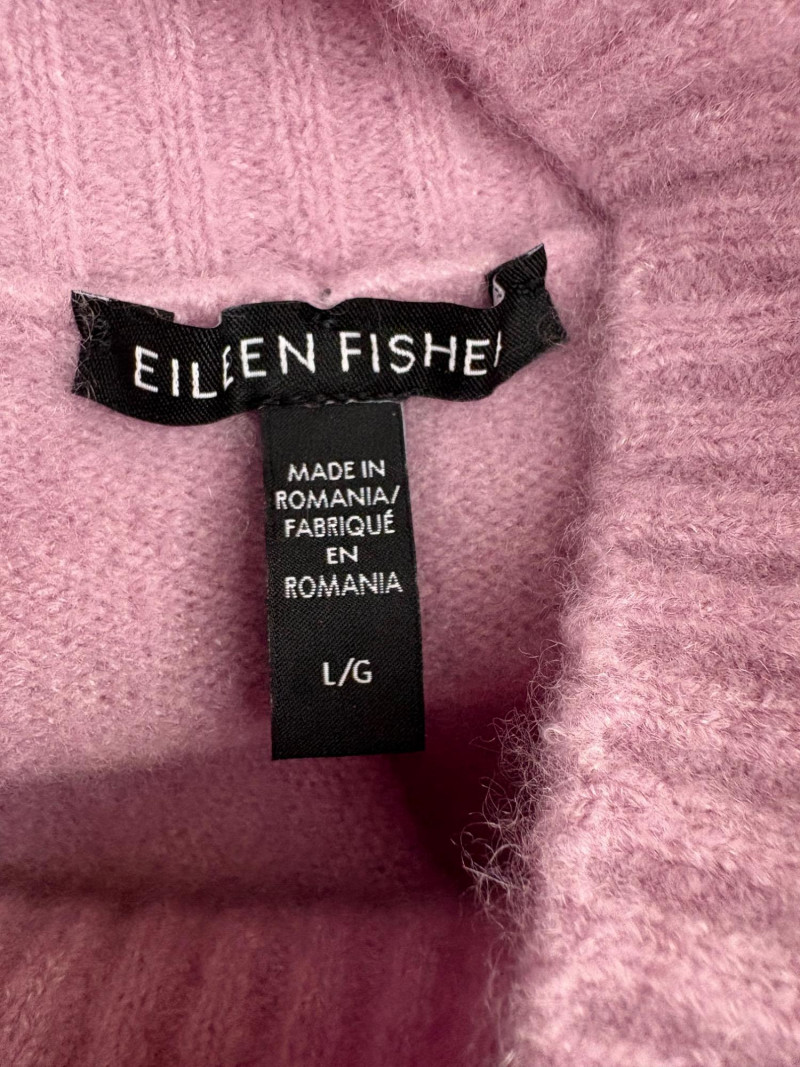 Heavyweight pink cashmere sweater from Eileen Fisher has ribbed turtleneck, dropped shoulder seams, and straight-cut body. In excellent condition.* 72% cashmere, 17% silk, 10% nylon, and 1% elastane. (Blending silk with with cashmere reduces cashmere’s tendency stretch out of shape without affecting its soft hand or significantly reducing its insulating properties.) Measures 27" pit to pit and 25.5" from center back neck seam to back hemline. Size tag says L/G. * while photographing we noticed a couple of spots where the threads were not evenly dyed; very minor and are not visible unless doing close-ups. See last photo for example.