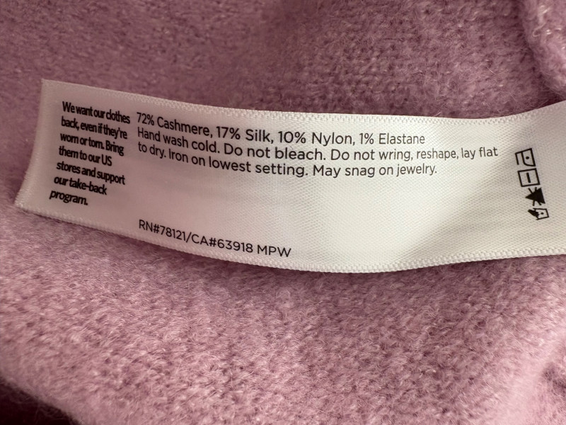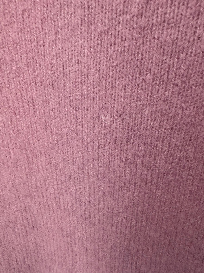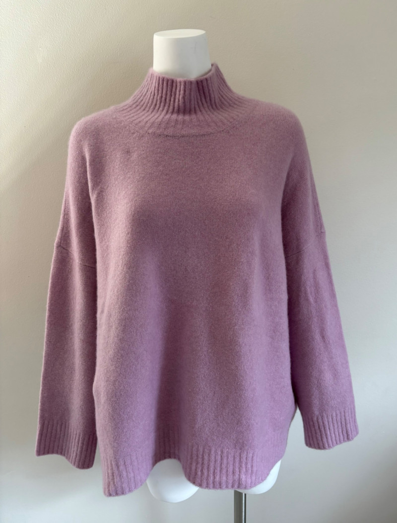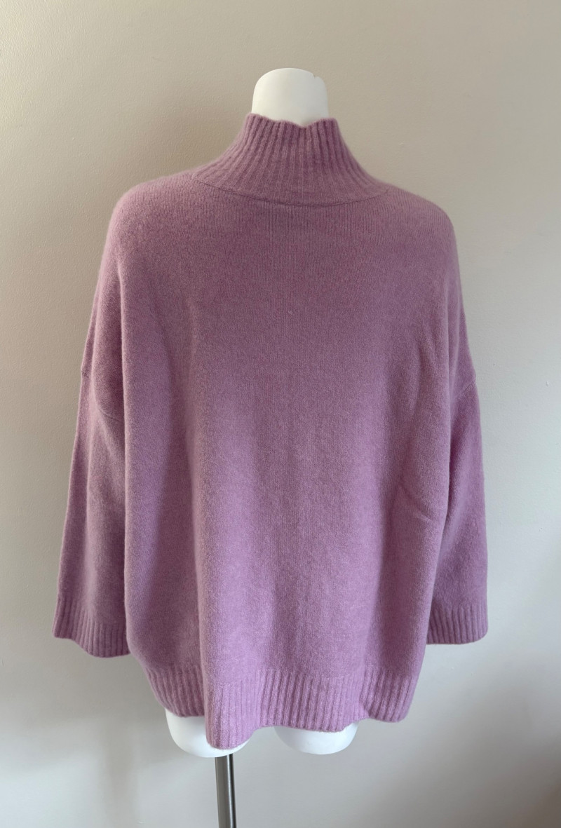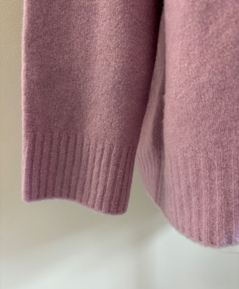 Heavyweight pink cashmere sweater from Eileen Fisher has ribbed turtleneck, dropped shoulder seams, and straight-cut body. In excellent condition.* 72% cashmere, 17% silk, 10% nylon, and 1% elastane. (Blending silk with with cashmere reduces cashmere’s tendency stretch out of shape without affecting its soft hand or significantly reducing its insulating properties.) Measures 27" pit to pit and 25.5" from center back neck seam to back hemline. Size tag says L/G. * while photographing we noticed a couple of spots where the threads were not evenly dyed; very minor and are not visible unless doing close-ups. See last photo for example.