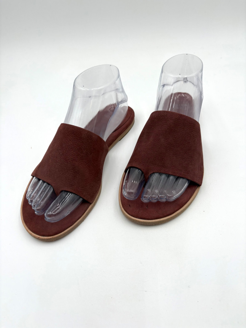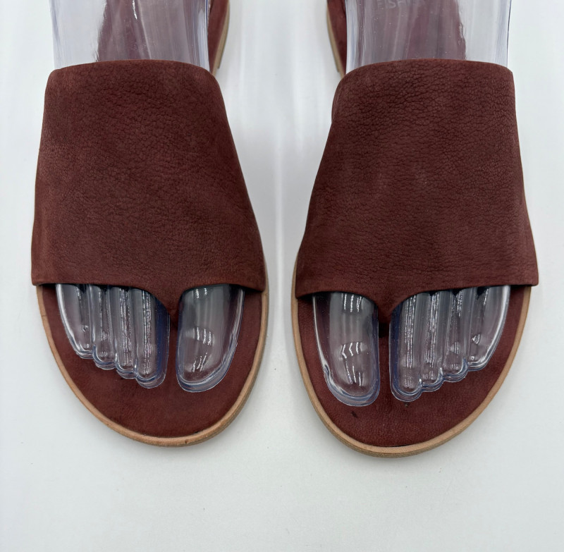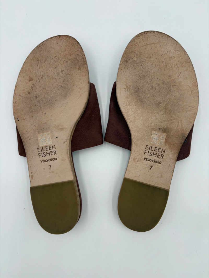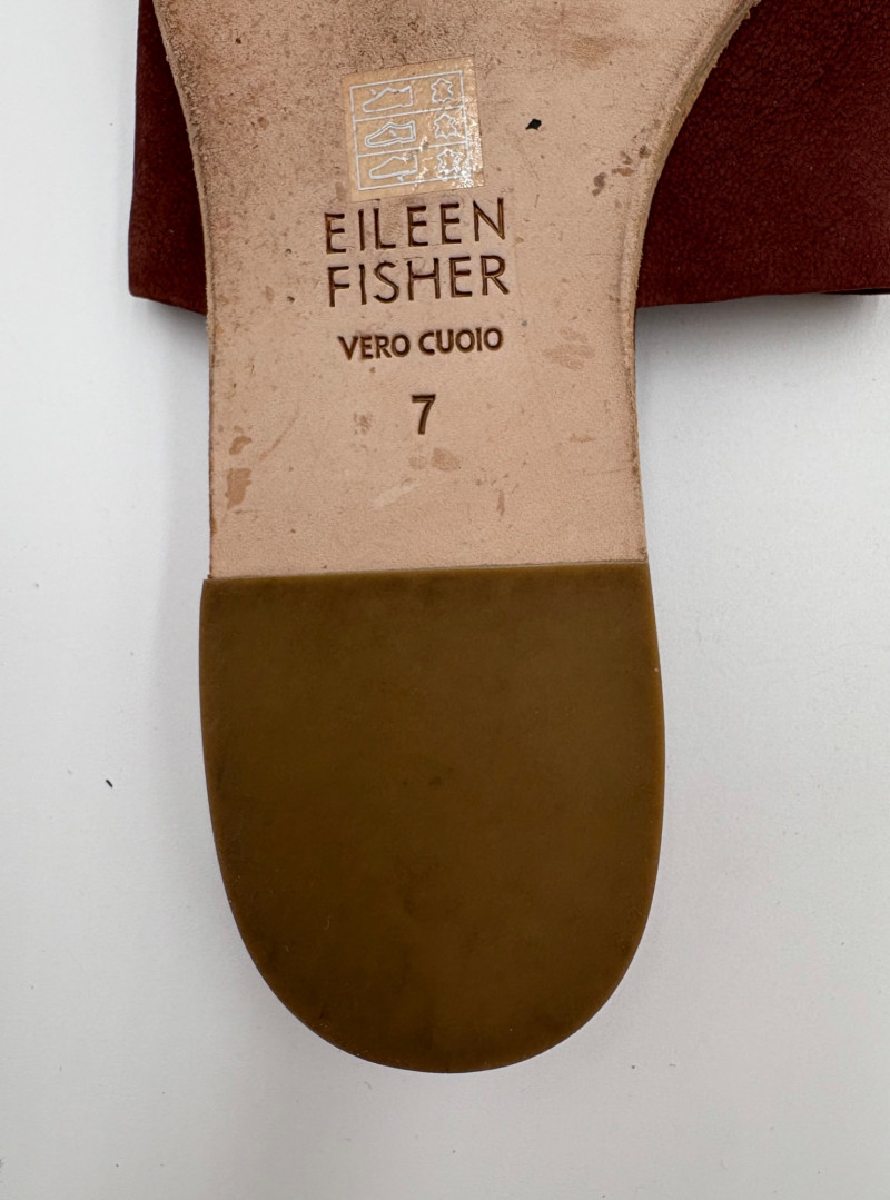 Reddish/taupe flip-flop style sandals from Eileen Fisher. Natural color leather soles with colored suede leather insole and upper. Extra padding on heel. In excellent condition with slight wear on soles, but look new when on. Size 7