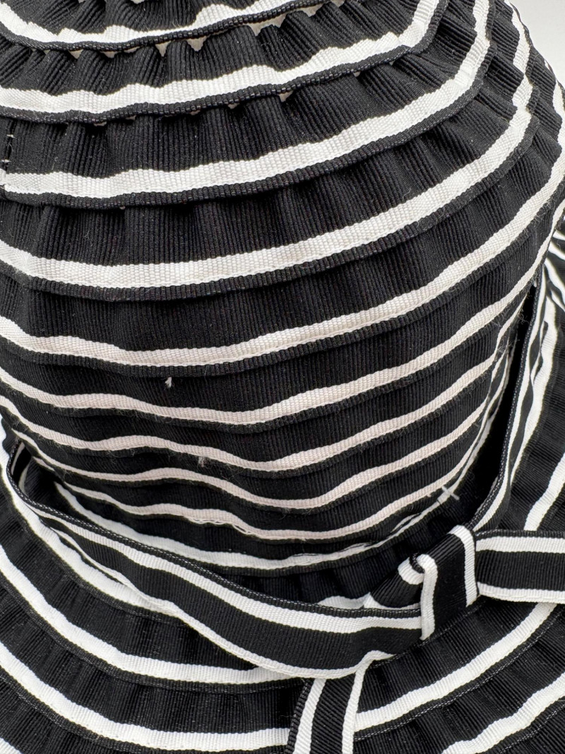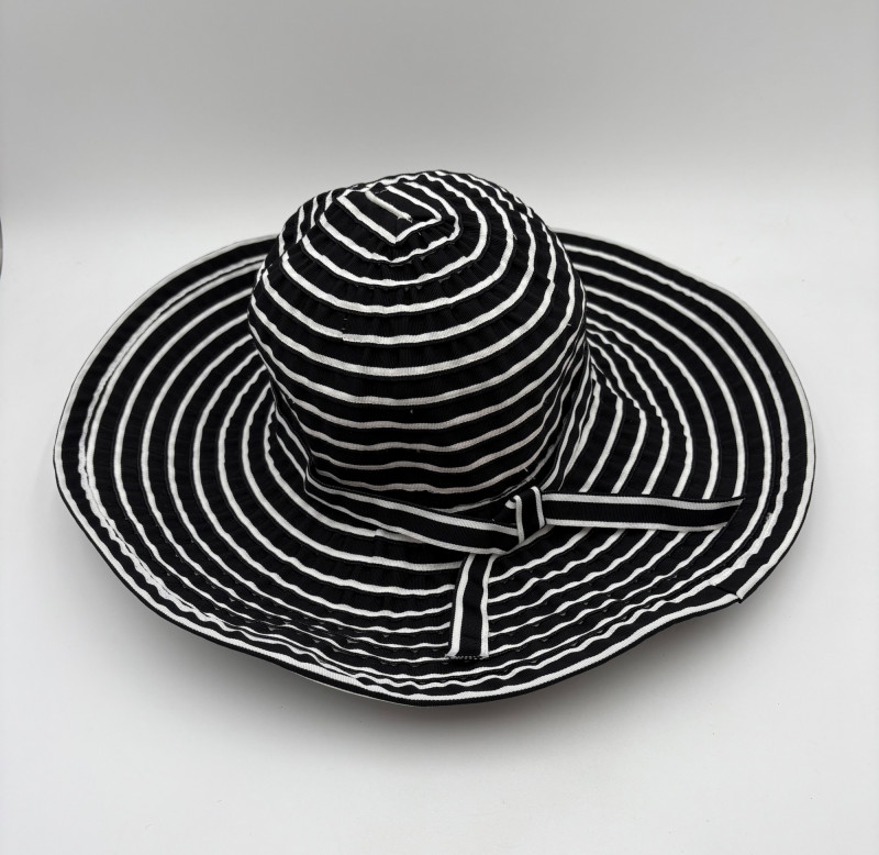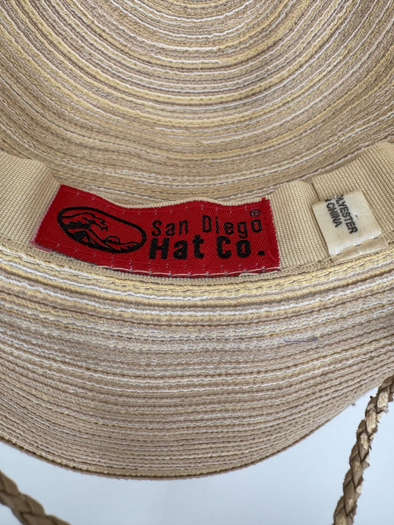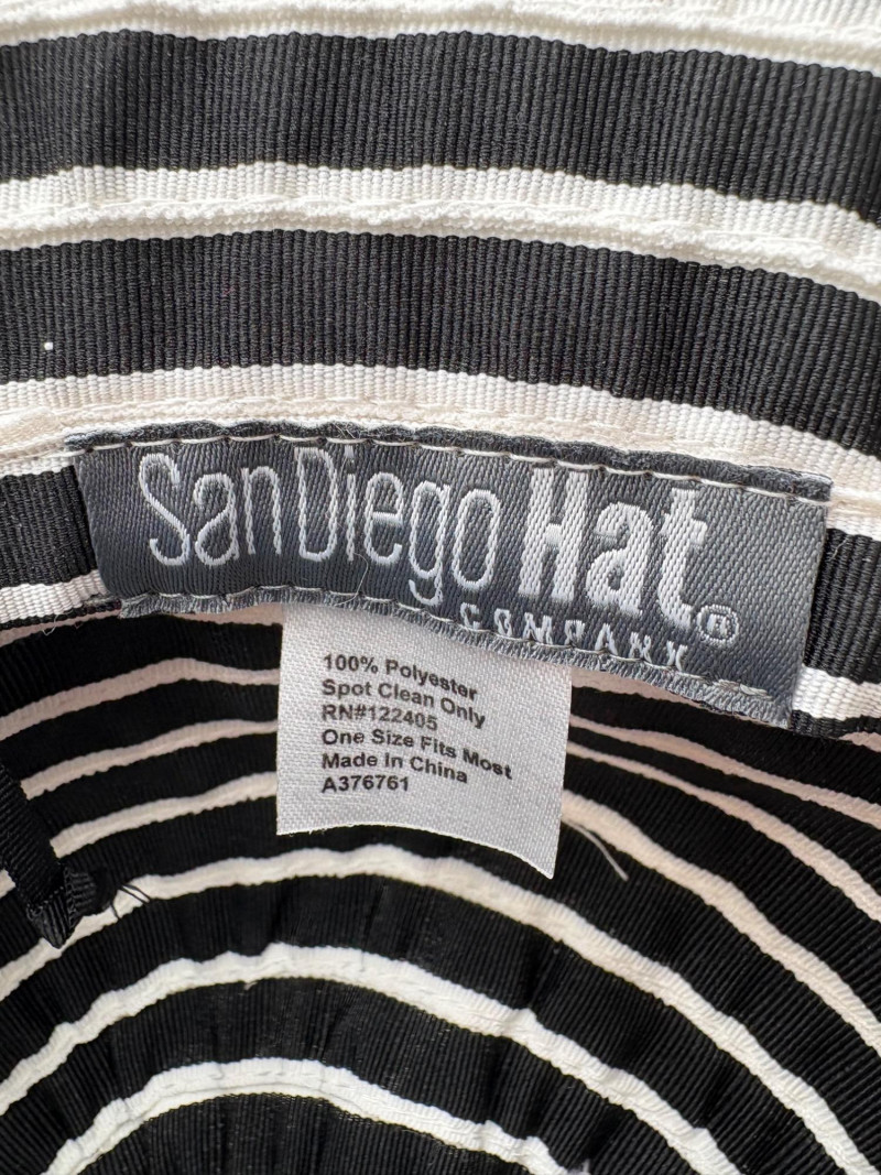 2 summer shade hats from San Diego Hat Company. One size fits most. Black & white is made of stitched grosgrain ribbon in a spiral pattern. Measures 17" from brim edge to brim edge. Decorative ribbon tie on top with sizing adjustment on the interior with ties. In good used condition. Yellow straw model has grommet with tie string running through hat brim to draw toggle under the neck. Woven in beige, yellow, and cream threads. Measures 15" from brim edge to brim edge. In good used condition.