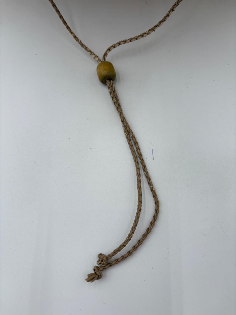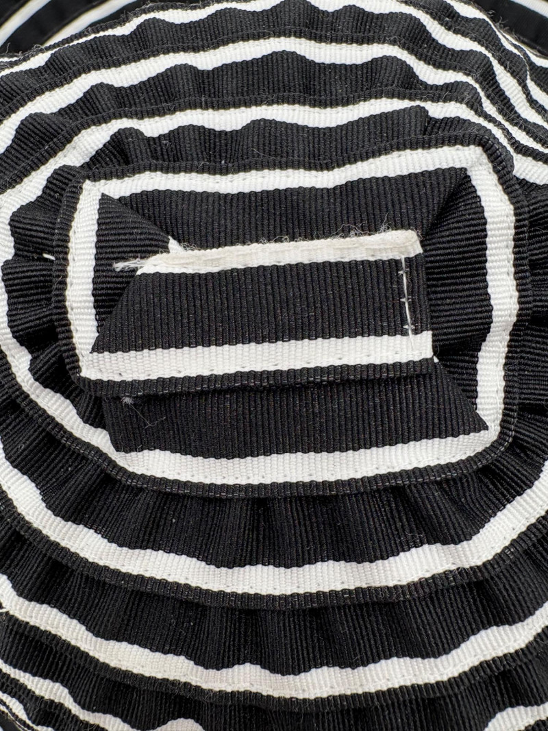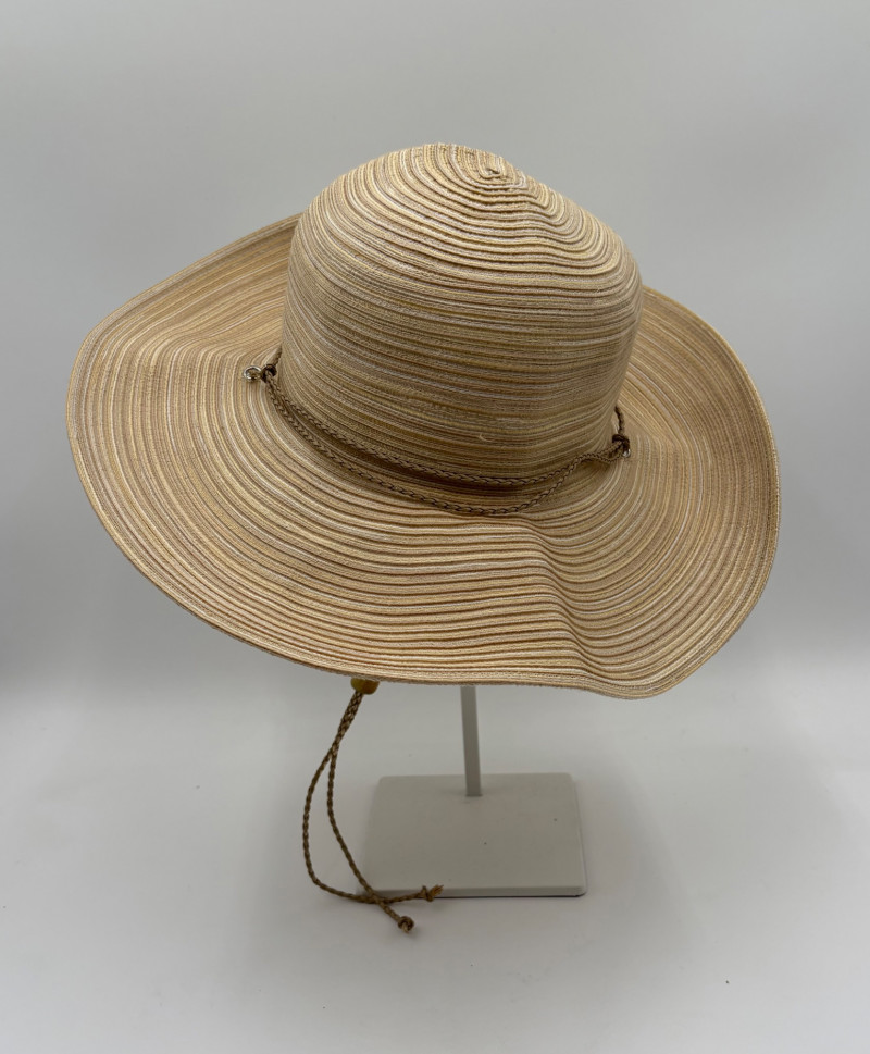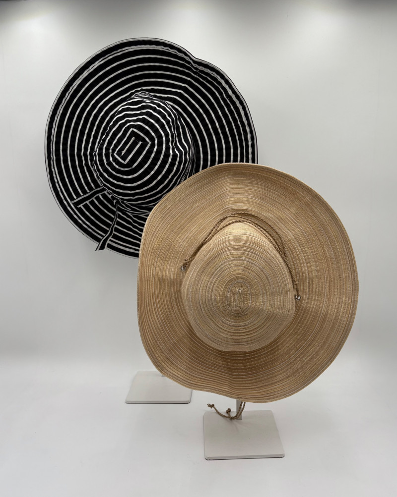 2 summer shade hats from San Diego Hat Company. One size fits most. Black & white is made of stitched grosgrain ribbon in a spiral pattern. Measures 17" from brim edge to brim edge. Decorative ribbon tie on top with sizing adjustment on the interior with ties. In good used condition. Yellow straw model has grommet with tie string running through hat brim to draw toggle under the neck. Woven in beige, yellow, and cream threads. Measures 15" from brim edge to brim edge. In good used condition.