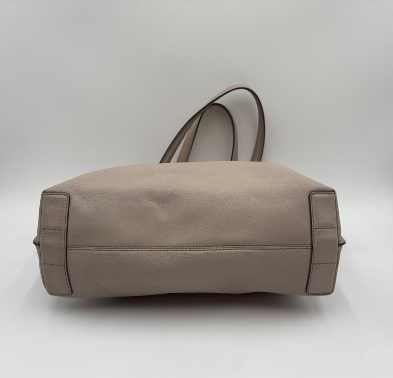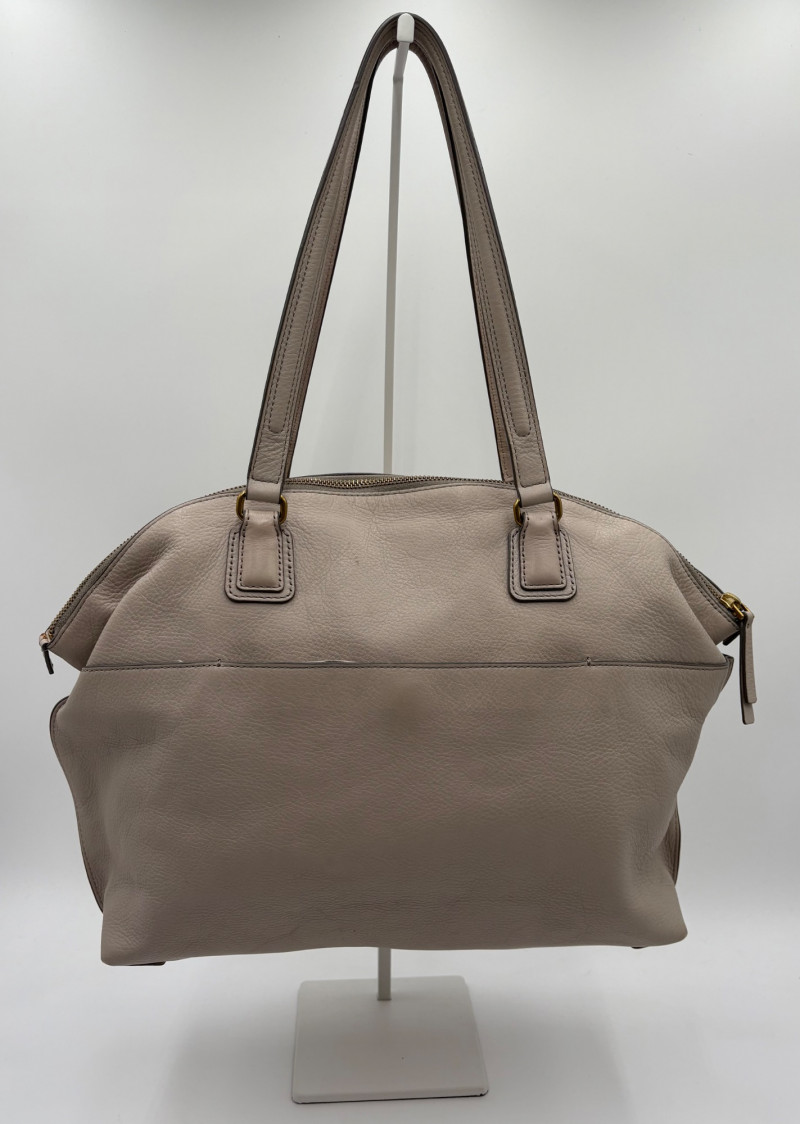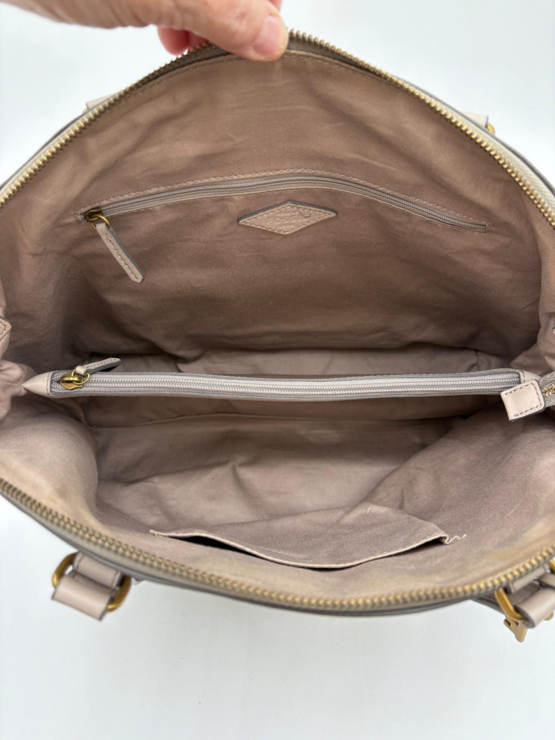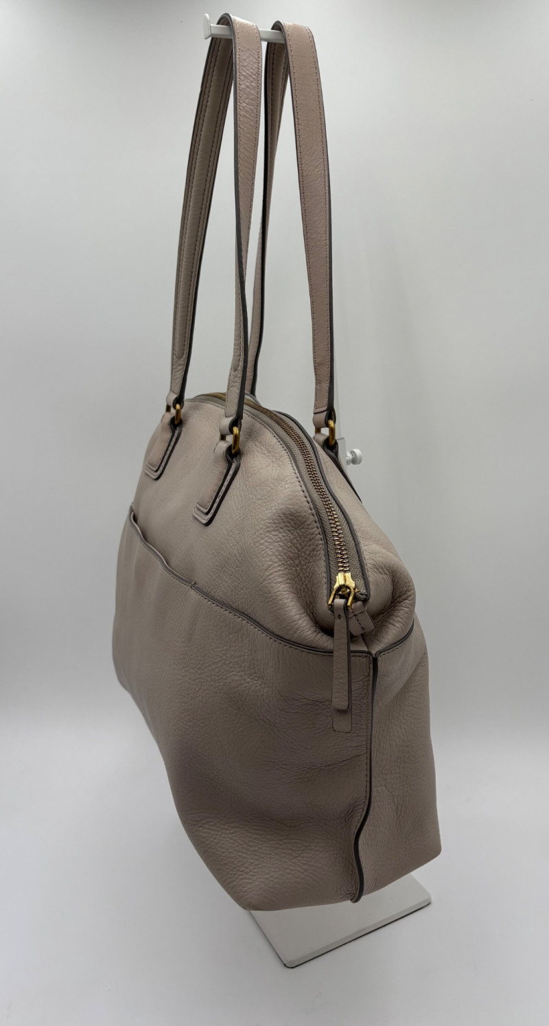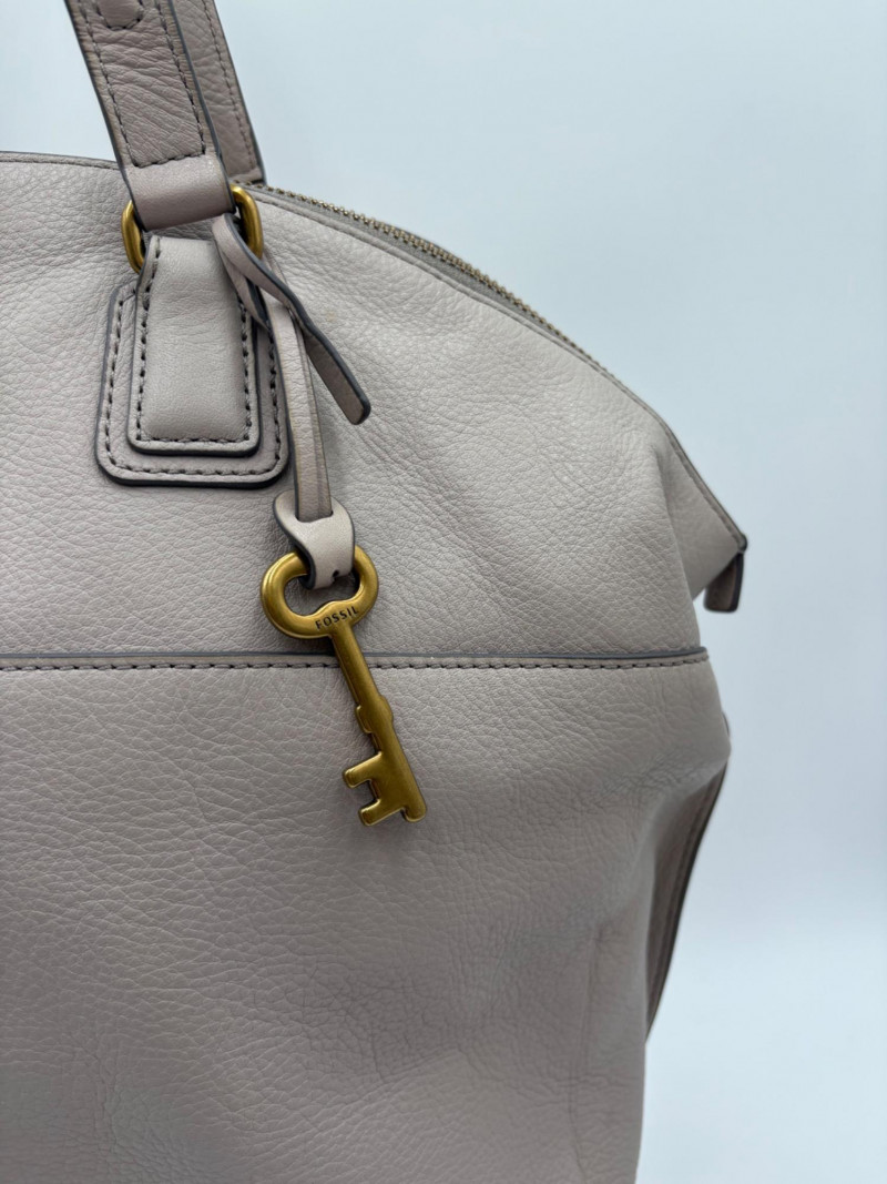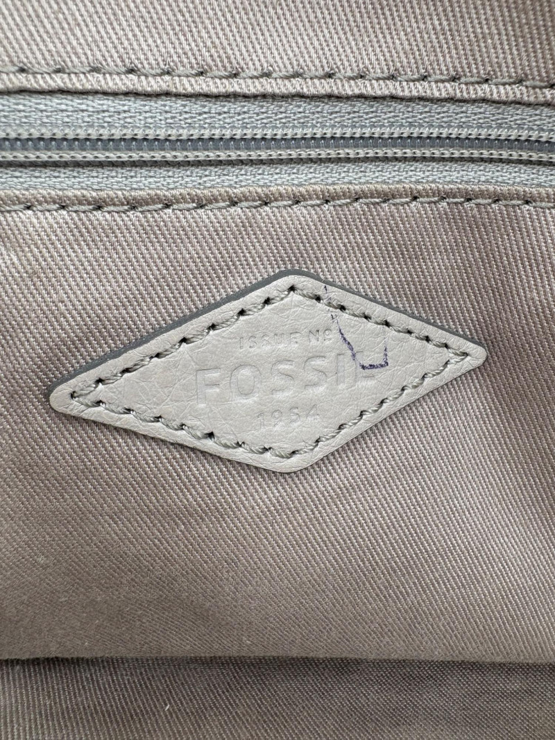 Roomy beige-grey leather purse from Fossil. Curved upper edge, squared off base, zip close top, back exterior slide pocket, and reinforced strap attachments with gold hardware. Interior has center zip compartment and two compartments on either side - one with a zipped pocket, the other with darted slide pocket. Clean and in very good used condition with a small pen mark on the inside label. Fossil label plate on exterior front. Measures 11" H x 13.5" W with a 9" drop from top of the hand straps to the top of the purse.