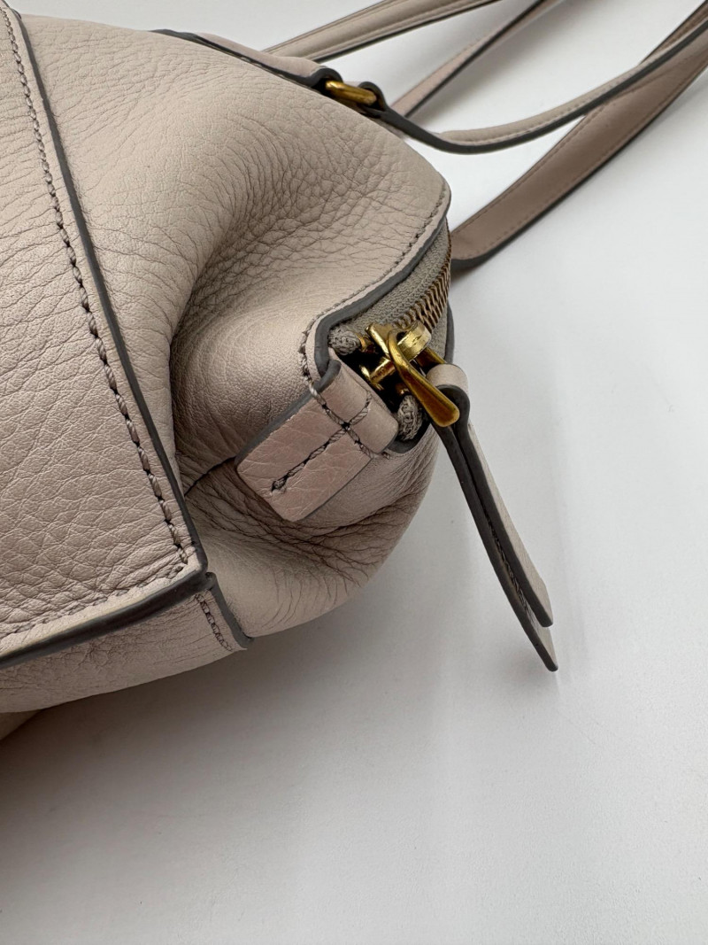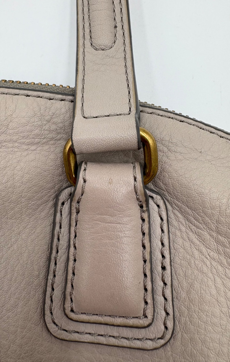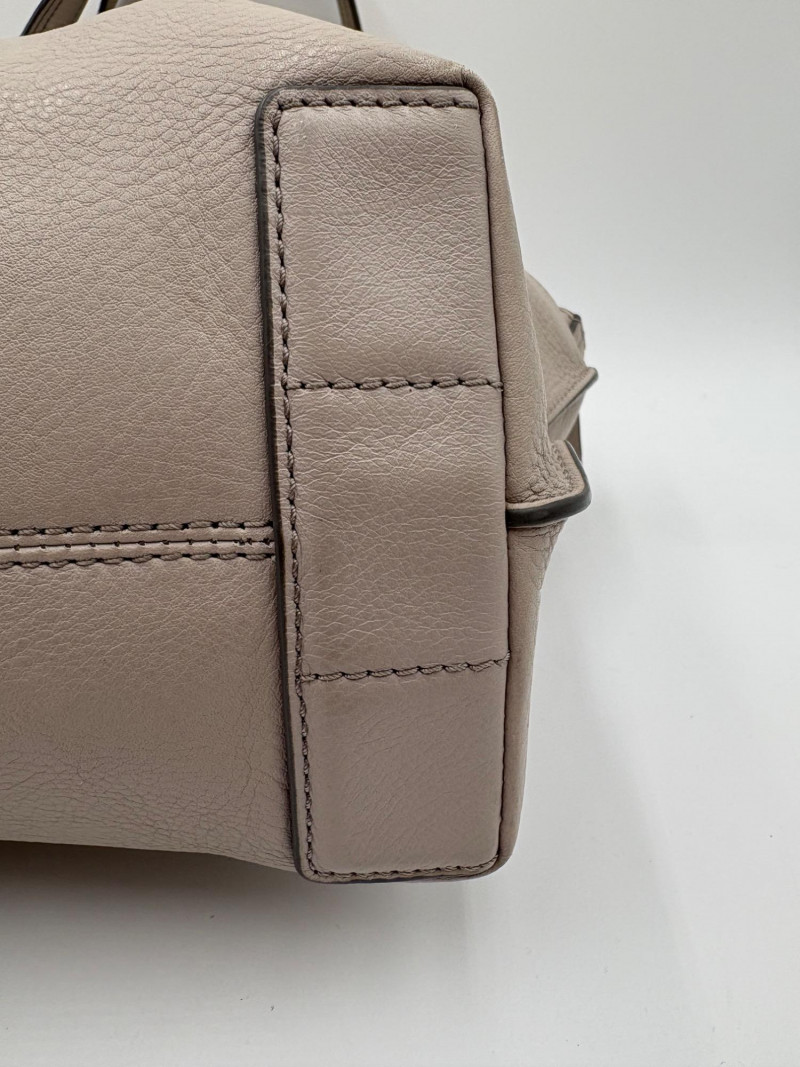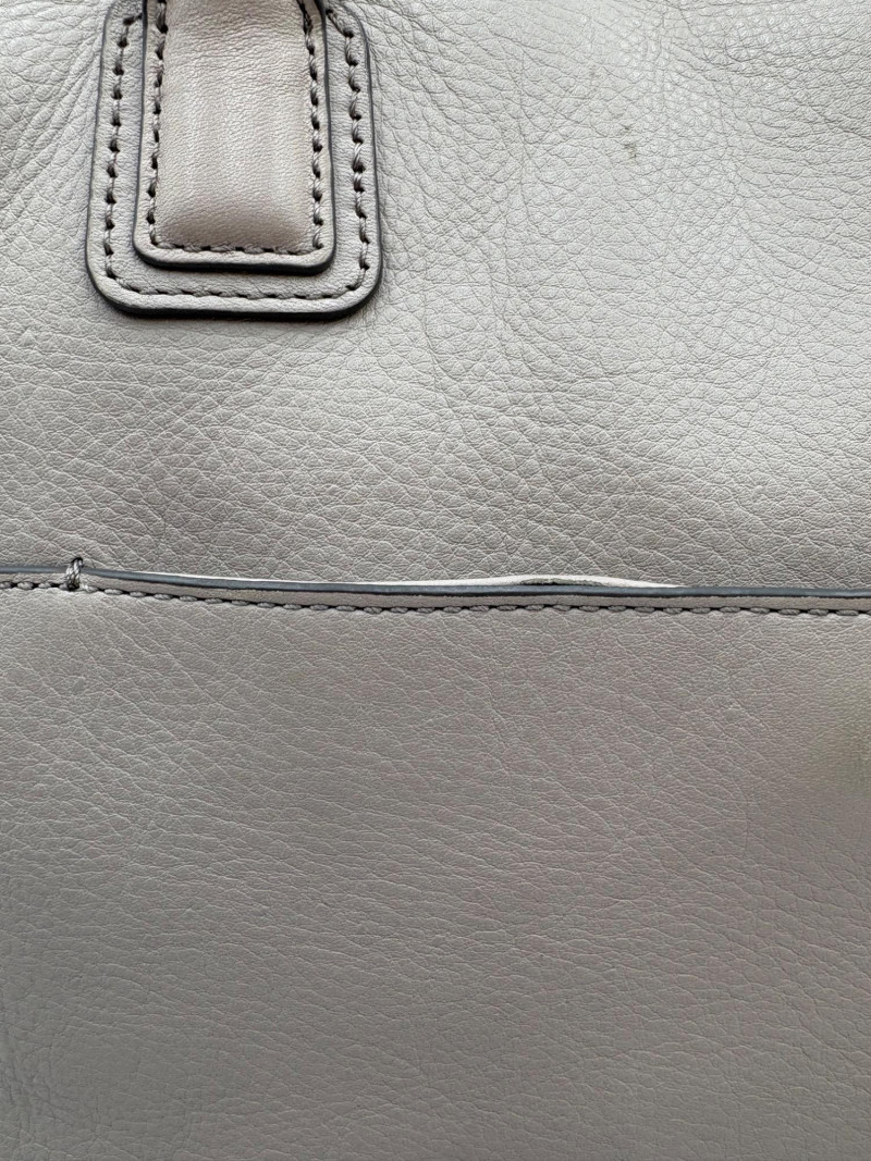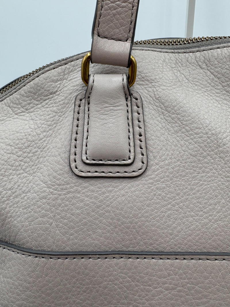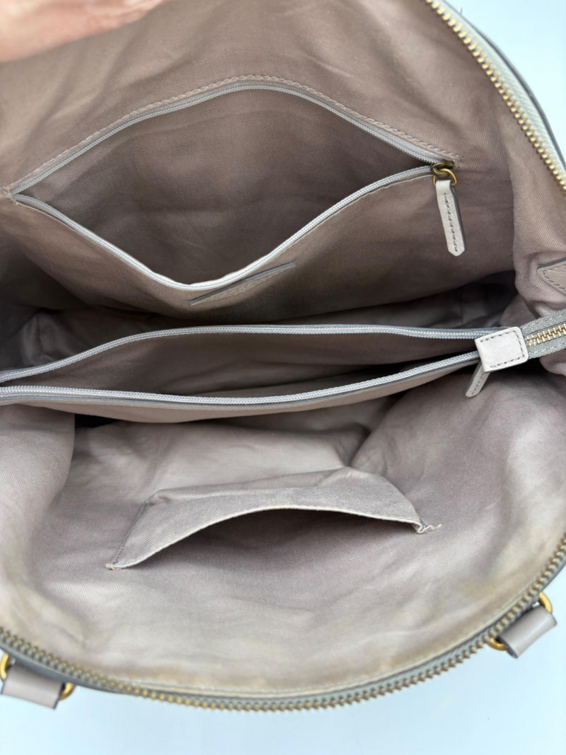 Roomy beige-grey leather purse from Fossil. Curved upper edge, squared off base, zip close top, back exterior slide pocket, and reinforced strap attachments with gold hardware. Interior has center zip compartment and two compartments on either side - one with a zipped pocket, the other with darted slide pocket. Clean and in very good used condition with a small pen mark on the inside label. Fossil label plate on exterior front. Measures 11" H x 13.5" W with a 9" drop from top of the hand straps to the top of the purse.