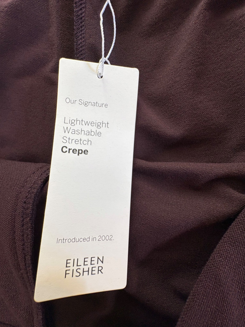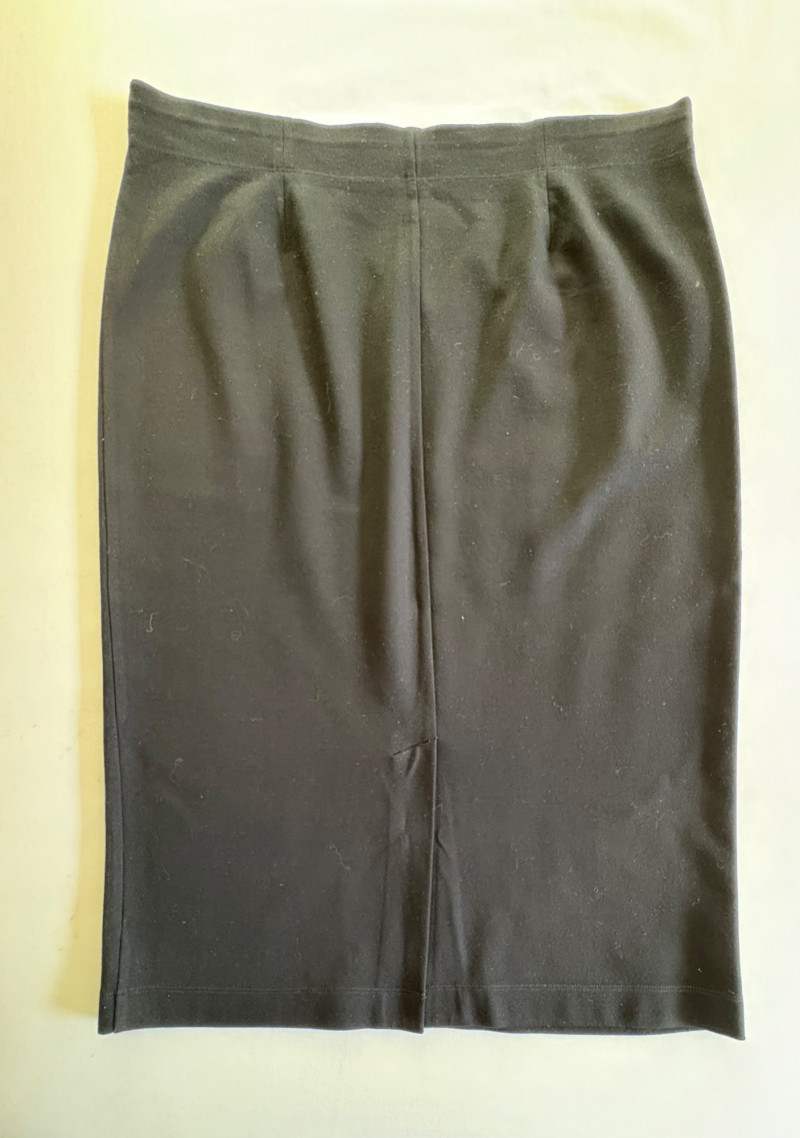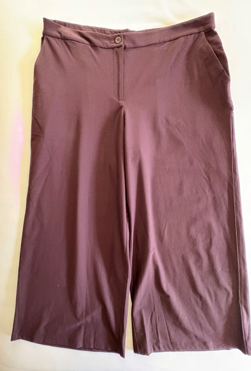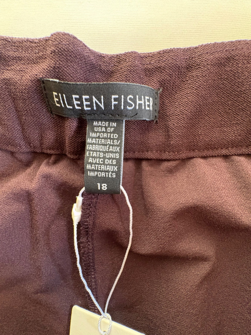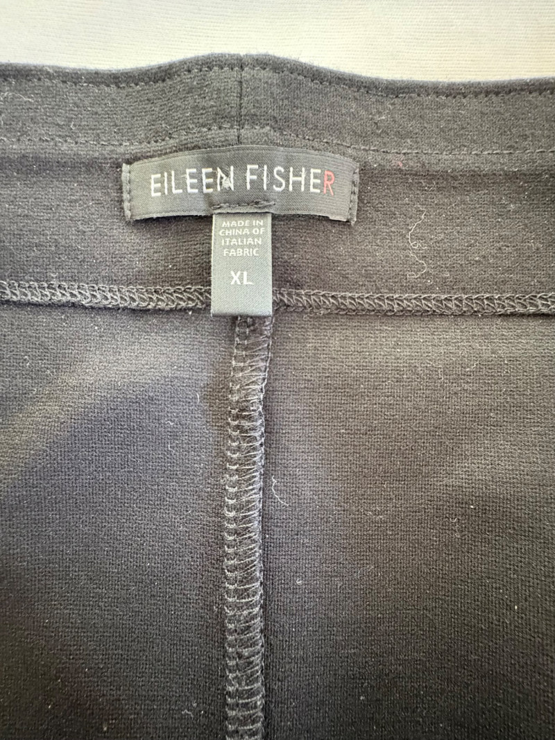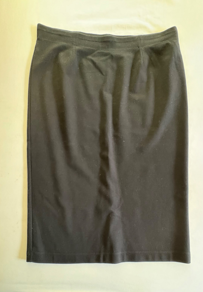 Dressy skirt and pants from Eileen Fisher Black knit skirt has straight-line styling, back kick vent, wide smooth elasticated waistband, and front/back waistline darts in extremely smooth fabric. In excellent condition. 69% viscose and 25% nylon with 6% spandex. Measures 19.5" side to side at waist and 31" from waistband to bottom back hem. Size tag says XL. Chocolate brown dress slacks have a slight reddish undertone with wide legs, flat elasticated waist band with button front zip fly closure, and set-in side front pockets in an extremely stretchy and forgiving fabric. New with tag. 66% viscose with 27% nylon and 7% spandex. Measure 19.5" side to side at waist with 27" inseam. Size tag says 18.