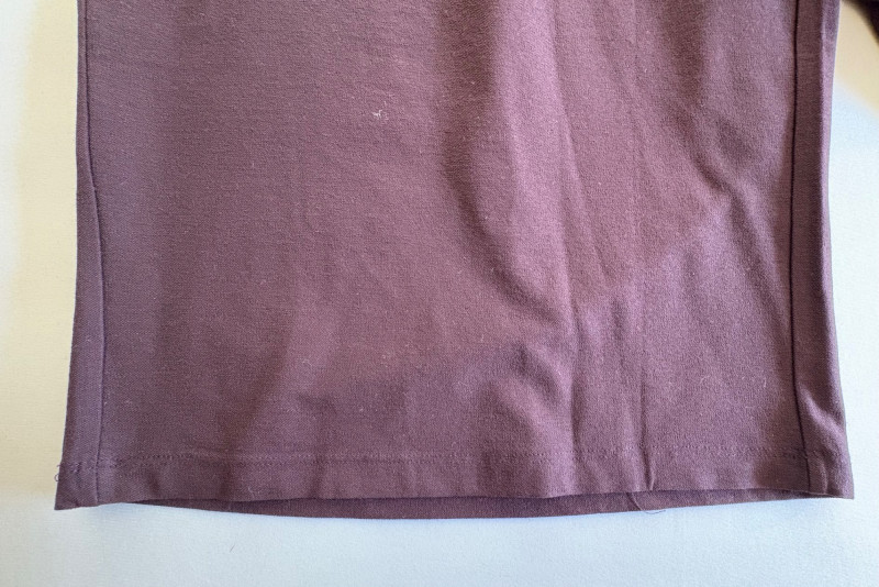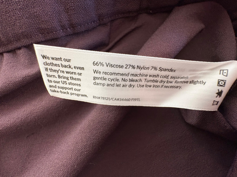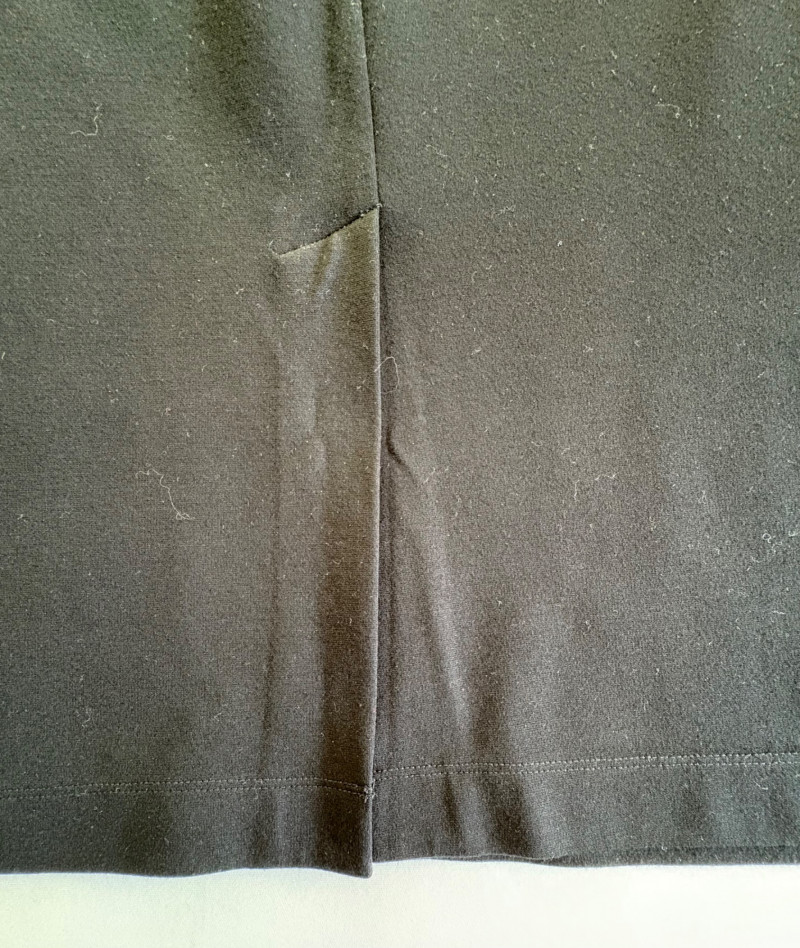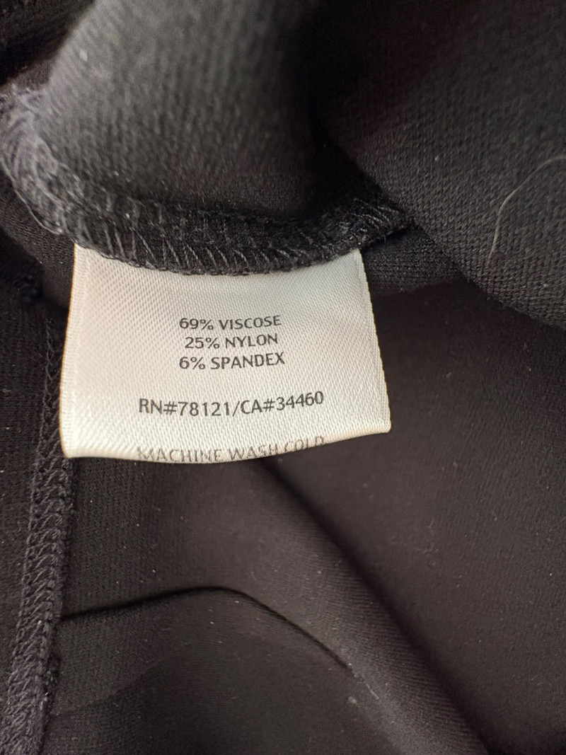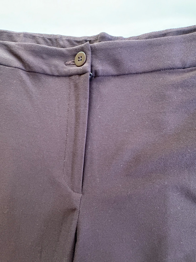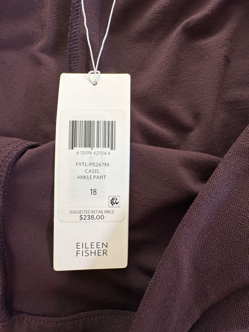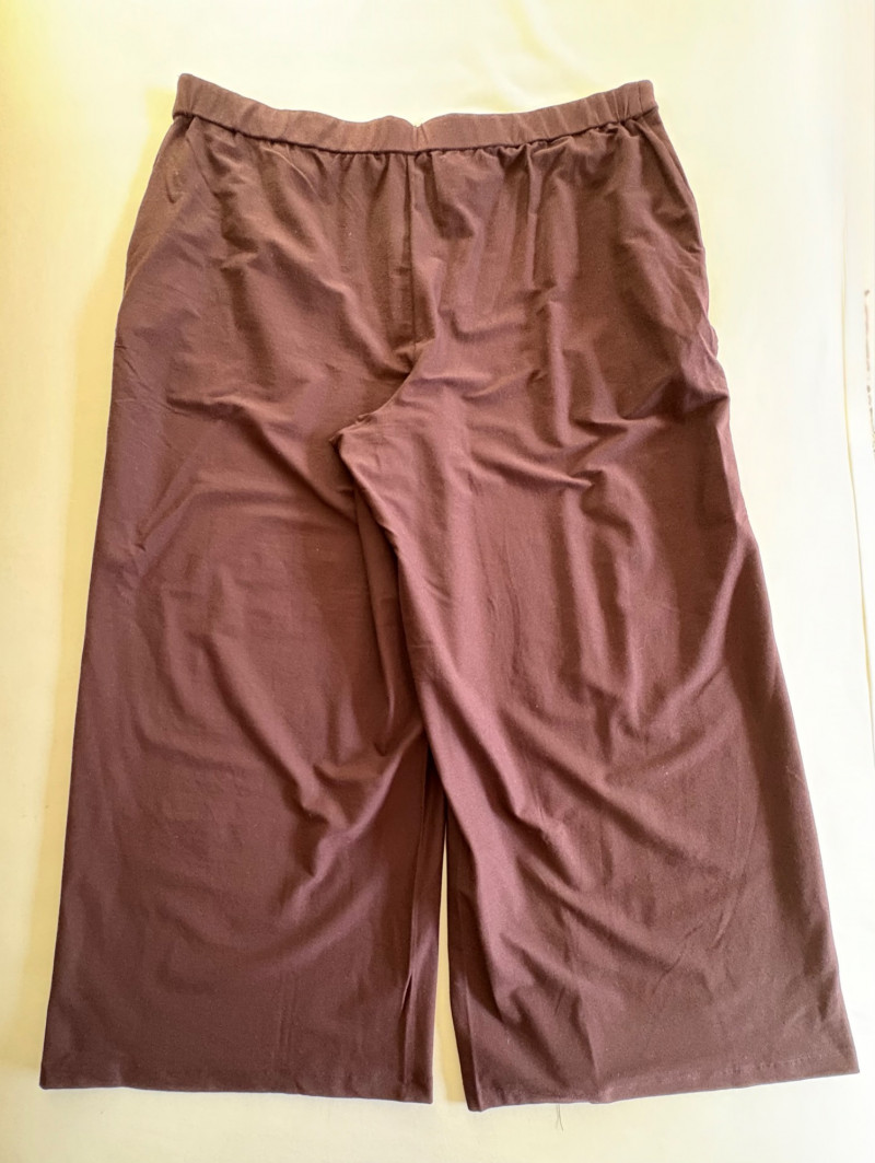 Dressy skirt and pants from Eileen Fisher Black knit skirt has straight-line styling, back kick vent, wide smooth elasticated waistband, and front/back waistline darts in extremely smooth fabric. In excellent condition. 69% viscose and 25% nylon with 6% spandex. Measures 19.5" side to side at waist and 31" from waistband to bottom back hem. Size tag says XL. Chocolate brown dress slacks have a slight reddish undertone with wide legs, flat elasticated waist band with button front zip fly closure, and set-in side front pockets in an extremely stretchy and forgiving fabric. New with tag. 66% viscose with 27% nylon and 7% spandex. Measure 19.5" side to side at waist with 27" inseam. Size tag says 18.